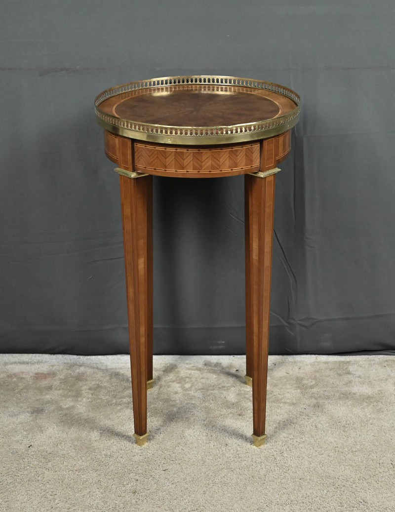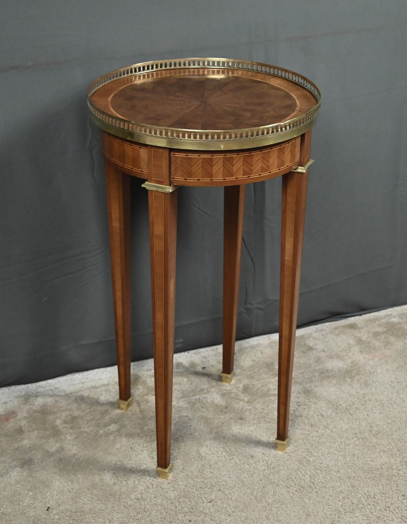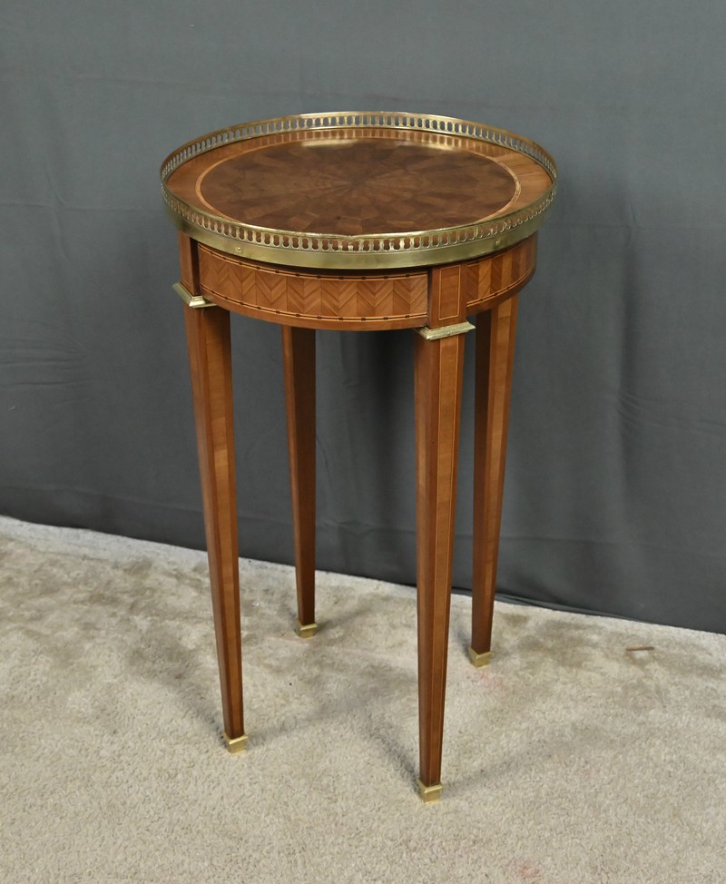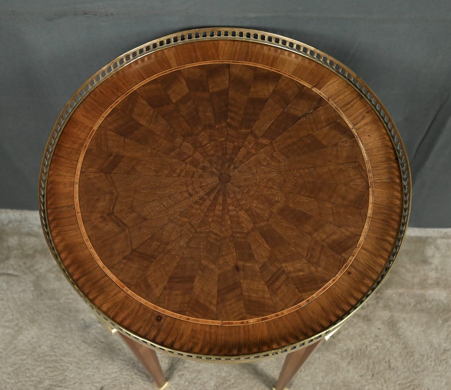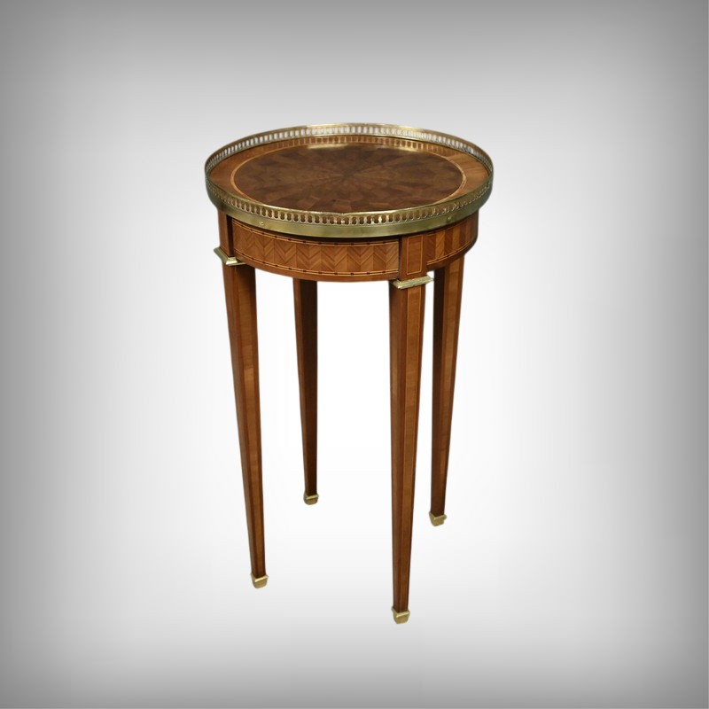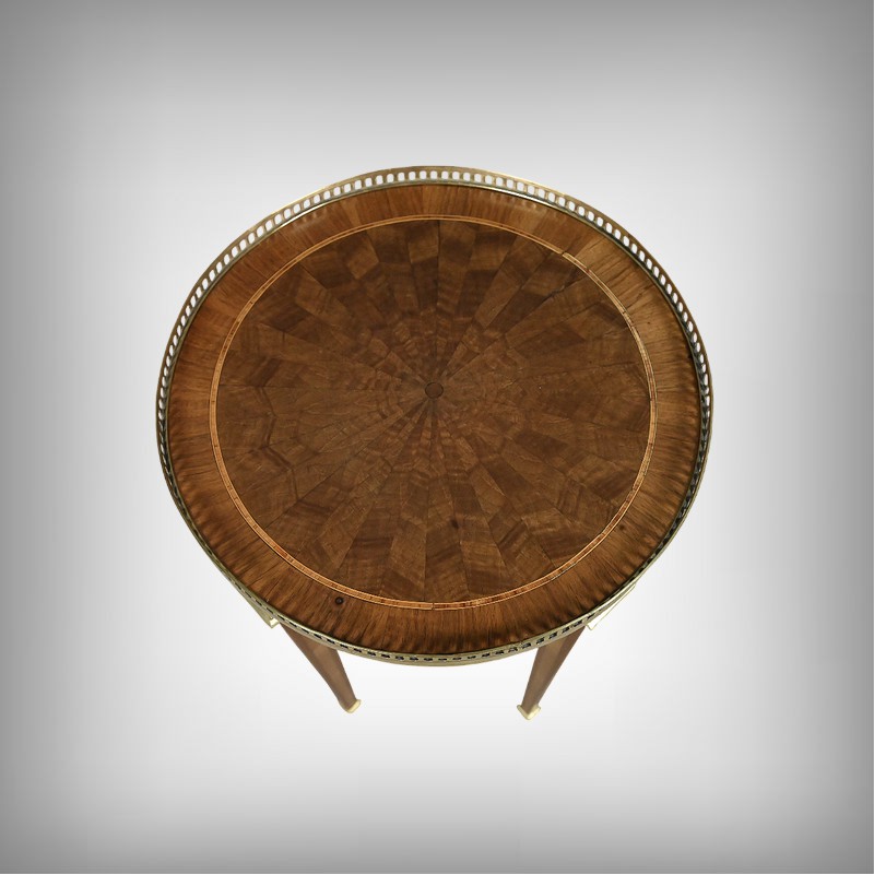 Ce délicat guéridon de style Louis XVI séduit par l’harmonie de ses proportions et la richesse de ses détails. Le plateau circulaire, soigneusement marqueté en placage d’acajou et de noyer, présente un jeu géométrique subtil qui témoigne d’un savoir-faire raffiné. Ce motif rayonnant en étoile est ceinturé d’une élégante galerie ajourée en laiton, dans l’esprit des tables bouillottes, soulignant son caractère néoclassique à la fois décoratif et fonctionnel.