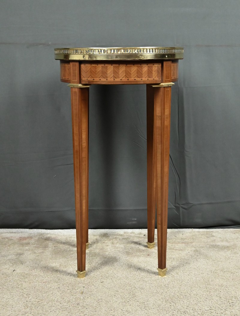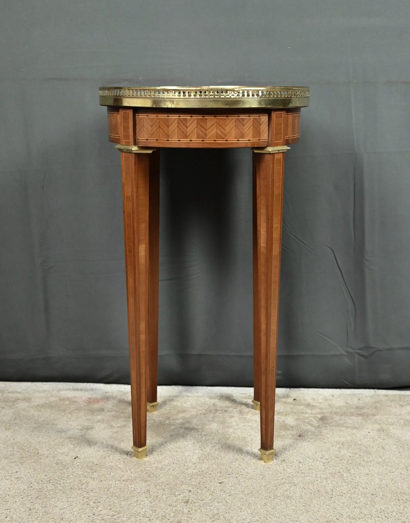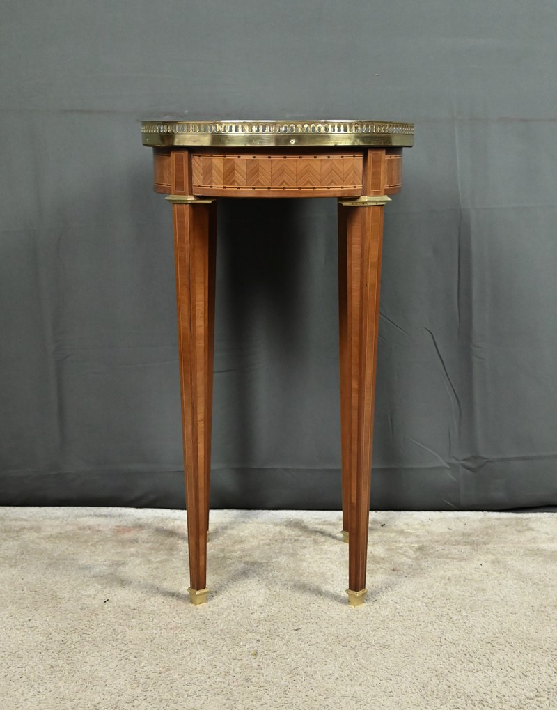 Ce plateau repose sur une ceinture finement plaquée, animée d’un motif à chevrons, tandis que les quatre pieds gaines, typiques du style Louis XVI, sont rehaussés de collerettes et terminés par des sabots en laiton, conférant à l’ensemble une allure noble et équilibrée.