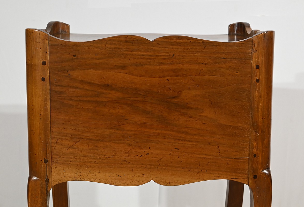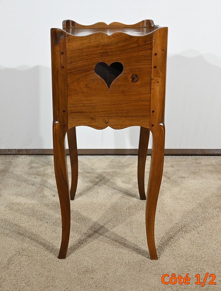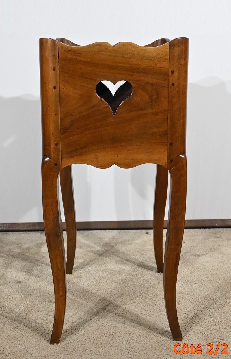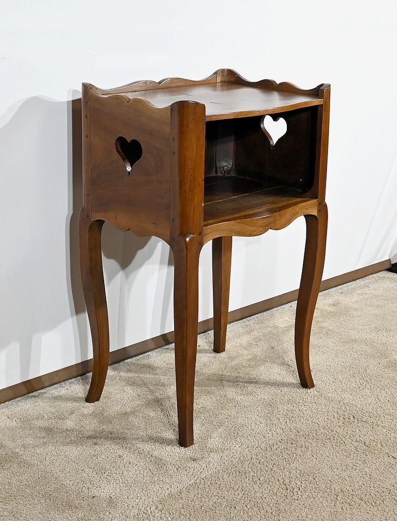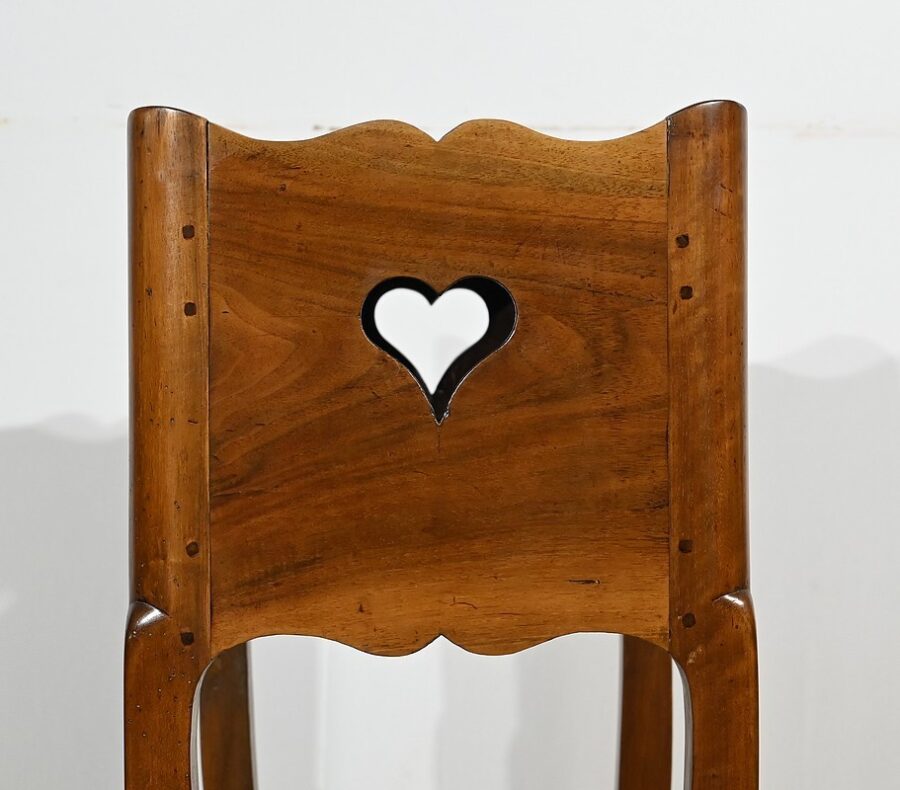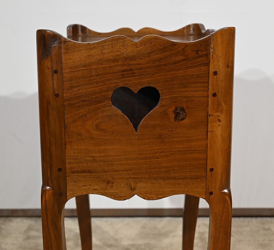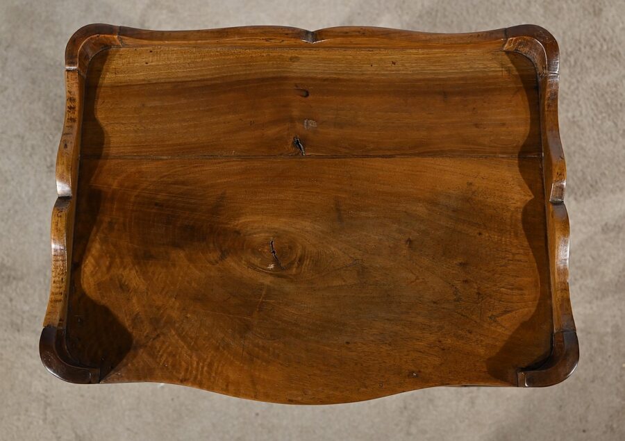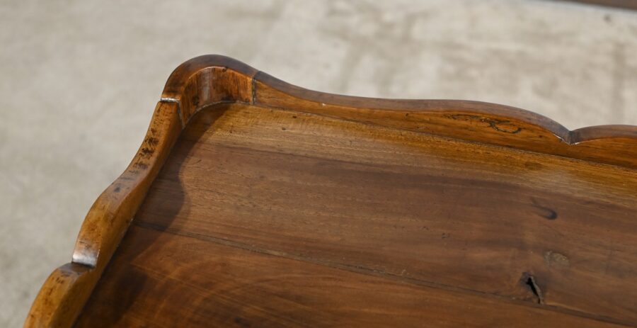 Petite table à en-cas dotée d’un caisson formant une niche reposant sur quatre pieds aux angles arrondis à bosse et à galbe . La traverse de la façade est légèrement galbée et à découpe, s’enroulant avec la ligne des pieds. Les côtés de ce meuble sont ajourés d’un grand cœur et possèdent un dessus à découpe Ces hauts débordants possèdent des angles plus proéminents.