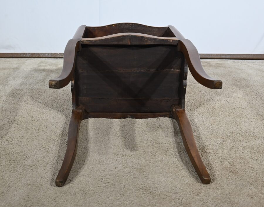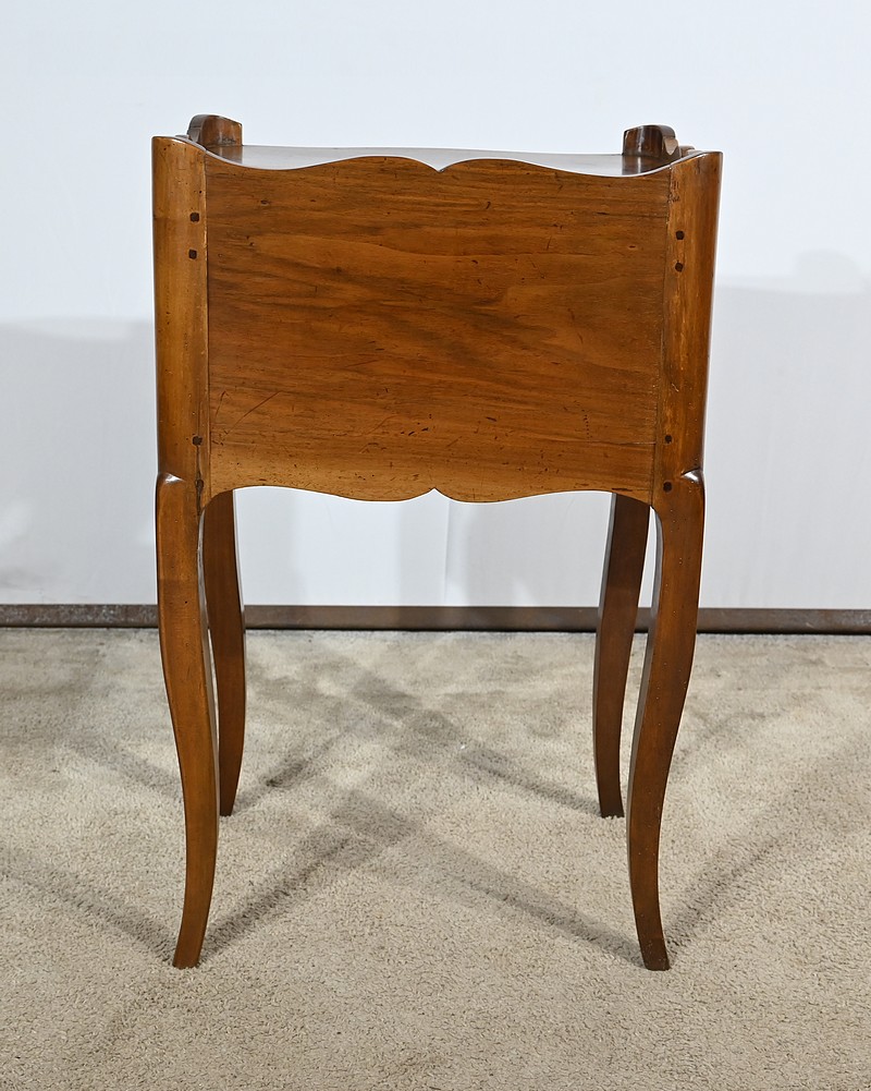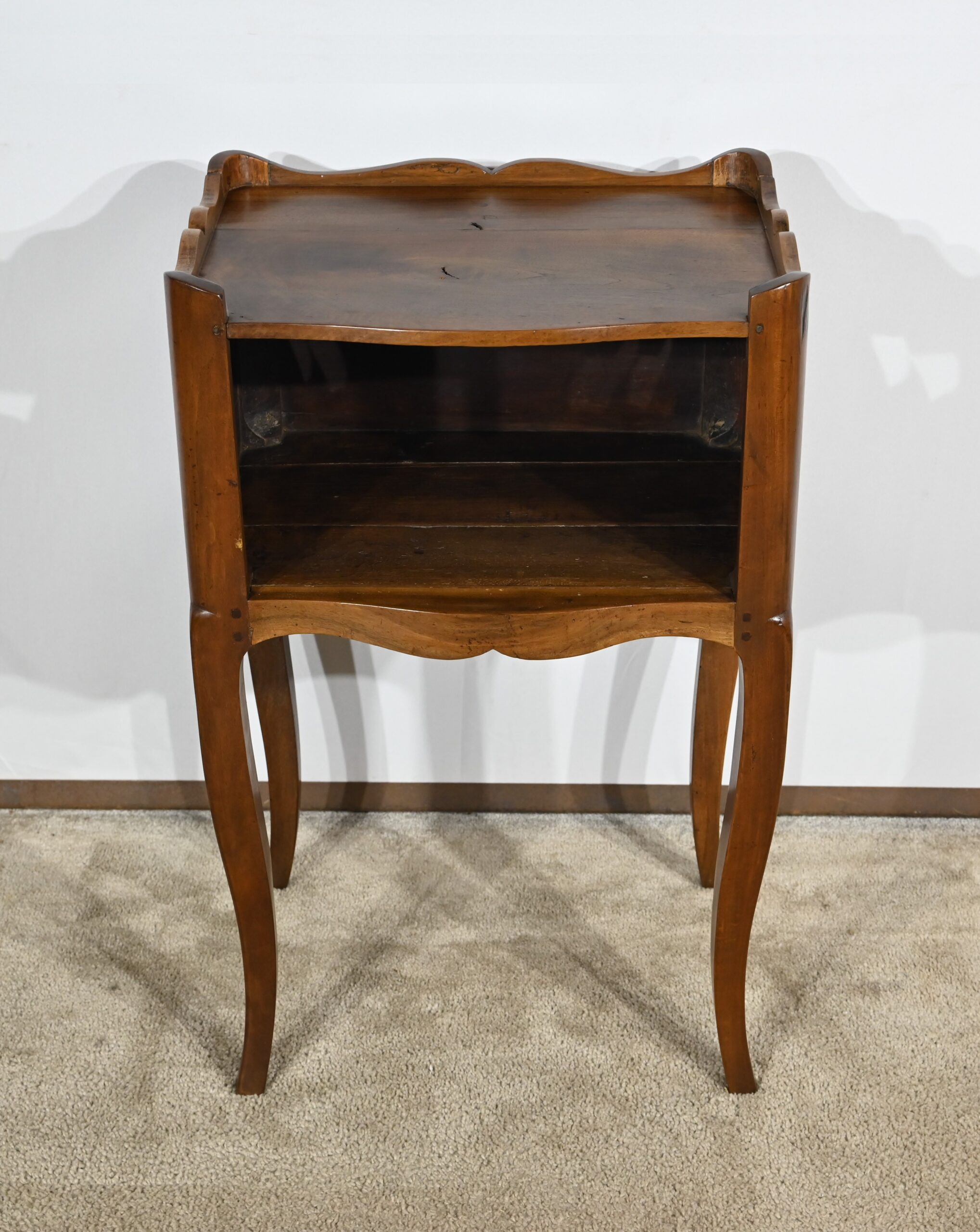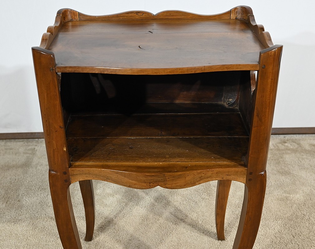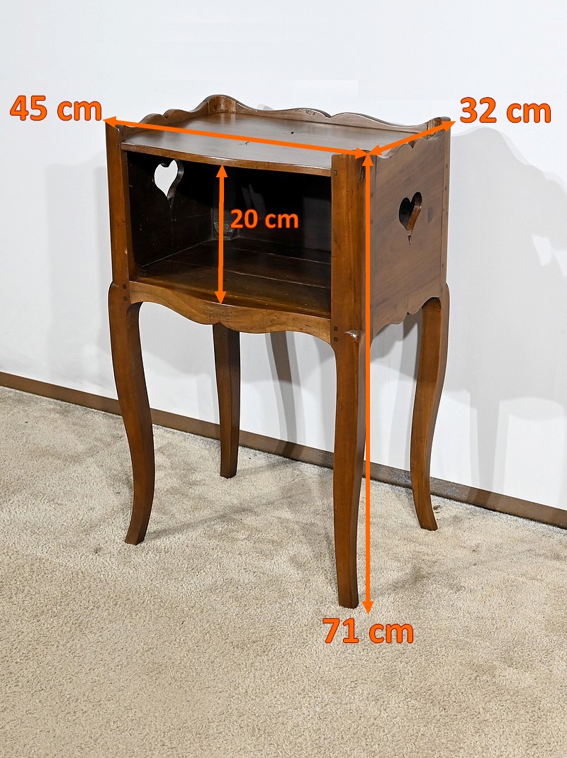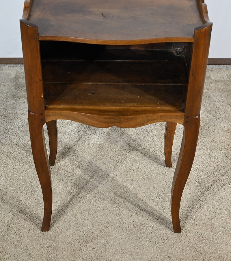 Petite table à en-cas dotée d’un caisson formant une niche reposant sur quatre pieds aux angles arrondis à bosse et à galbe . La traverse de la façade est légèrement galbée et à découpe, s’enroulant avec la ligne des pieds. Les côtés de ce meuble sont ajourés d’un grand cœur et possèdent un dessus à découpe Ces hauts débordants possèdent des angles plus proéminents.