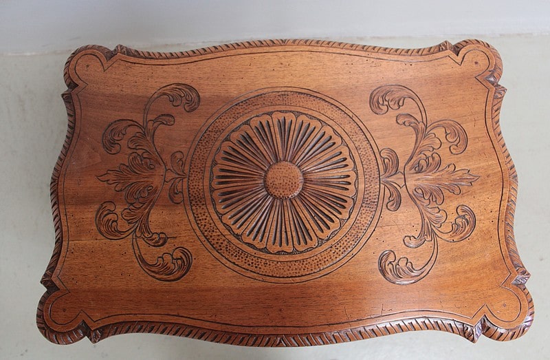 Petite table basse en noyer chantourné. Décor de rinceaux et de rosace sur le dessus.