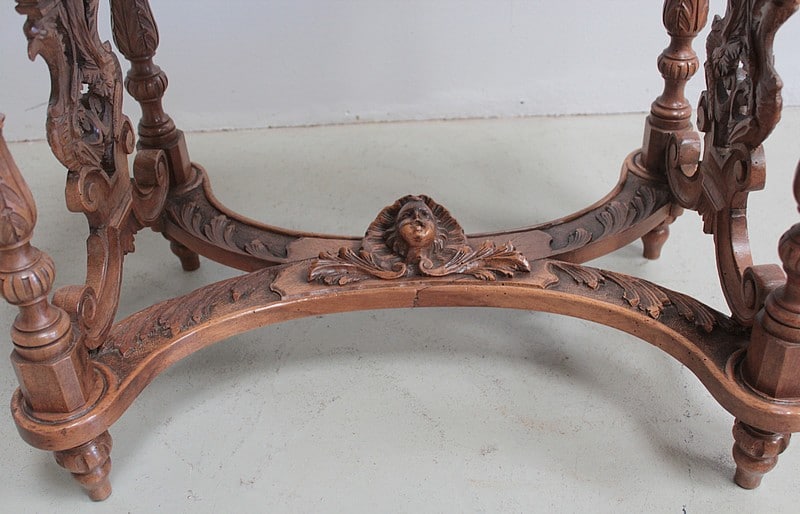 Elle repose sur 4 pieds tournés et sculptés reliés par une entretoise en X également sculptée d’acanthe et d’un mascaron.