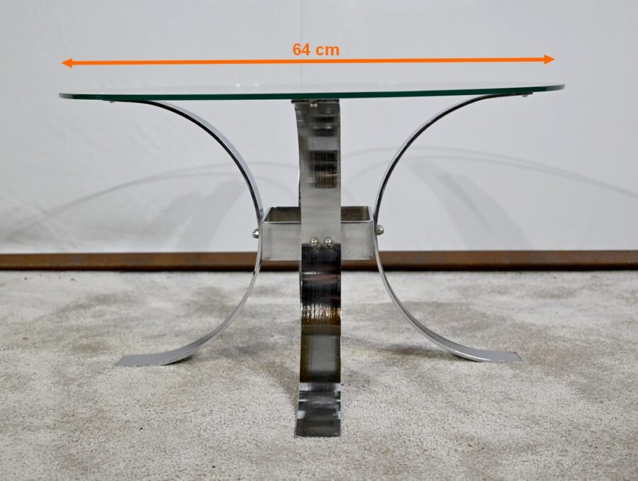 Cette petite table présente un plateau circulaire en verre d’une épaisseur de 0,6 cm. Celui-ci est ventousé sur quatre pieds courbés, en métal chromé, boulonnés au centre à un élément carré.