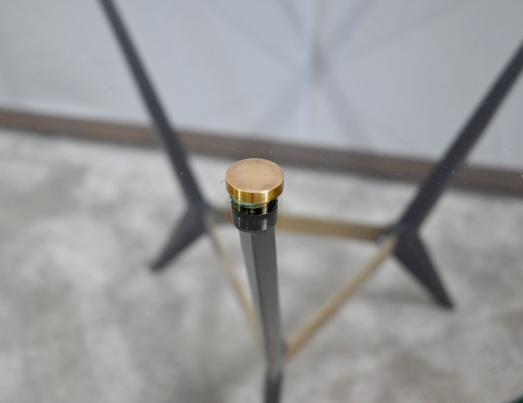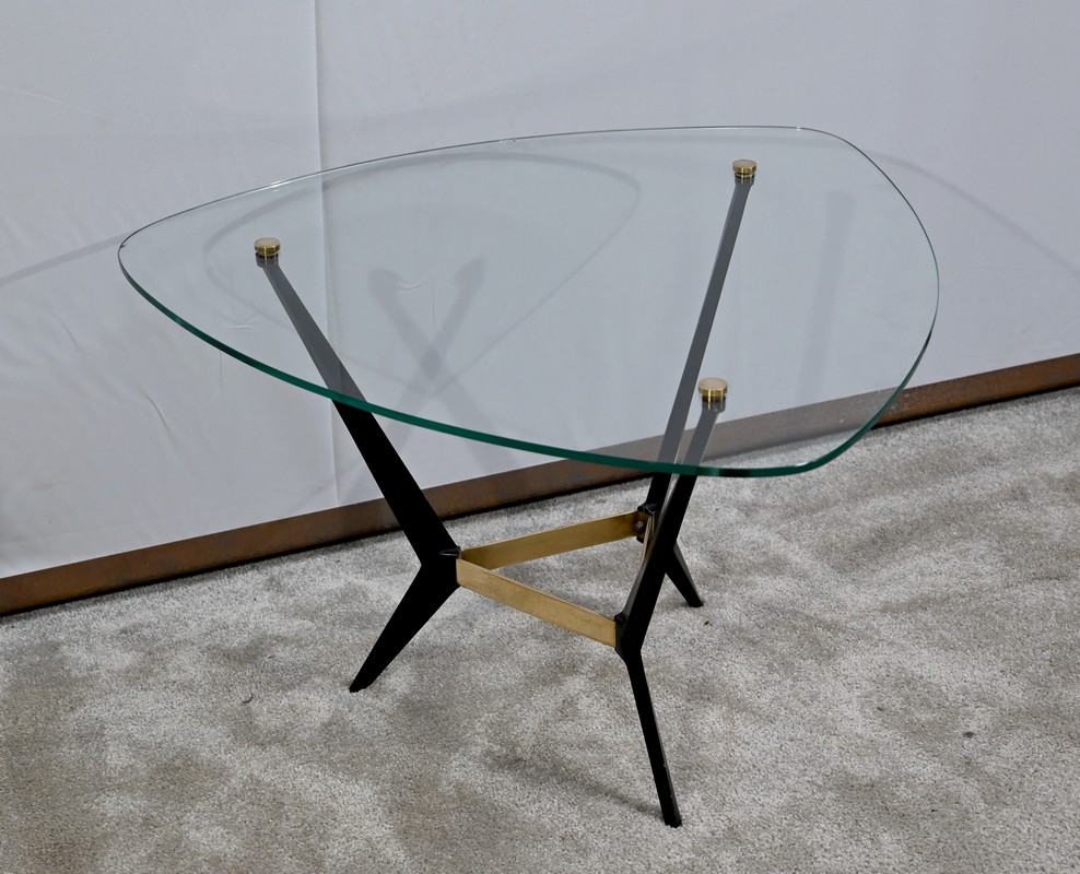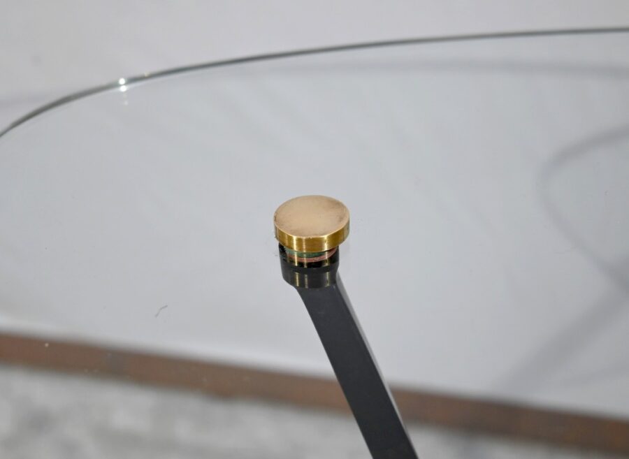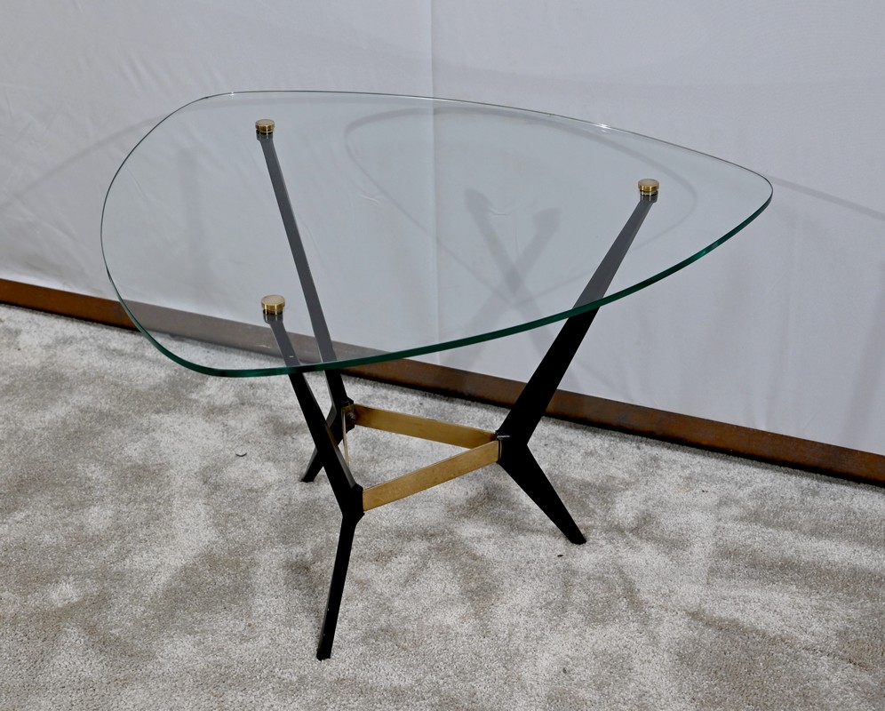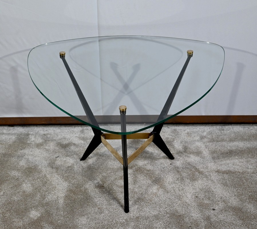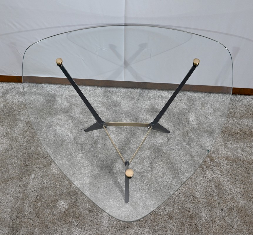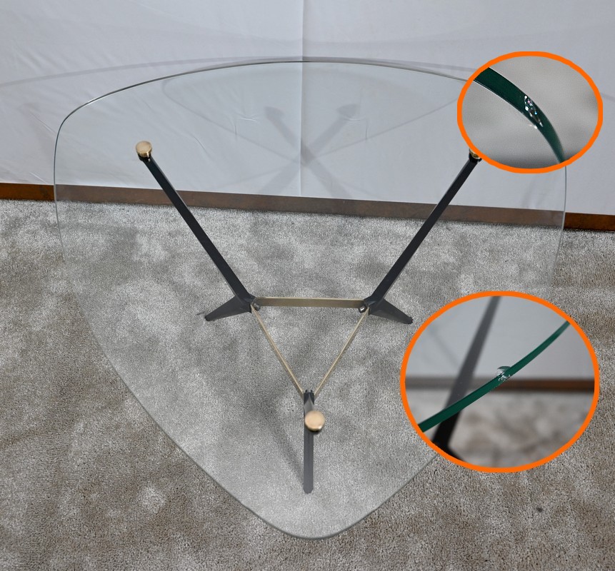 Petite table présentant un dessus subtriangulaire en verre de 6 millimètres d’épaisseur.