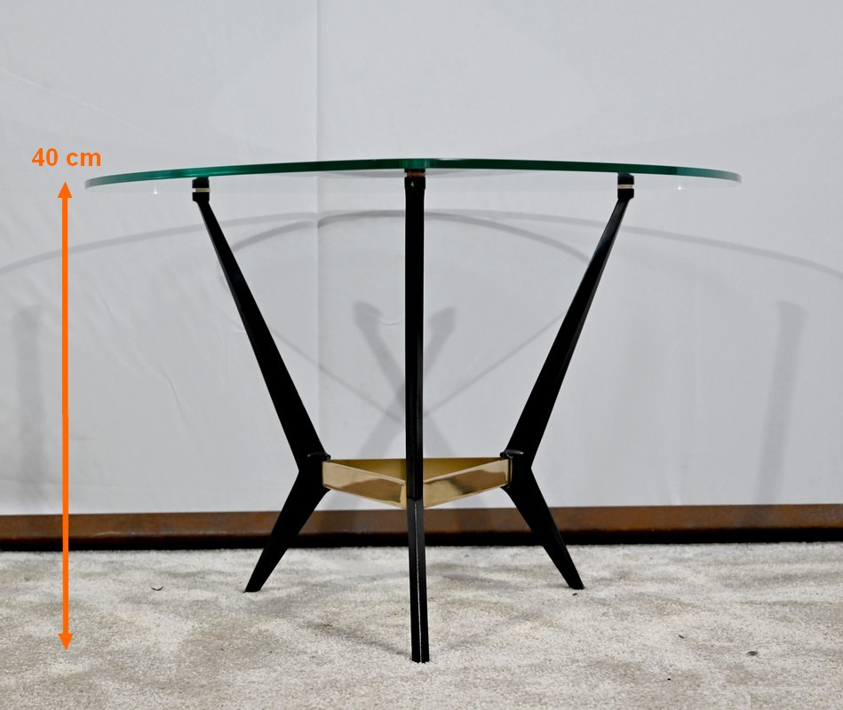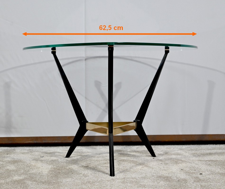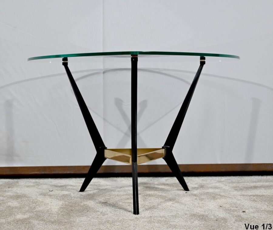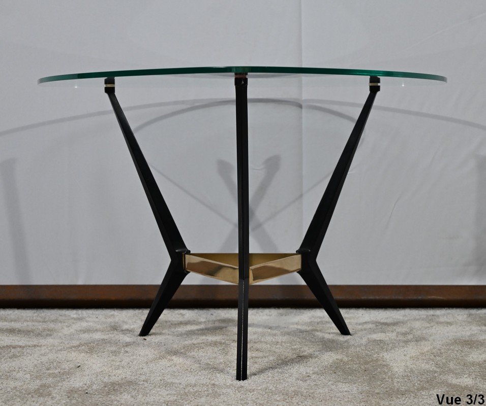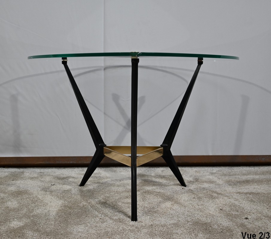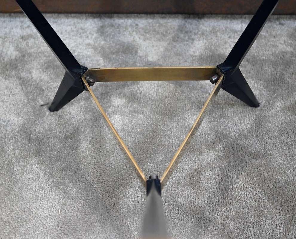 Petite table présentant un dessus subtriangulaire en verre de 6 millimètres d’épaisseur.