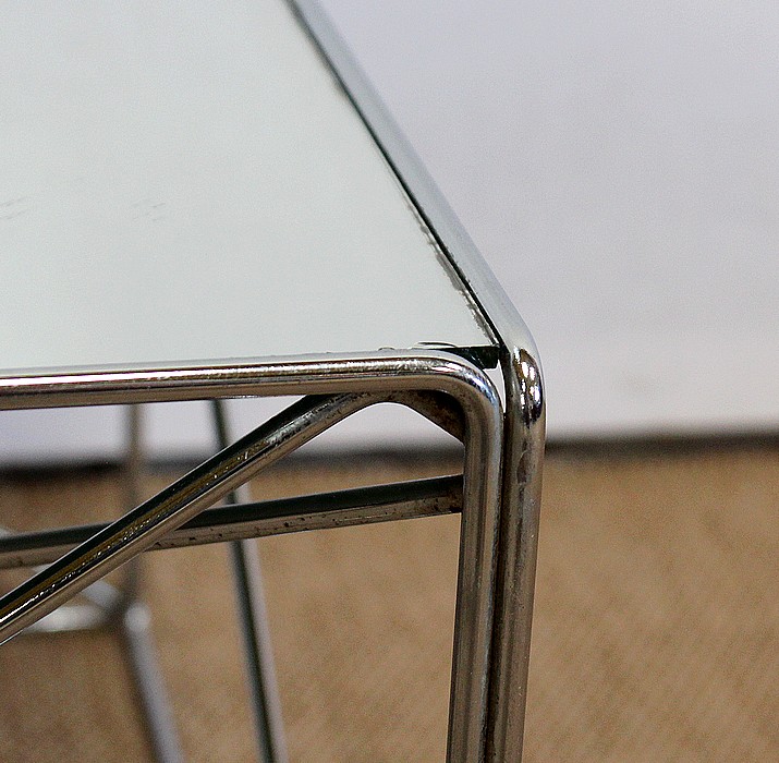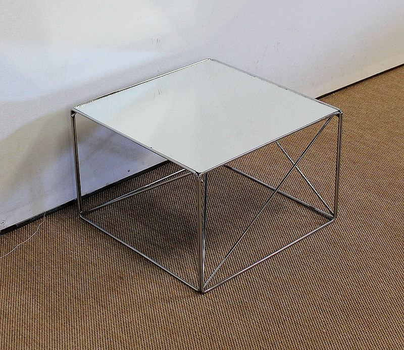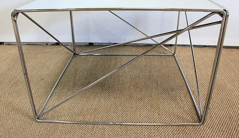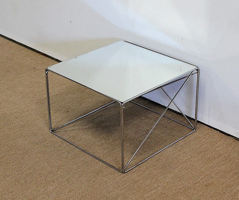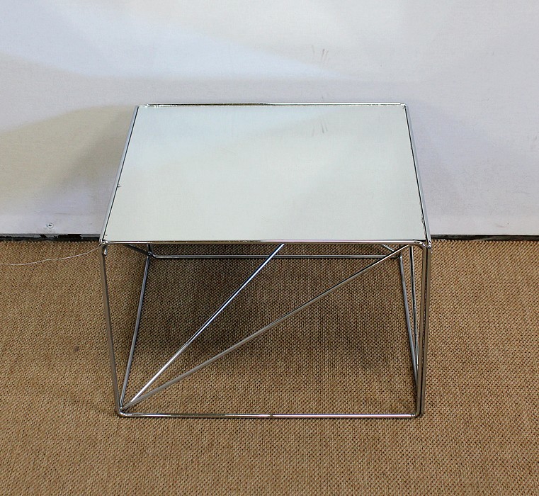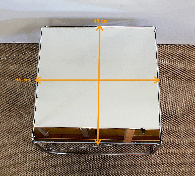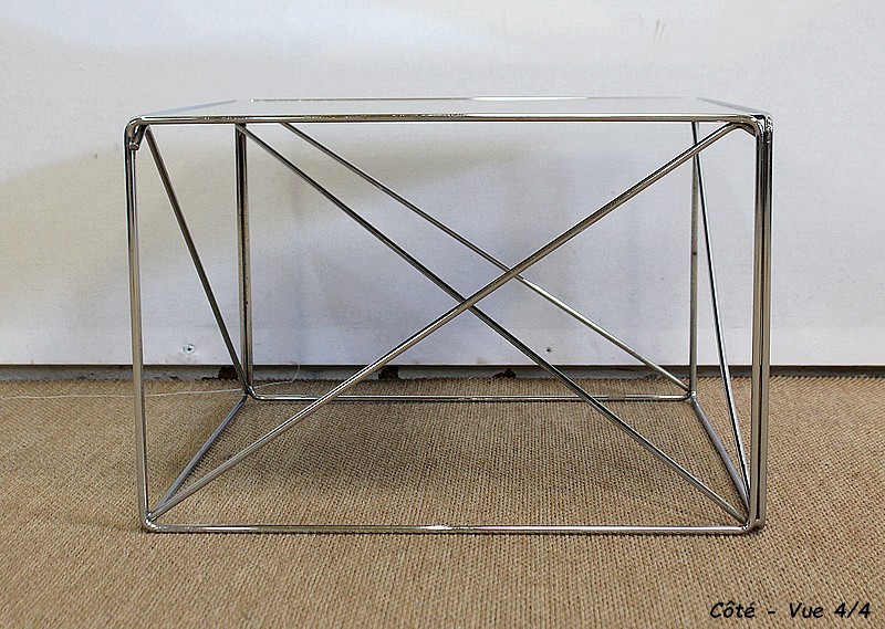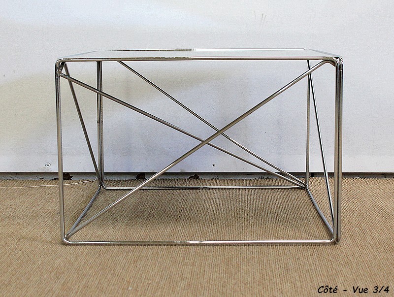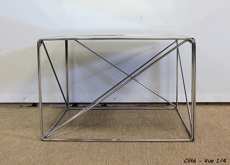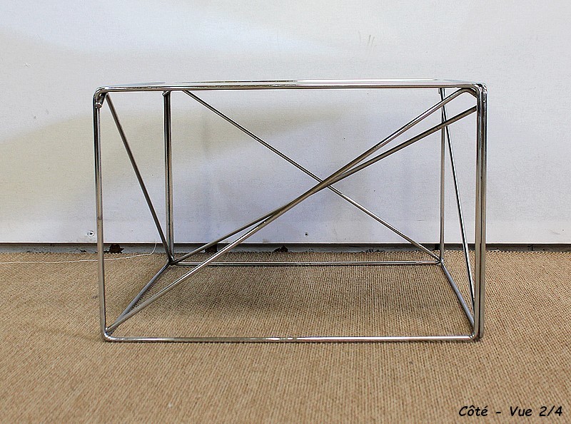 Cette table basse « made in France » présente une structure parallélépipédique de section carré, formée d’une ossature tubulaire réalisée en métal chromé et dessinant des triangles Isocèles.
