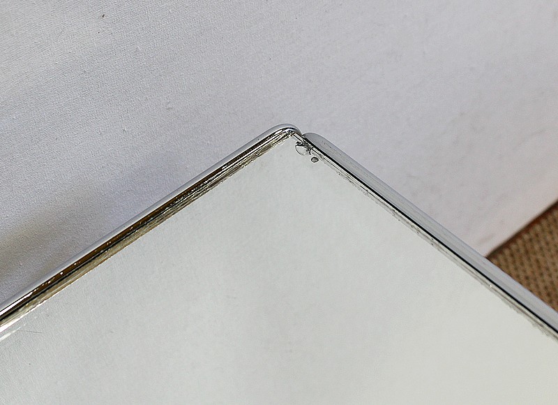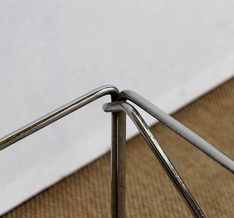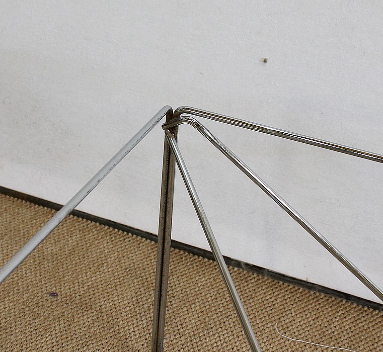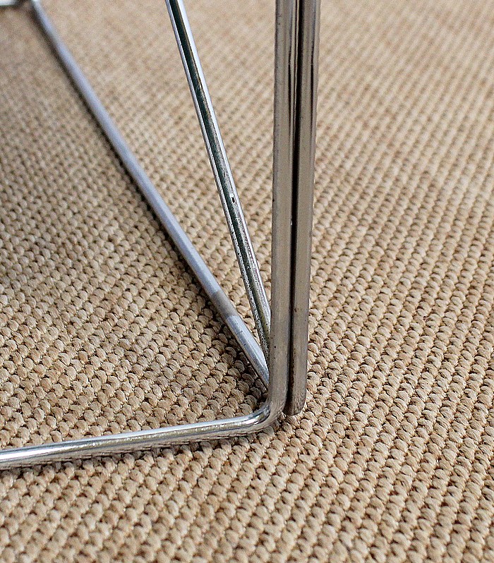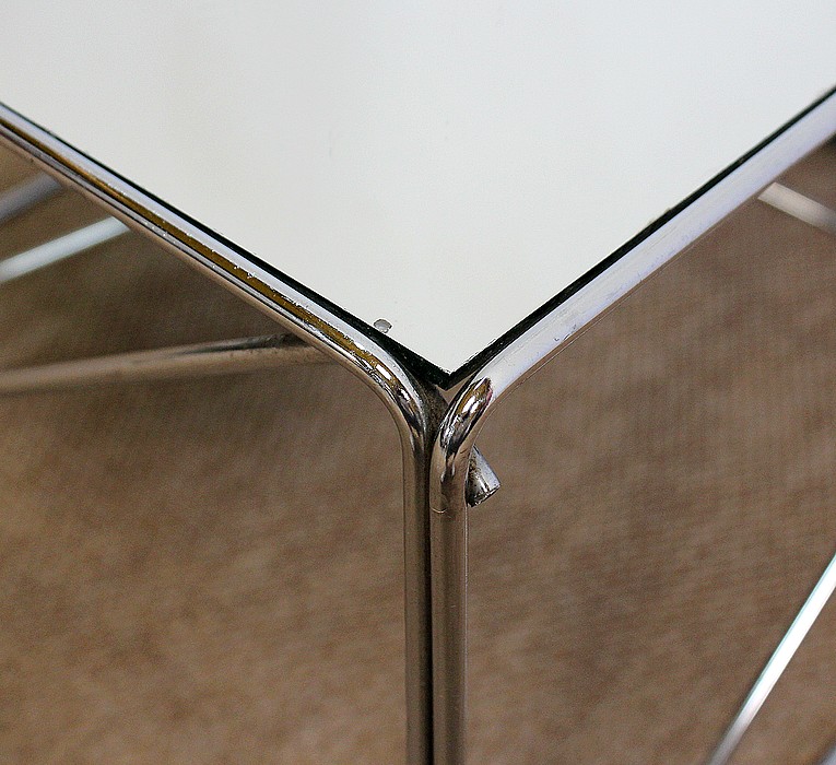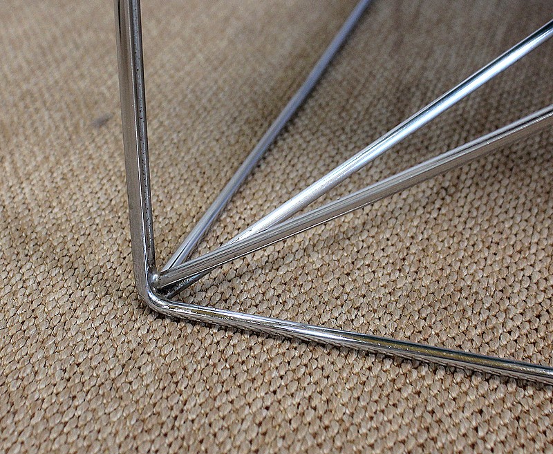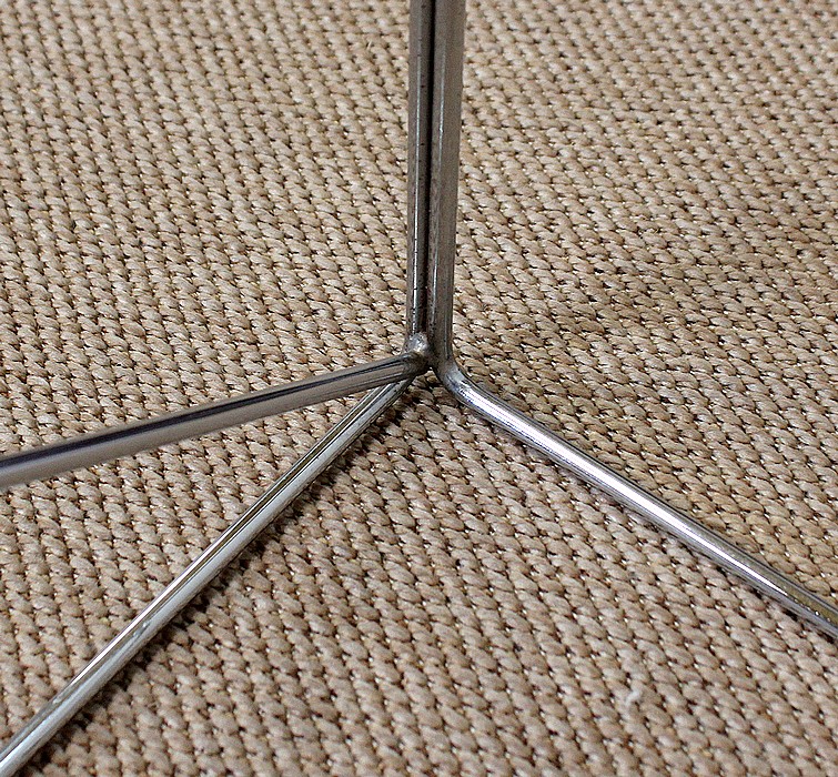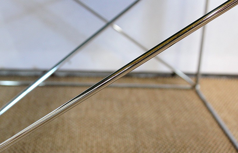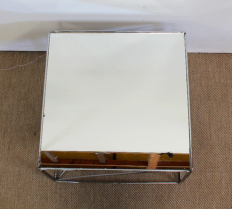 Cette table basse « made in France » présente une structure parallélépipédique de section carré, formée d’une ossature tubulaire réalisée en métal chromé et dessinant des triangles Isocèles.