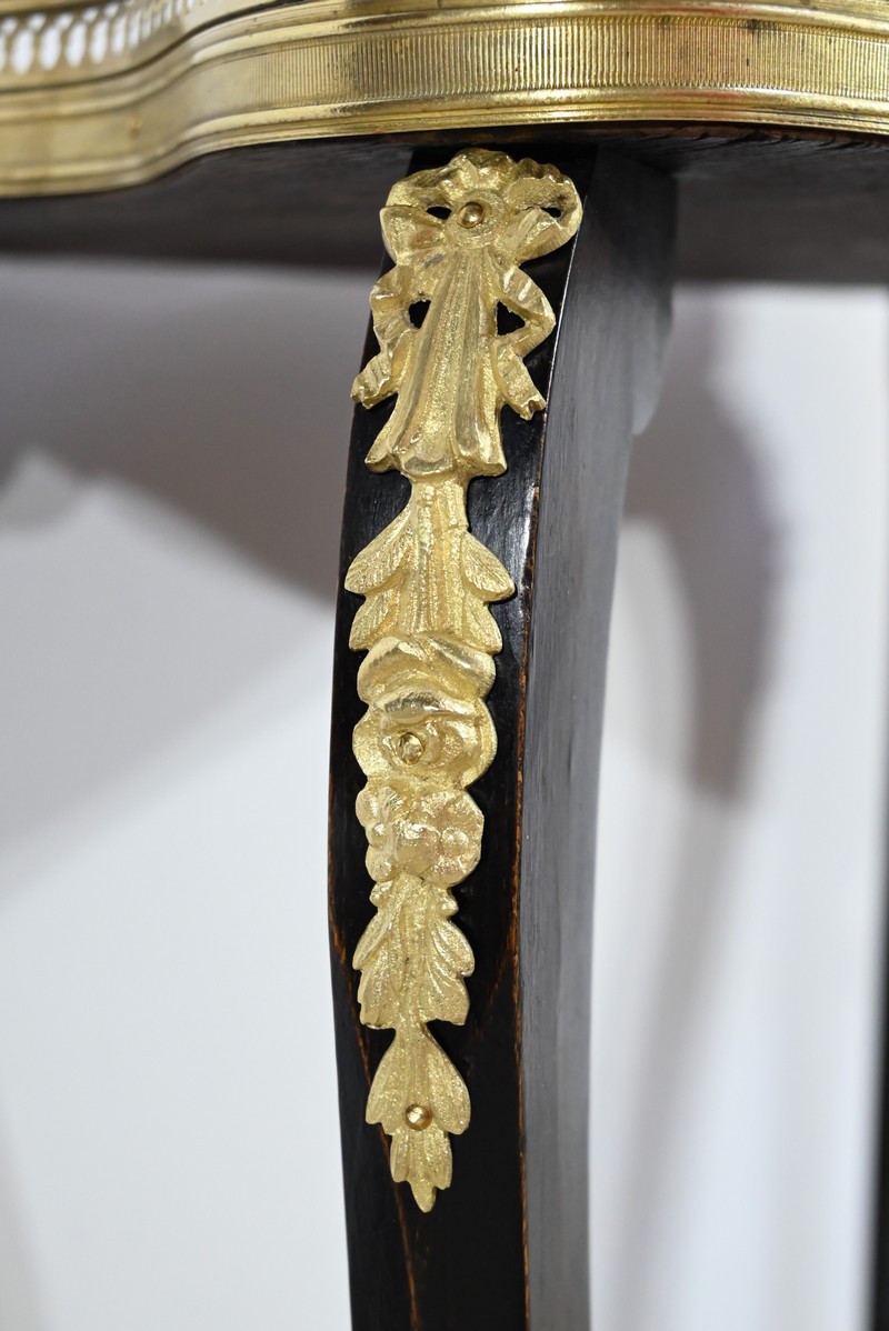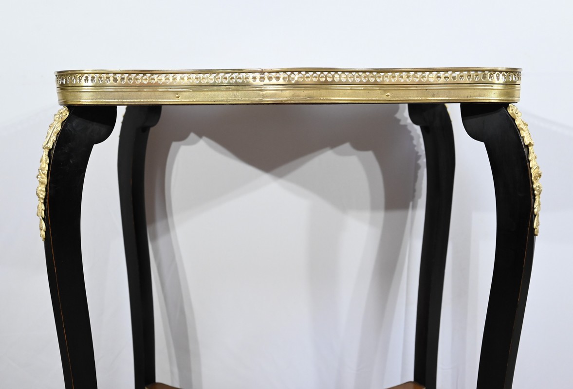 La tablette d’entretoise, aux côtés concaves, est habillée de baguettes laiton à motifs de draperie.