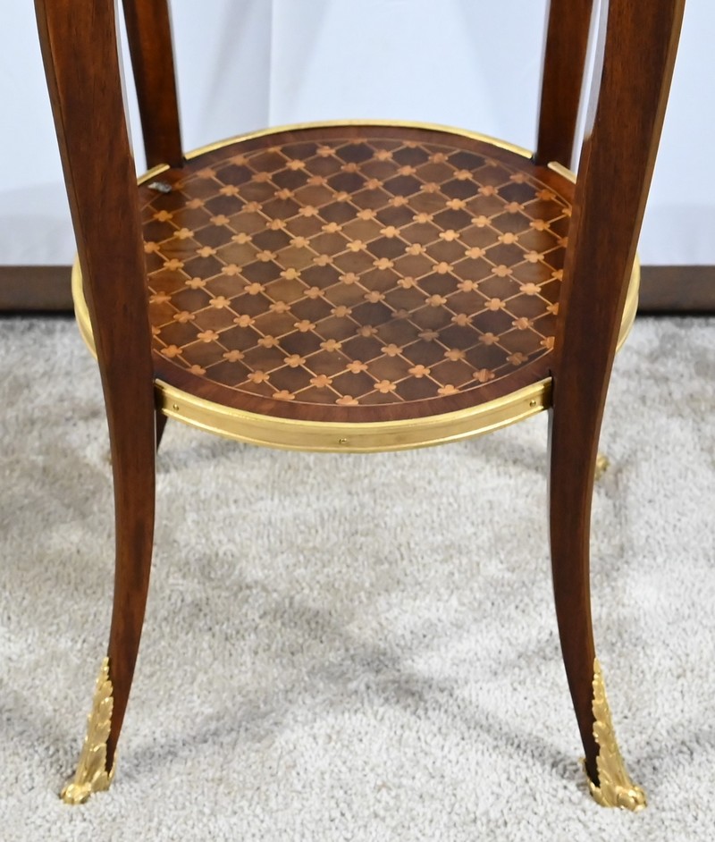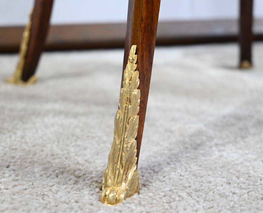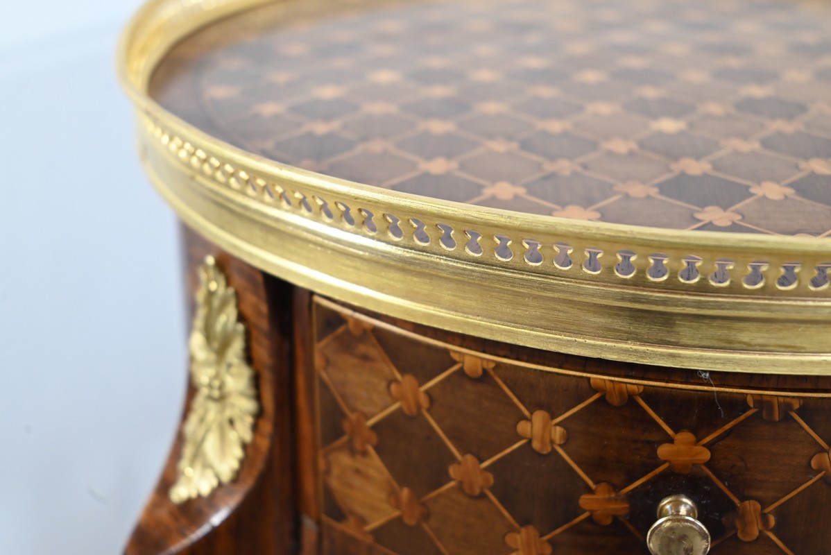 Le dessus, ceint d’une galerie ajourée et ciselée en laiton, offre une marqueterie similaire.