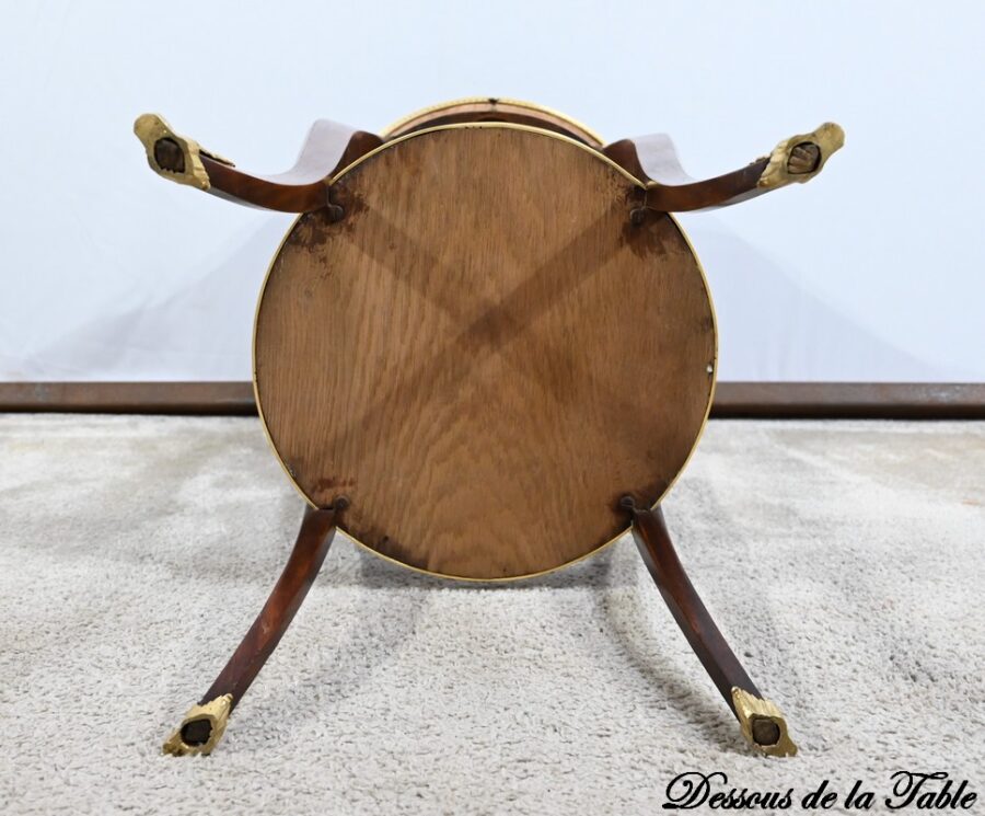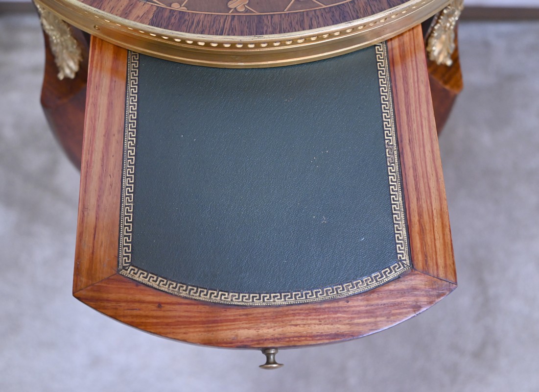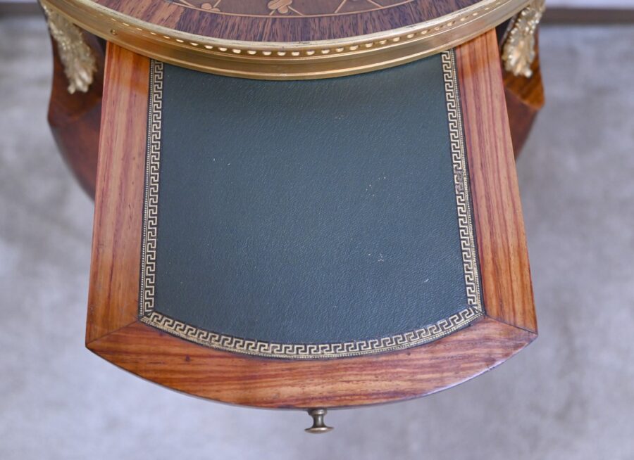 Table circulaire comportant en ceinture un tiroir à bouton laiton marqueté de losanges, de filets et de trèfles en placage de bois de rose et d’acajou.