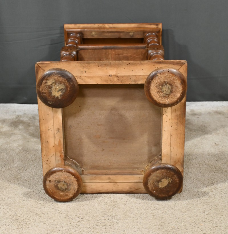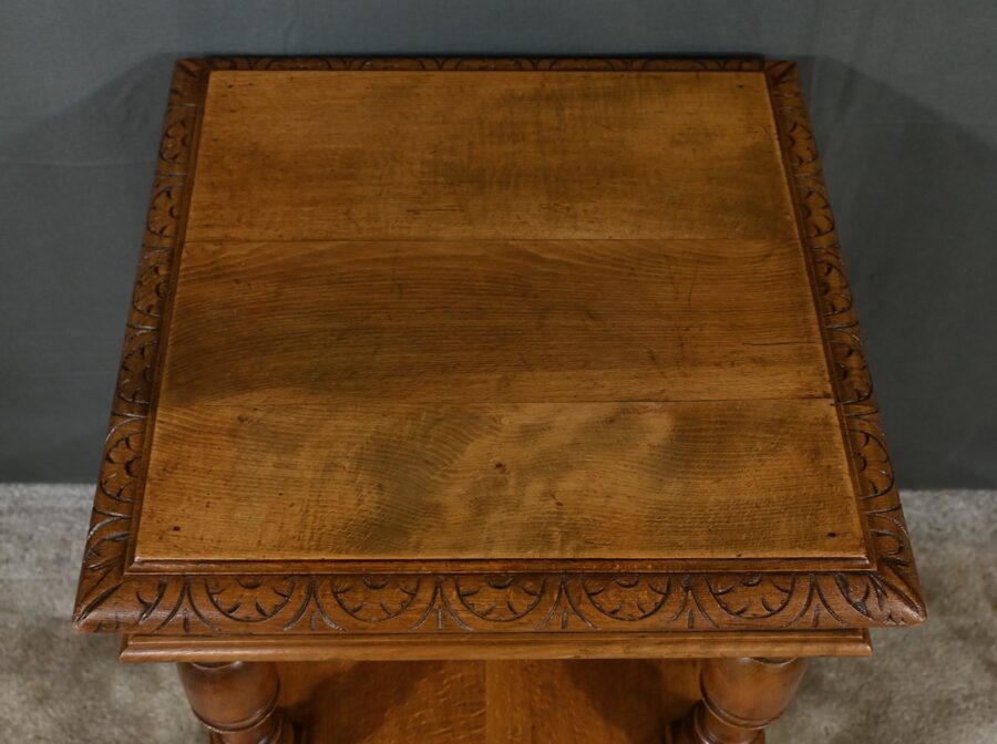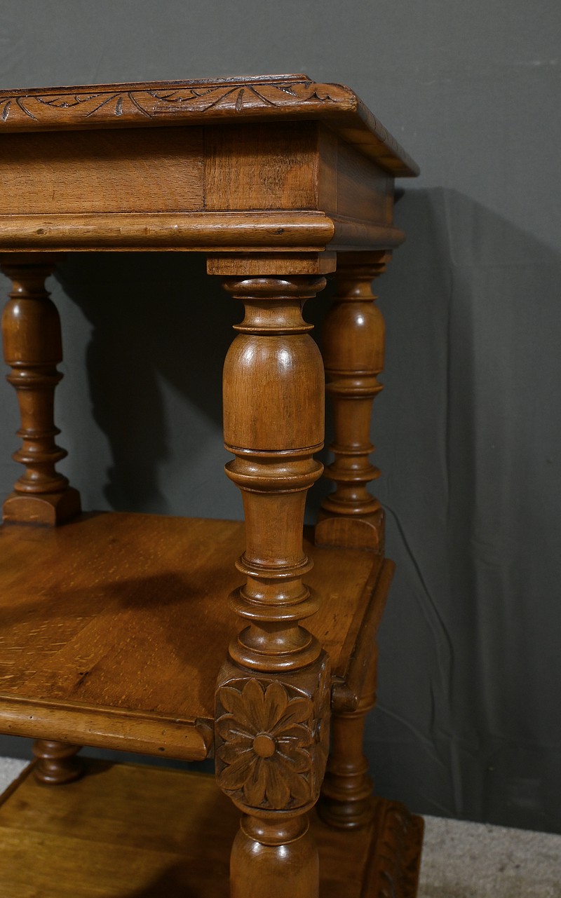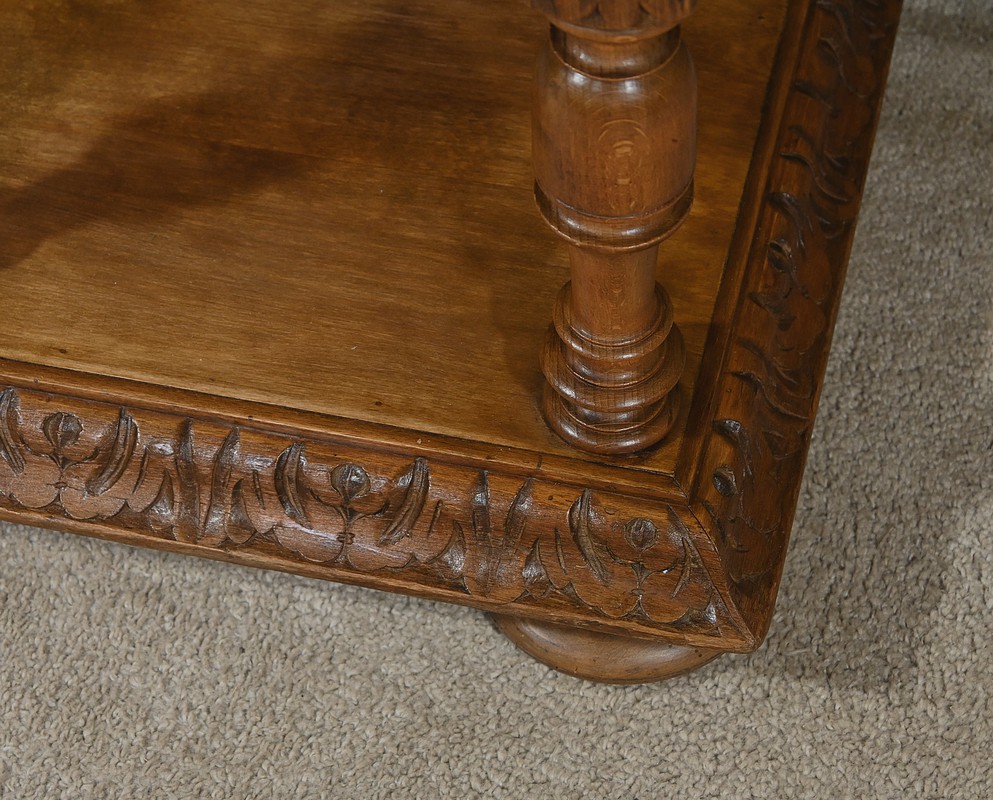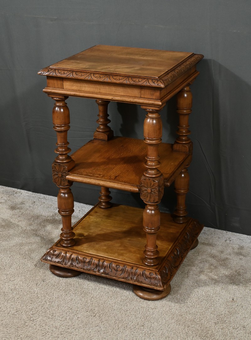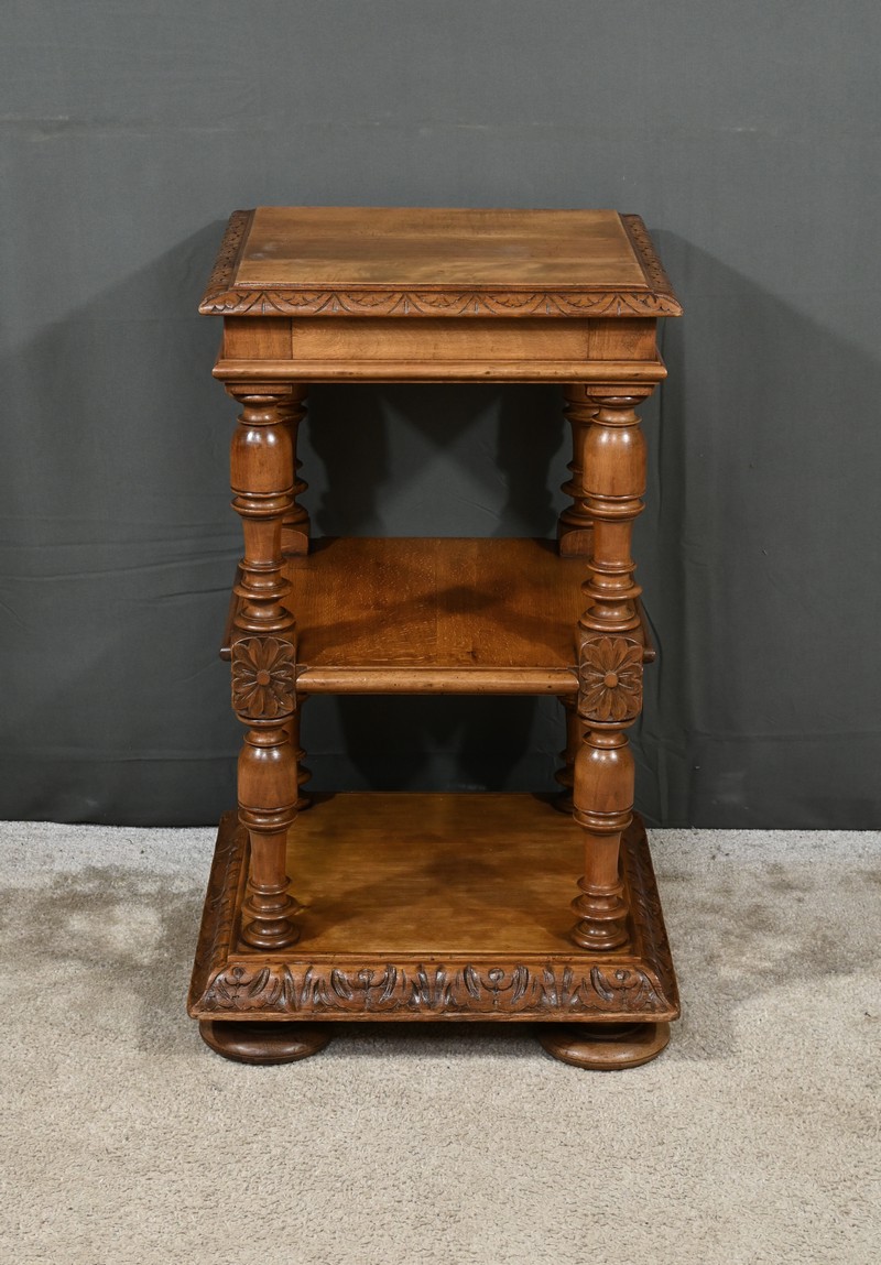 Petite table de salon à 3 niveaux possédant un dessus mouluré entouré de rebords sculptés de frises volutées. Chaque étage est soutenu par des colonnes tournées richement travaillées. De grandes rosaces ouvragées décorent le centre des piliers et le meuble repose sur quatre grands pieds galettes. Le plateau inférieur est entouré d’un large cadre en doucine, sculpté d’une frise florale. Ce petit mobilier en noyer massif est fonctionnel et décoratif.