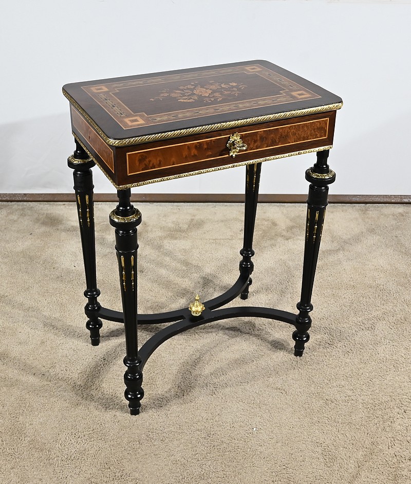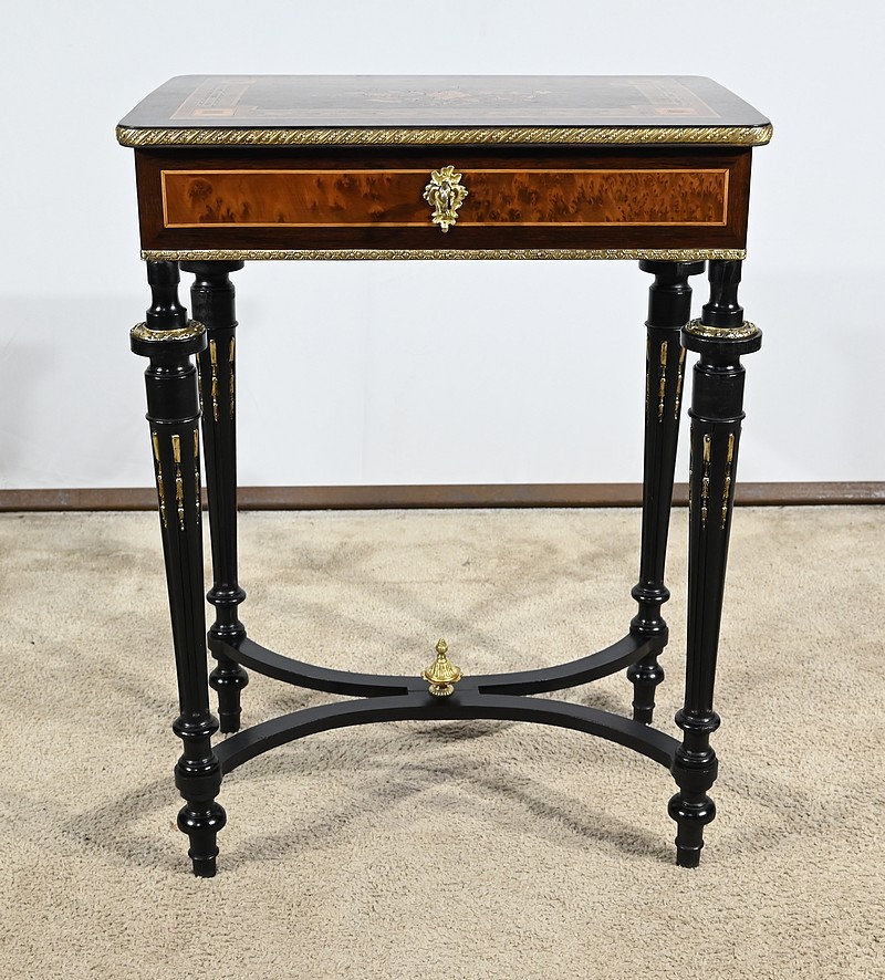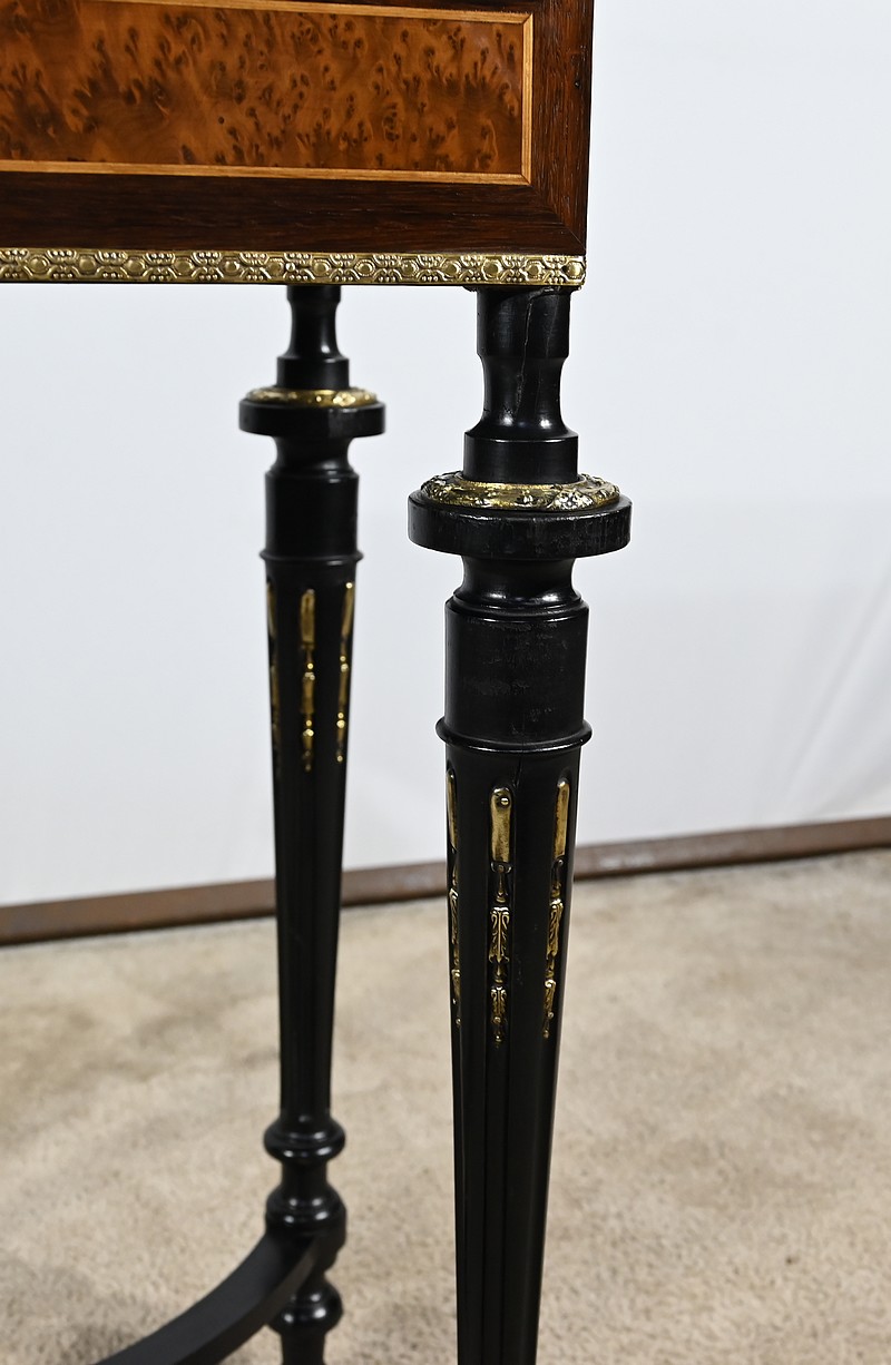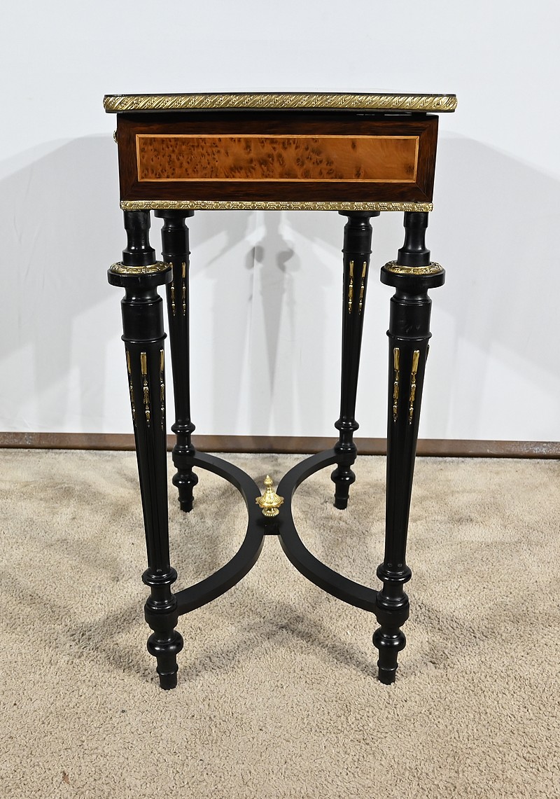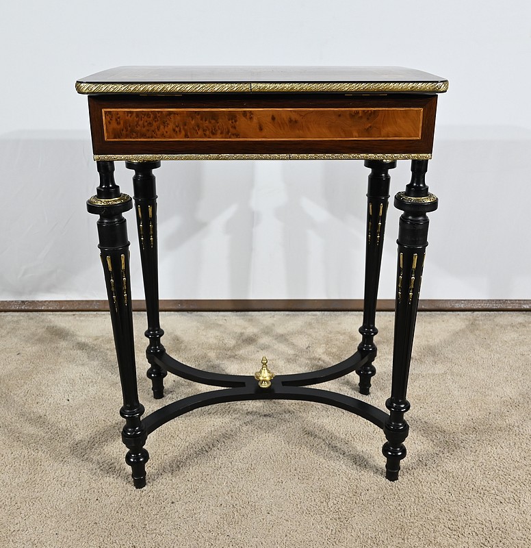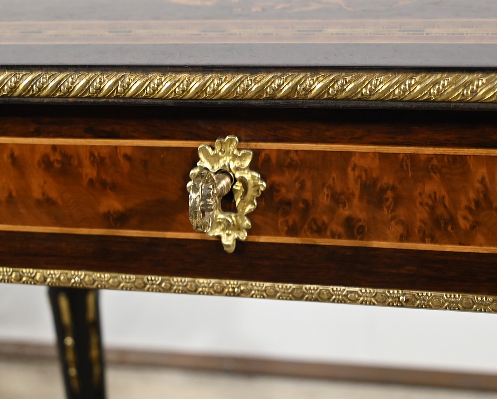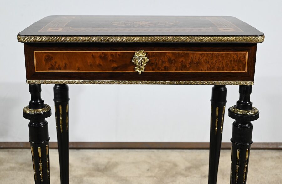Le dessus de cette petite table est entouré d’une baguette en bronze façonné. Sur chacune de ses faces, la ceinture de cette table est agrémentée de palissandre et de loupe d’amboine ceinte d’un filet de citronnier. En façade, une entrée en bronze et clé ciselée, accompagnent une serrure à un crochet, d’origine et en état de fonctionnement.