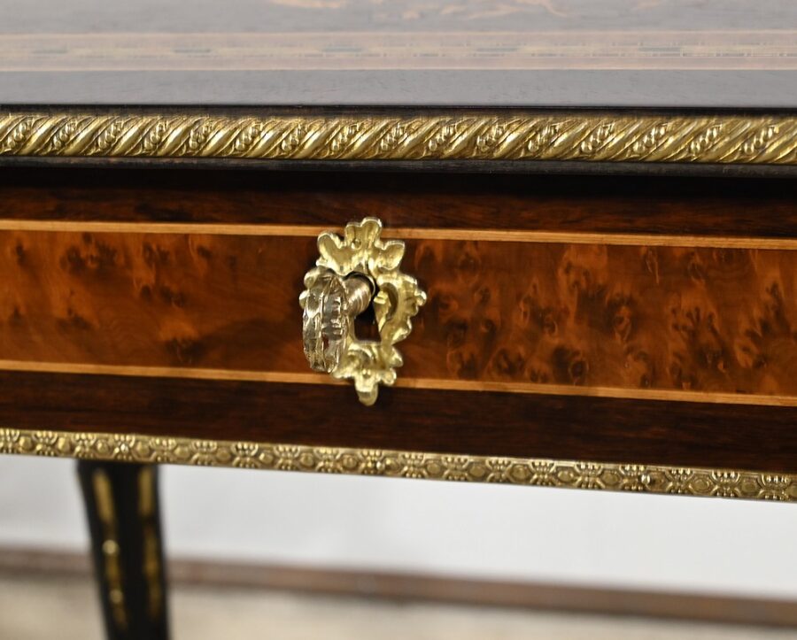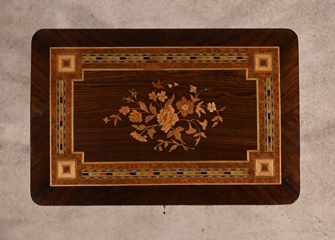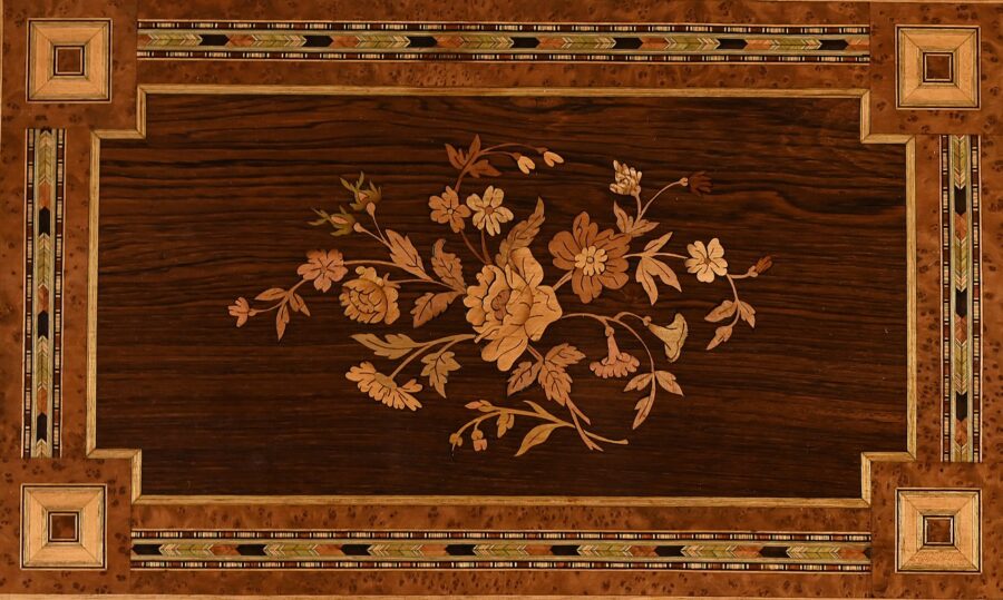 Charmante table en placage de palissandre et loupe d’amboine à décors marquetés. Celle-ci est munie d’un dessus doté au centre d’une composition florale sur fond en palissandre, entourée d’un pourtour en loupe d’amboine avec angles à la grecque. Ce pourtour est accompagné d’une marqueterie de bois teintés formant des frises géométriques. Autour, nous observons un cadre formé de bandes de placage de palissandre disposées en diagonale.