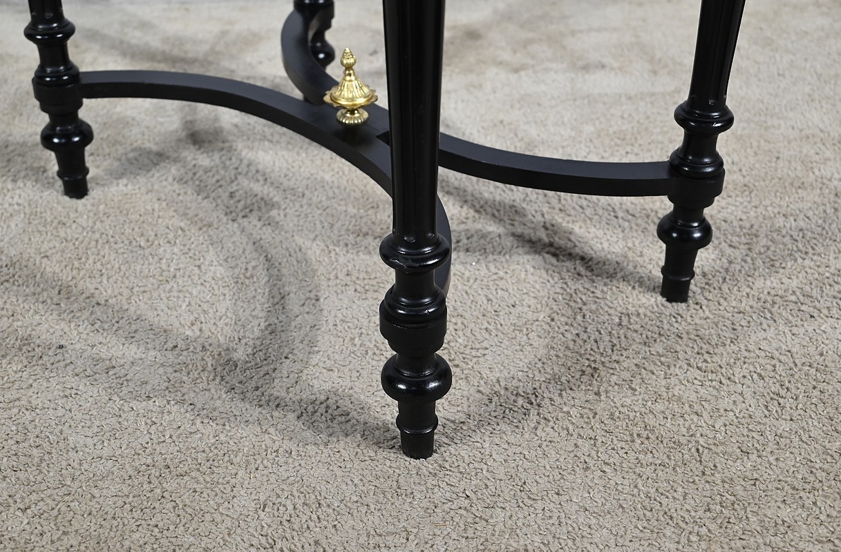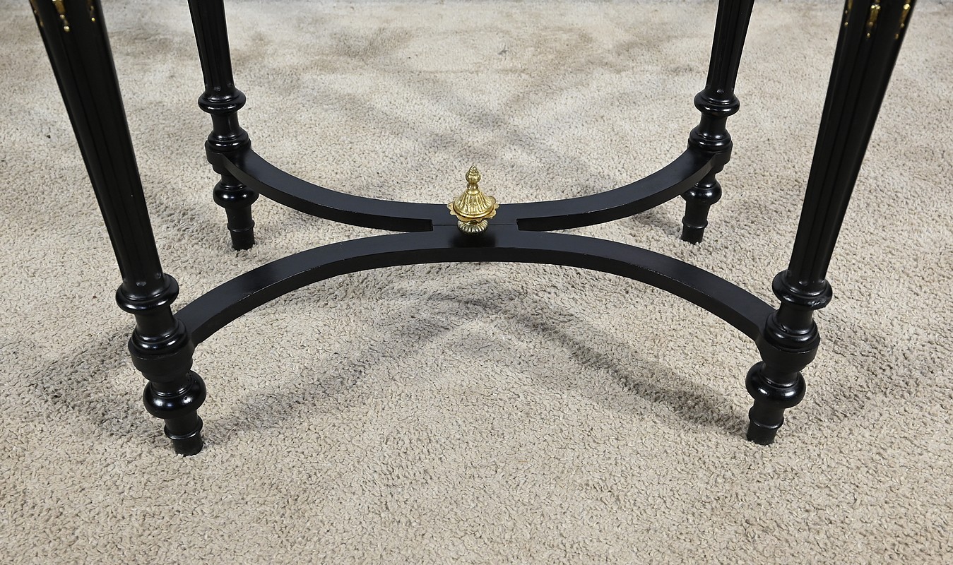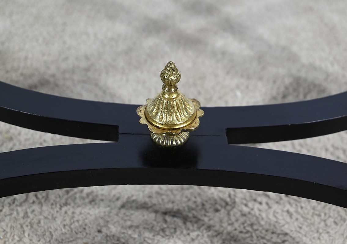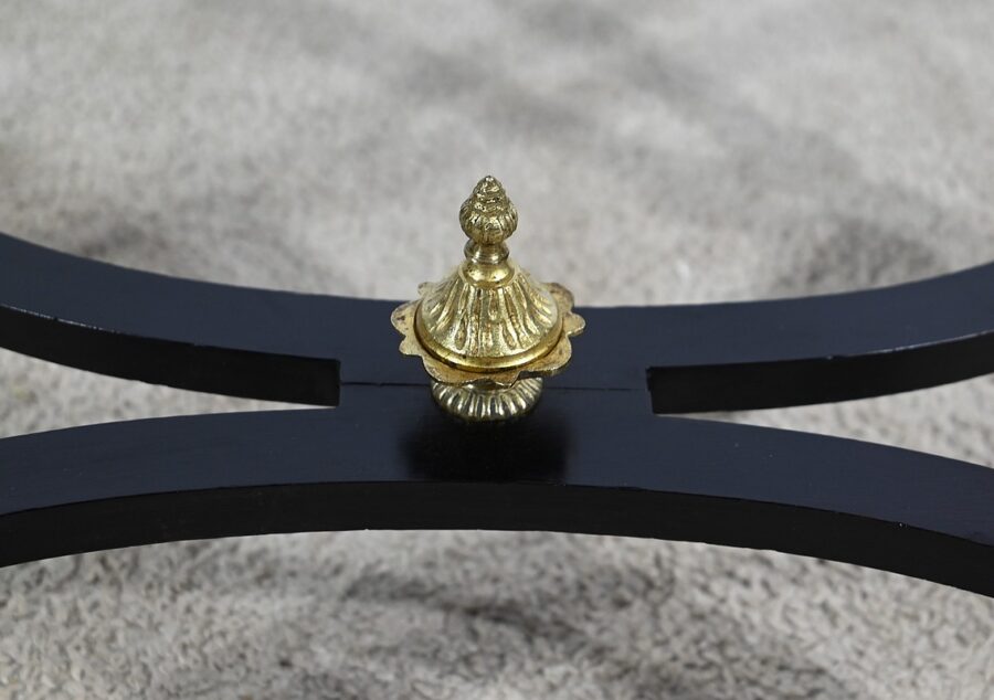 Ce ravissant petit mobilier repose sur 4 pieds tournés à cannelures arrêtées agrémentées d’asperges en partie supérieures. En partie inférieure, on y trouve une entretoise concave reliant ces 4 pieds avec au centre une sculpture en bronze en forme d’urne sommée d’un flambeau.