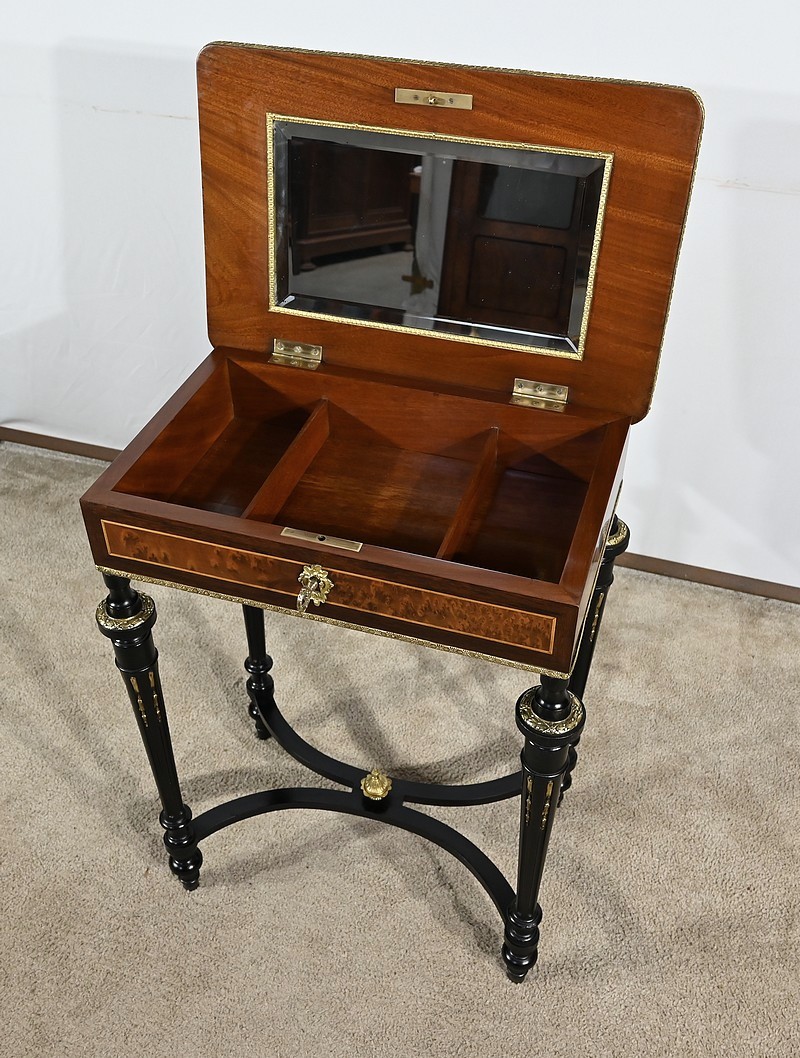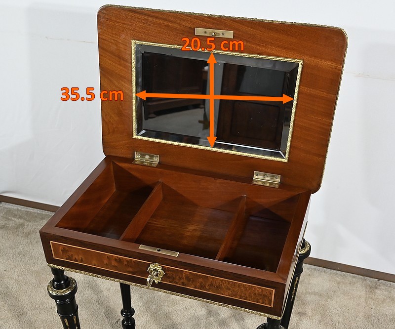 A l’ouverture, nous découvrons un intérieur en acajou doté d’un abattant foncé d’un miroir avec cadre en bronze, sur charnières laiton et un espace de rangement de trois casiers.