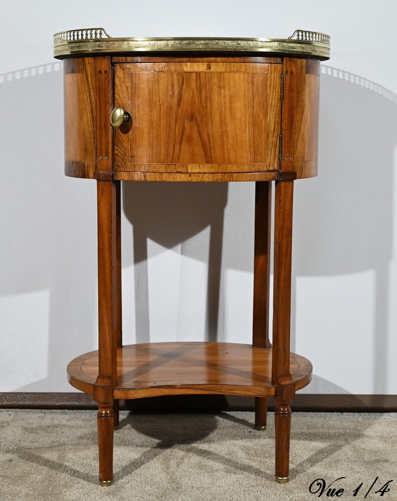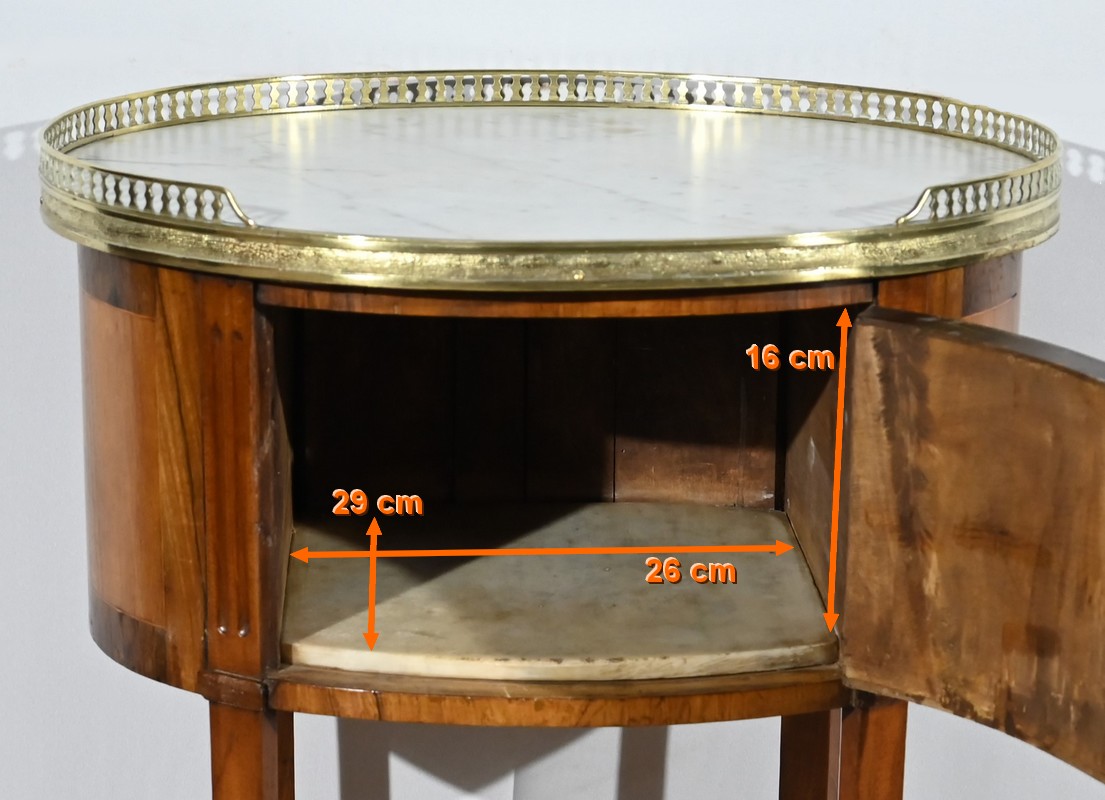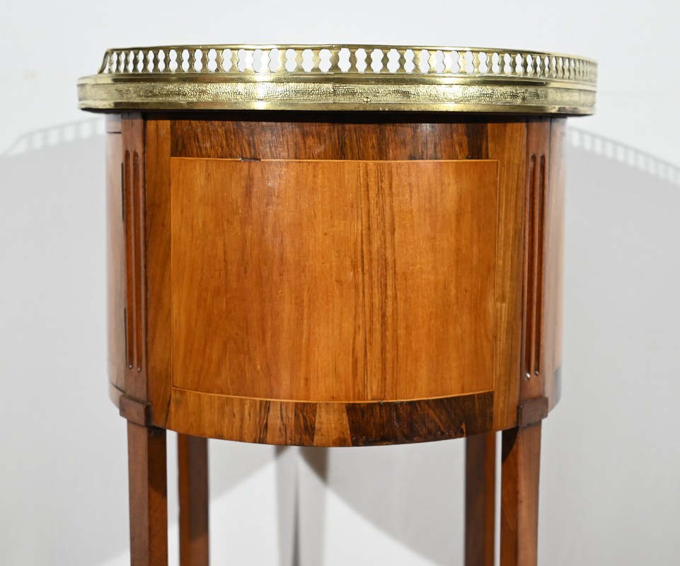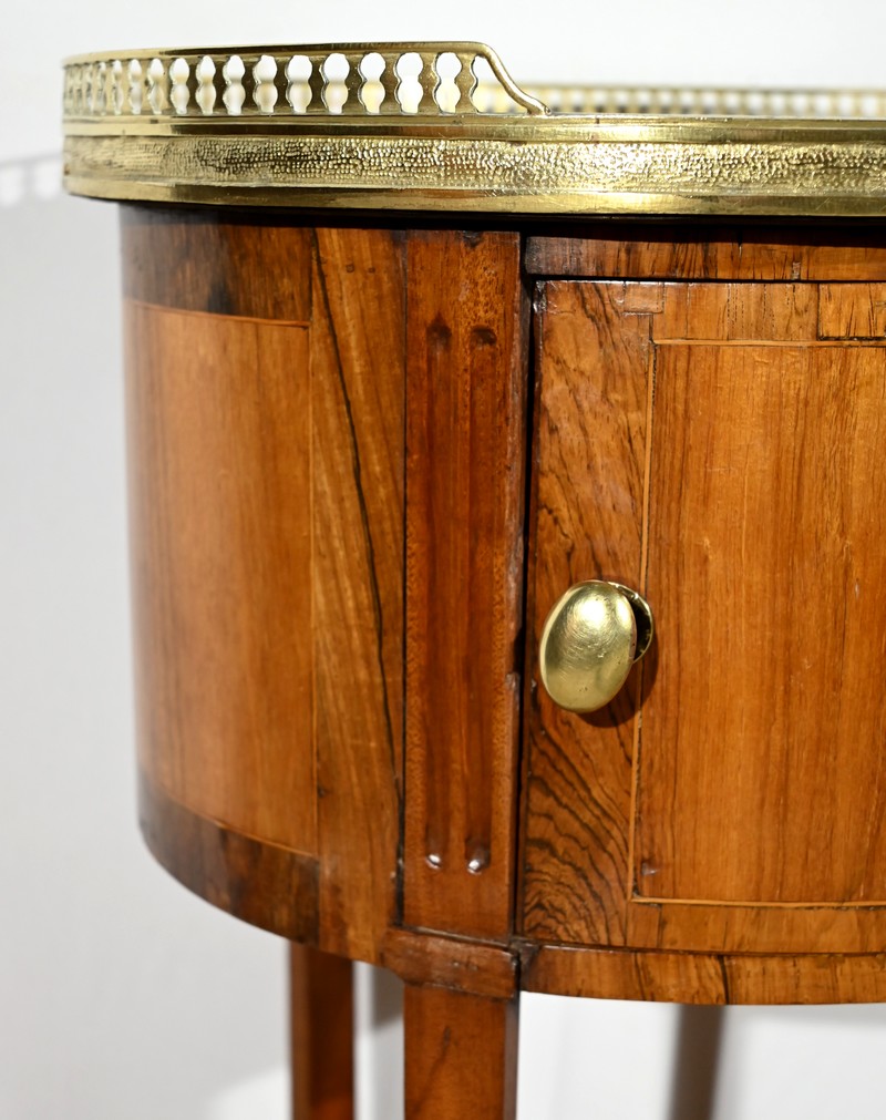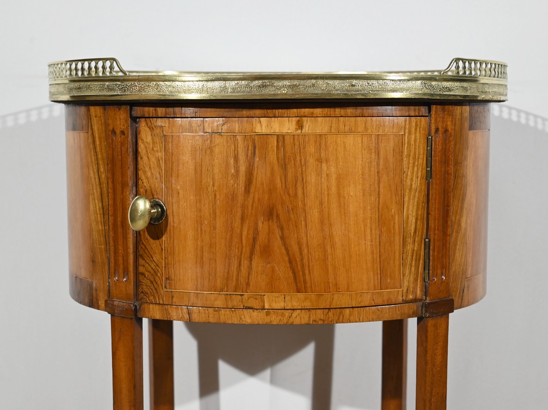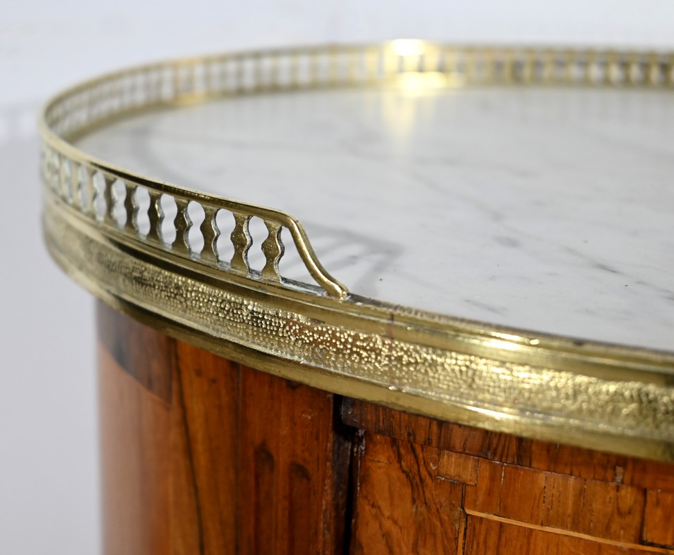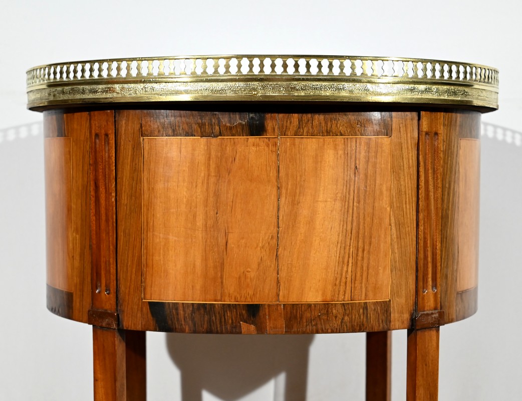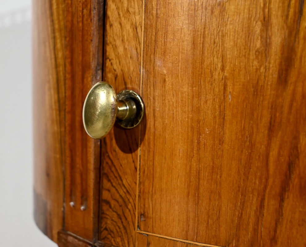 Cette table de salon de forme tambour ouvre par une porte cintrée en placage de noyer blond, avec loquet à bouton ovale, souligné de filets de citronniers et de bandes de palissandre.