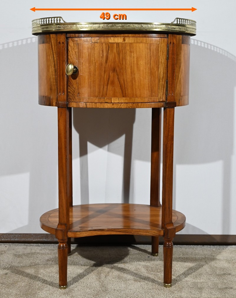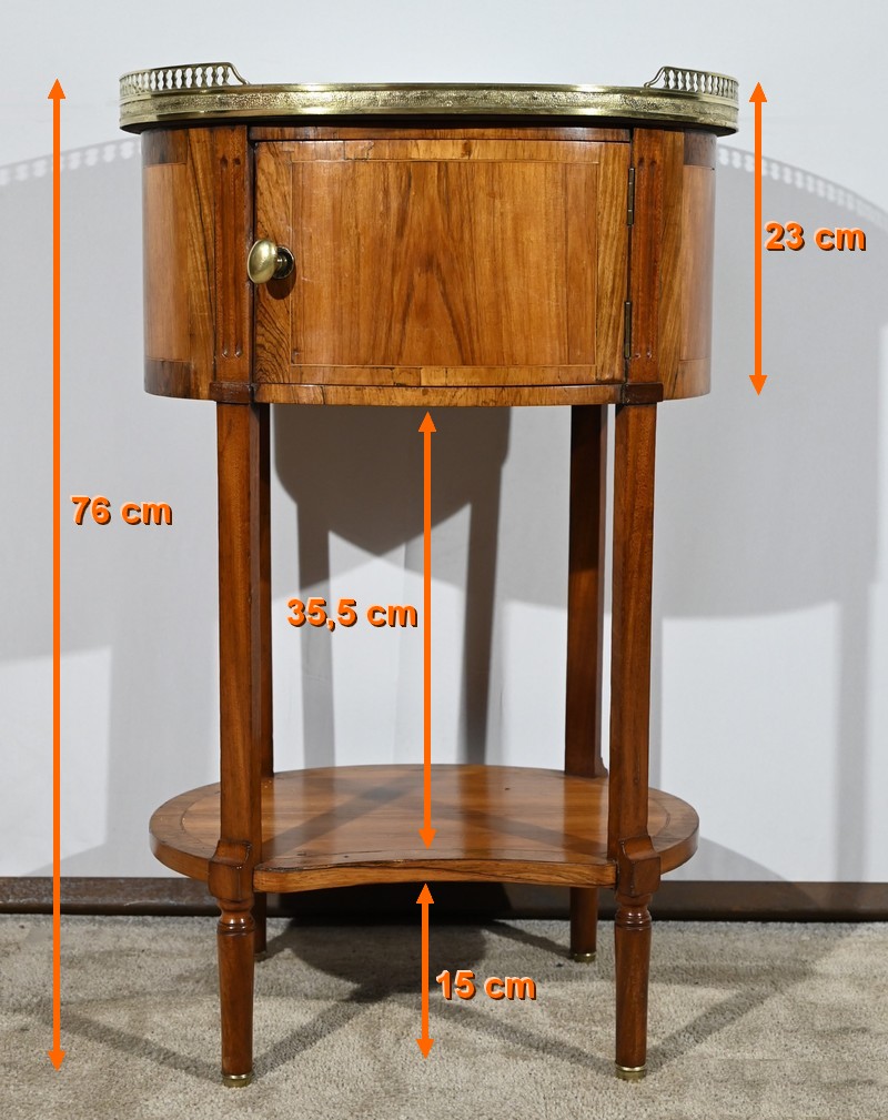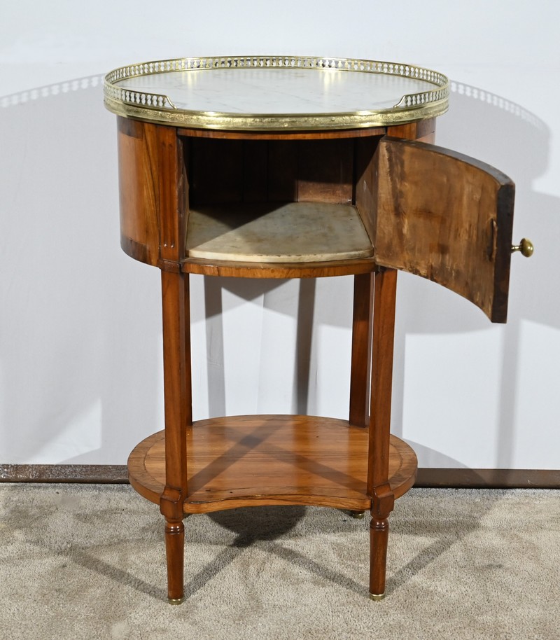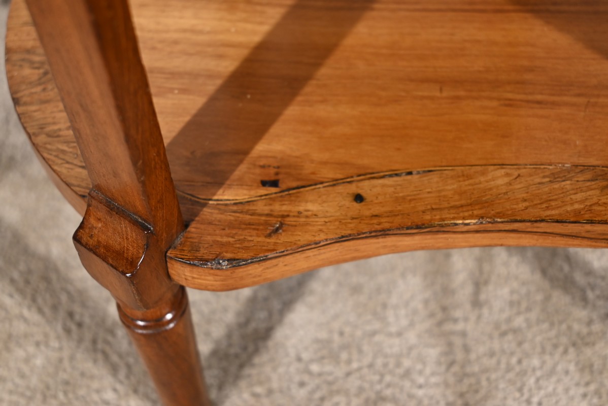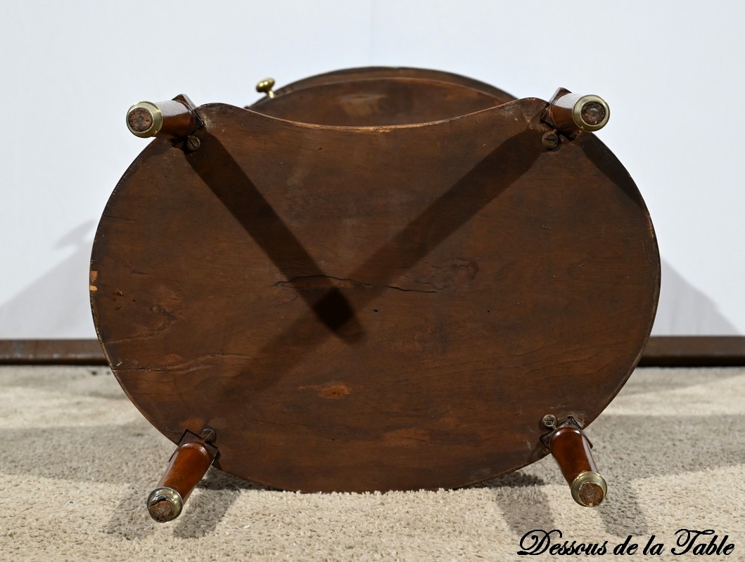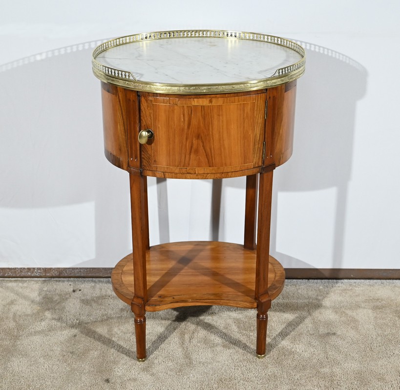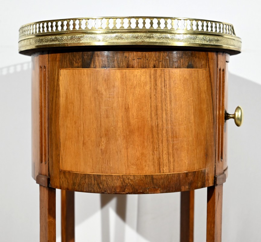 Cette table de salon de forme tambour ouvre par une porte cintrée en placage de noyer blond, avec loquet à bouton ovale, souligné de filets de citronniers et de bandes de palissandre.