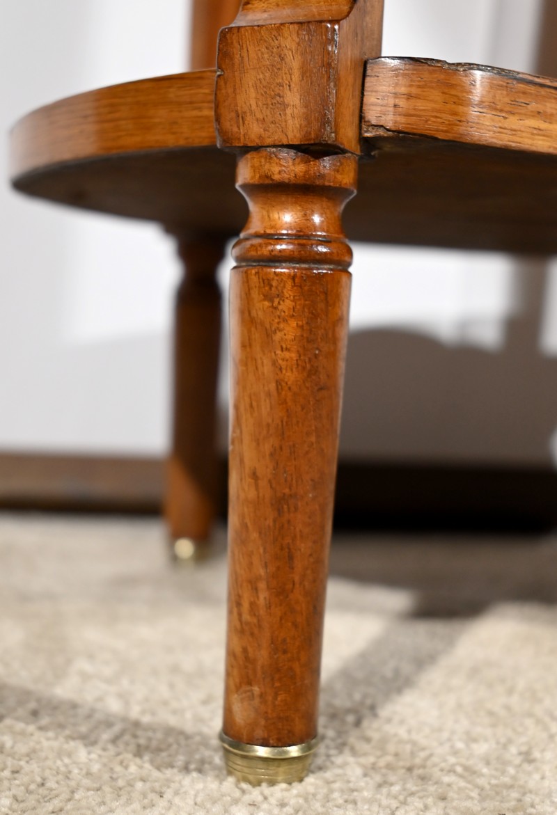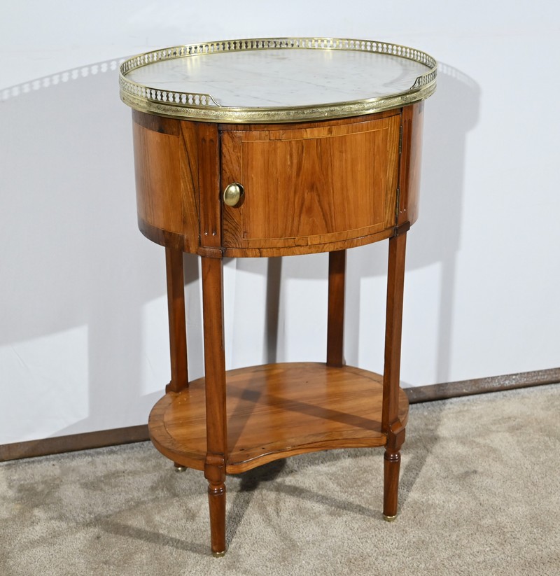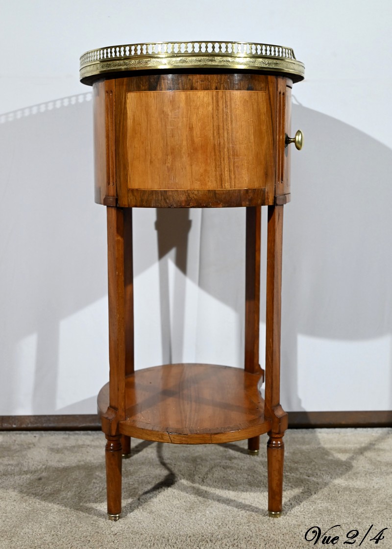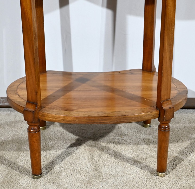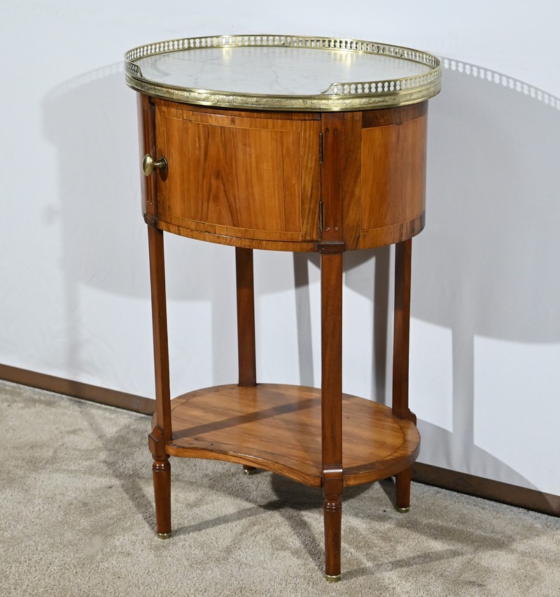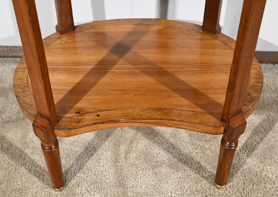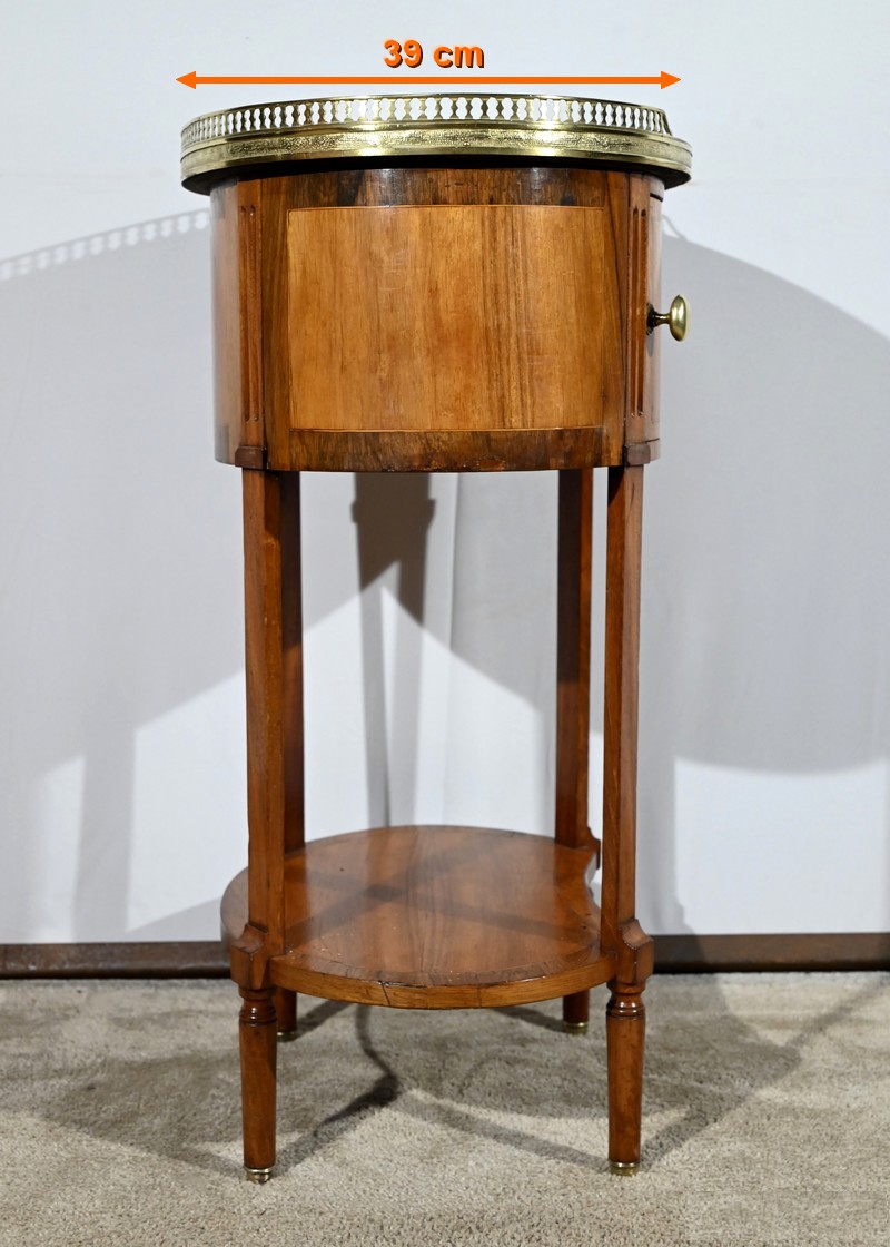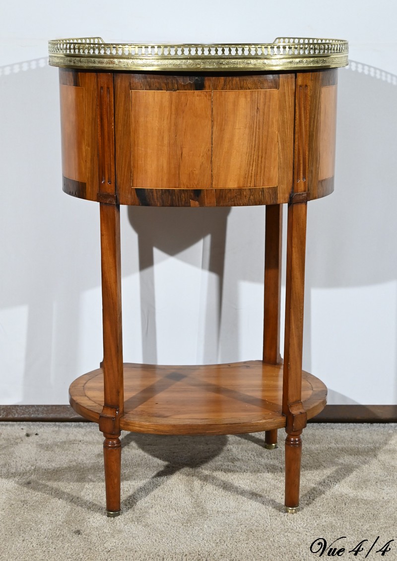 Cette table de salon de forme tambour ouvre par une porte cintrée en placage de noyer blond, avec loquet à bouton ovale, souligné de filets de citronniers et de bandes de palissandre.