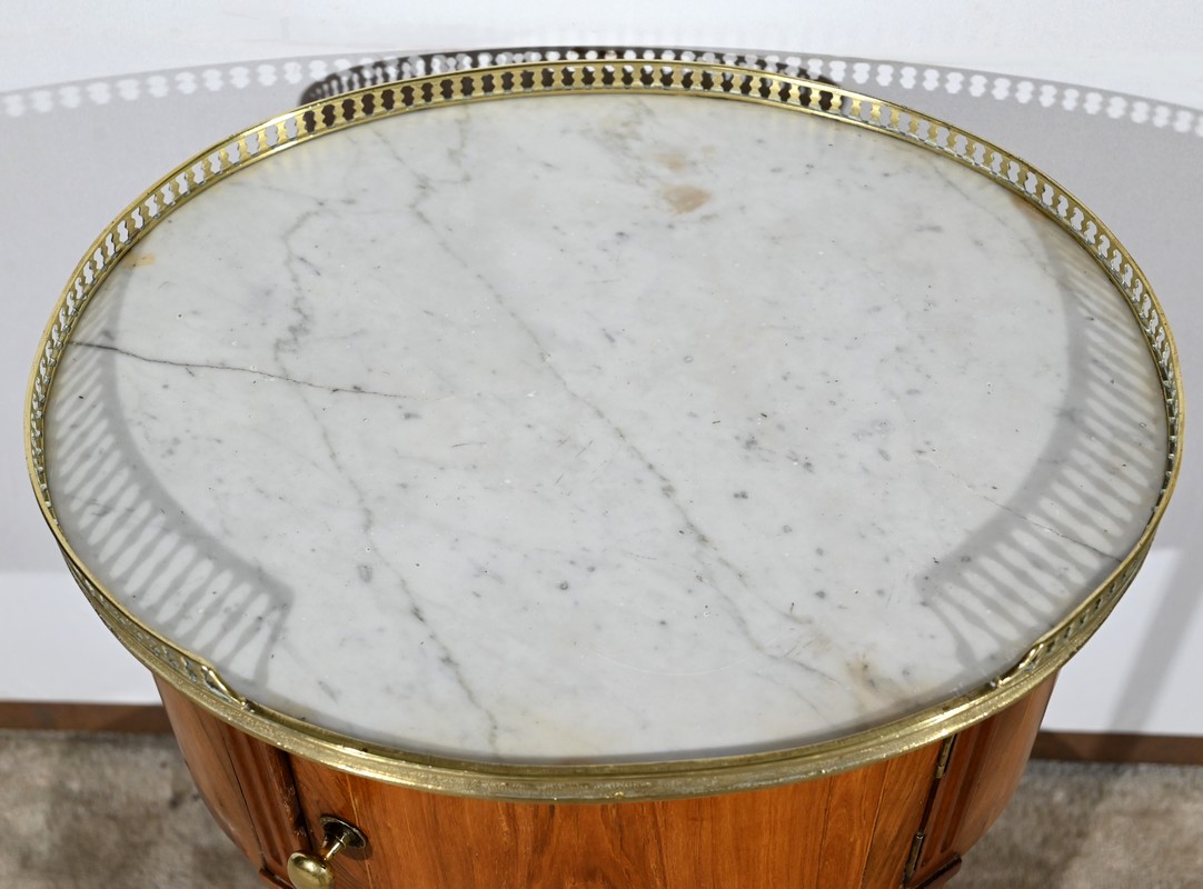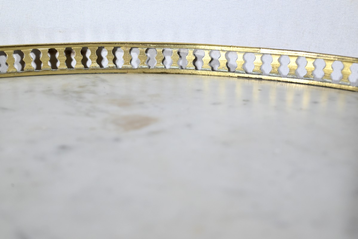 Ce meuble est sommé par un marbre de Carrare ceint d’une galerie ajourée en laiton à affleurement sur le devant.