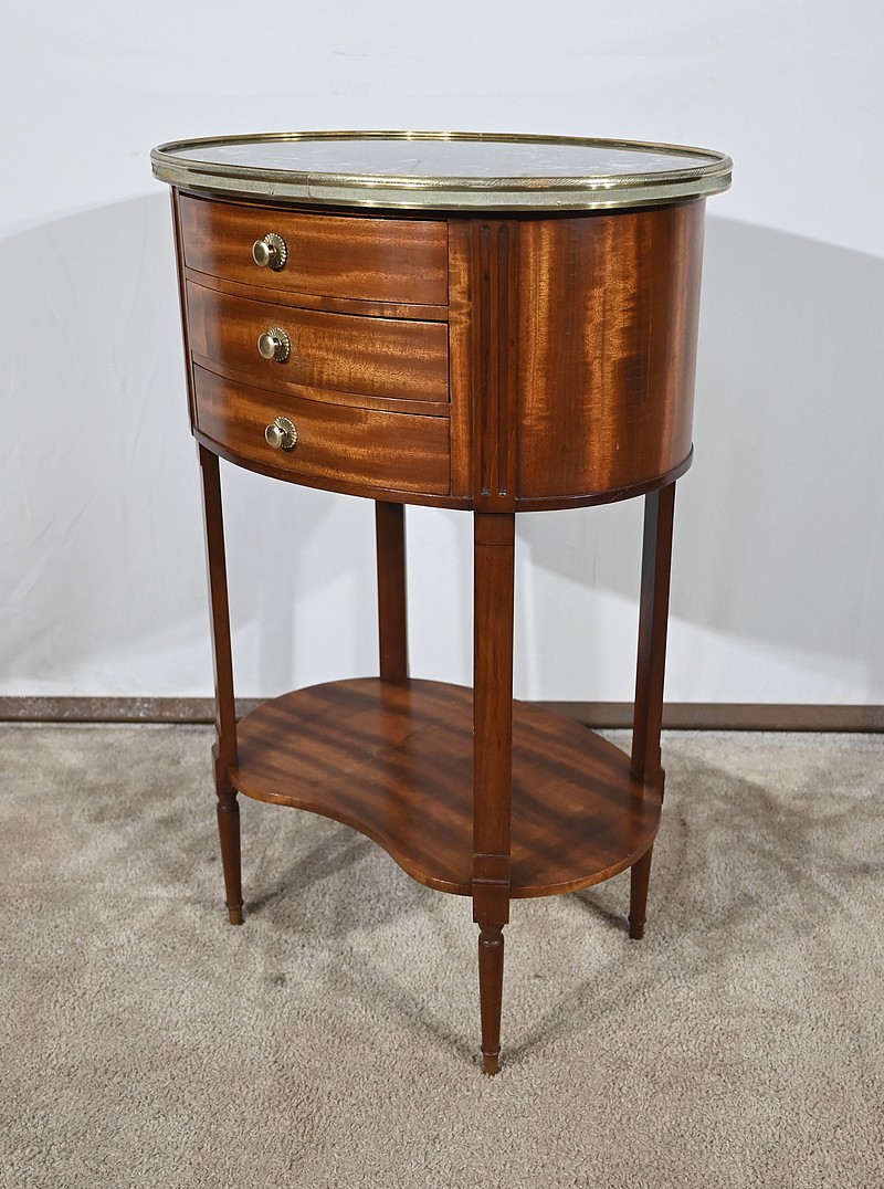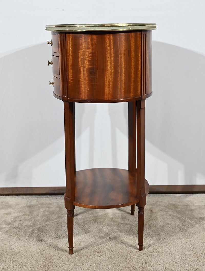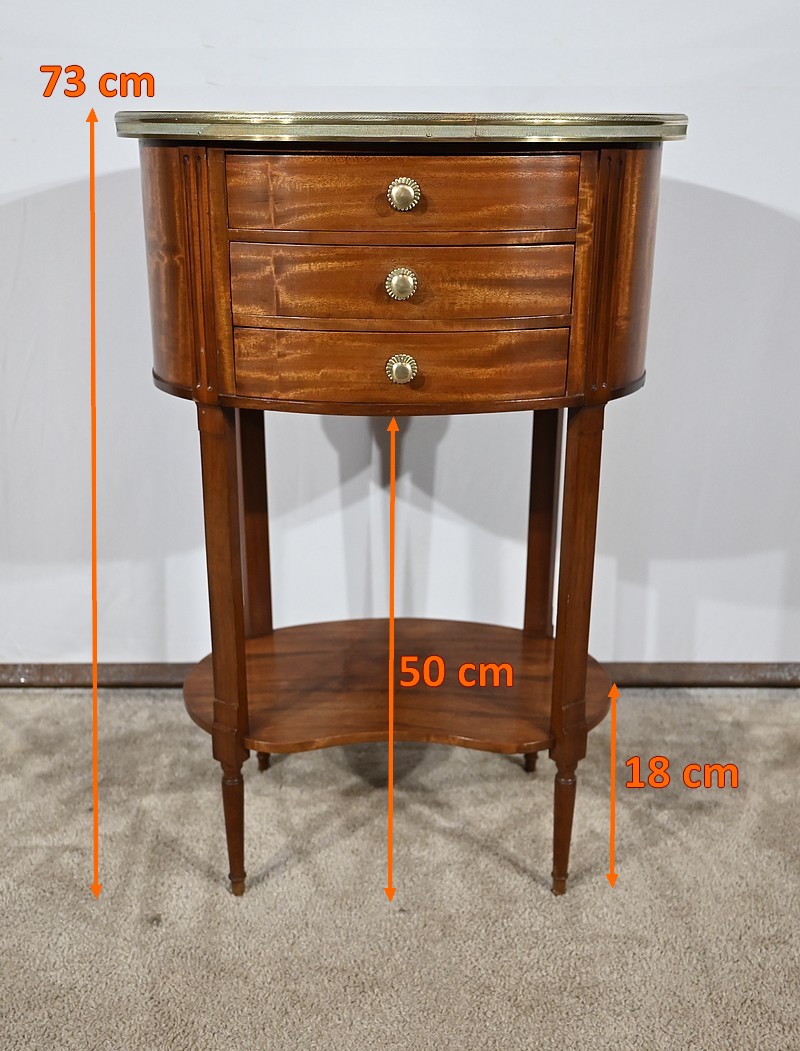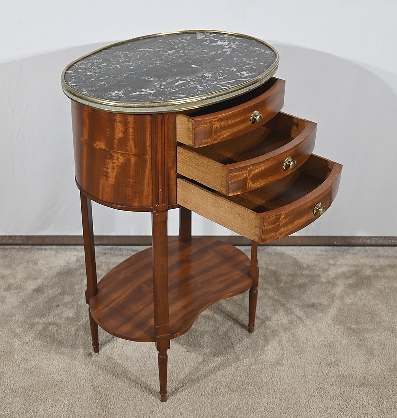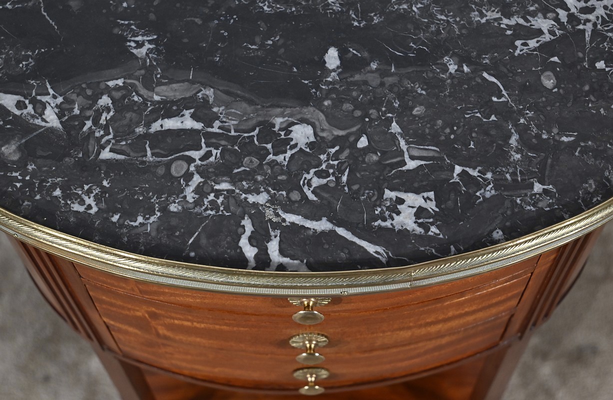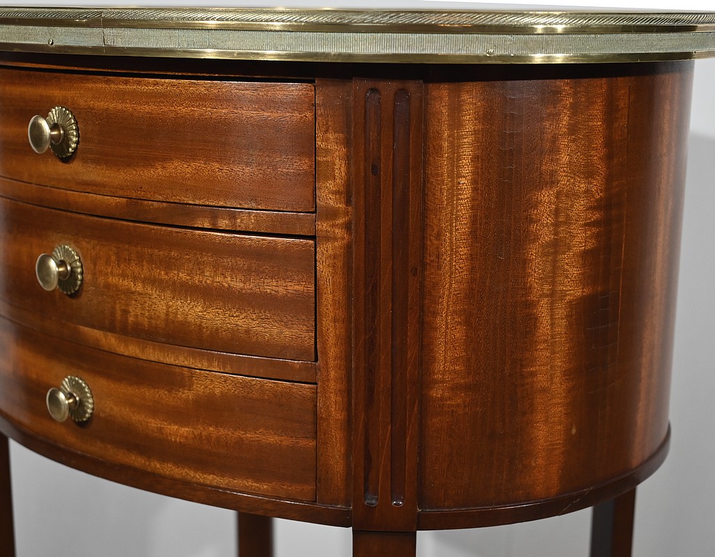 Cette table ovalisée en acajou et placage d’acajou, possède trois tiroirs en façade, bombés et des boutons lentilles avec rosaces. Les côtés et l’arrière en forme possède un placage disposé à la verticale. La ceinture est dotée au dessus de chaque pied, en acajou massif, de cannelures alternant avec des placages d’acajou lisses. En partie basse, une tablette de forme rognon est retenue par les quatre pieds. Au dessus, nous retrouvons un marbre ovale gris St Anne veiné de blanc, cerné d’une belle galerie striée en partie basse et légèrement débordante.