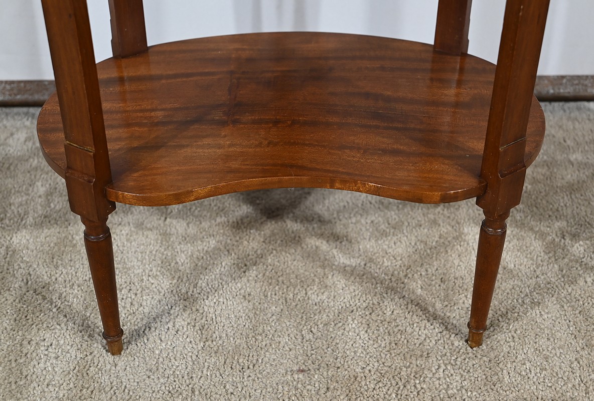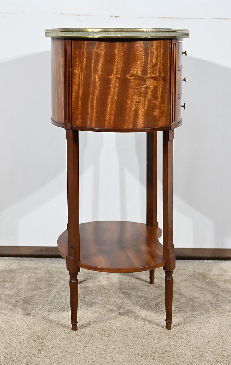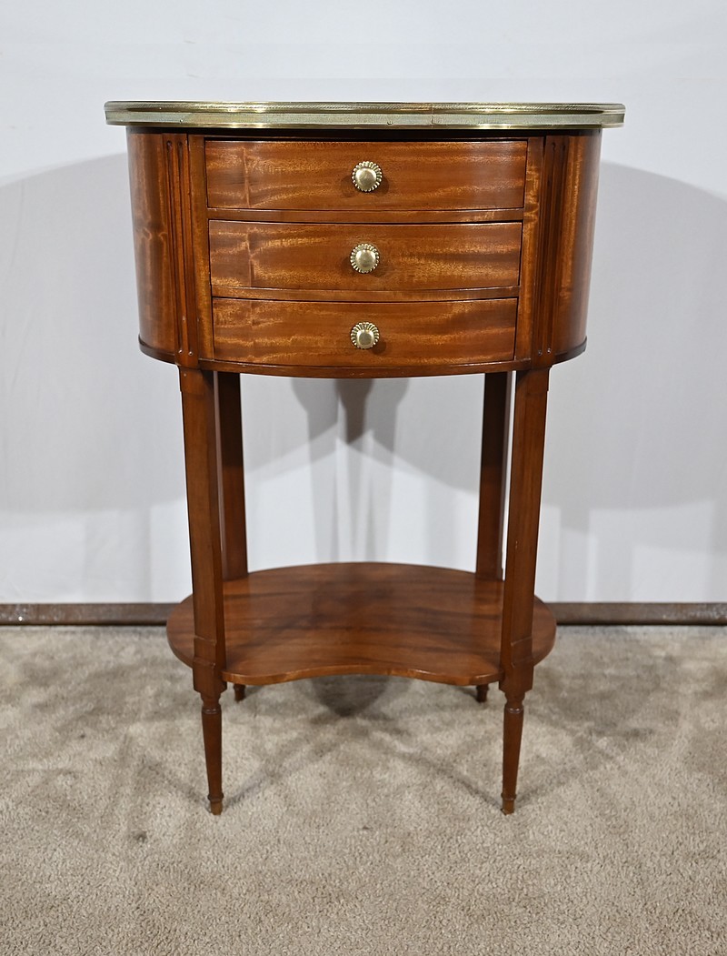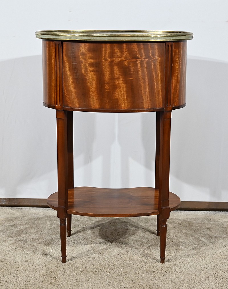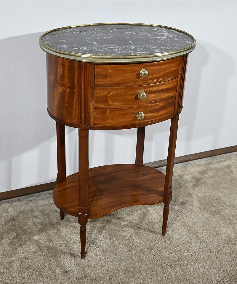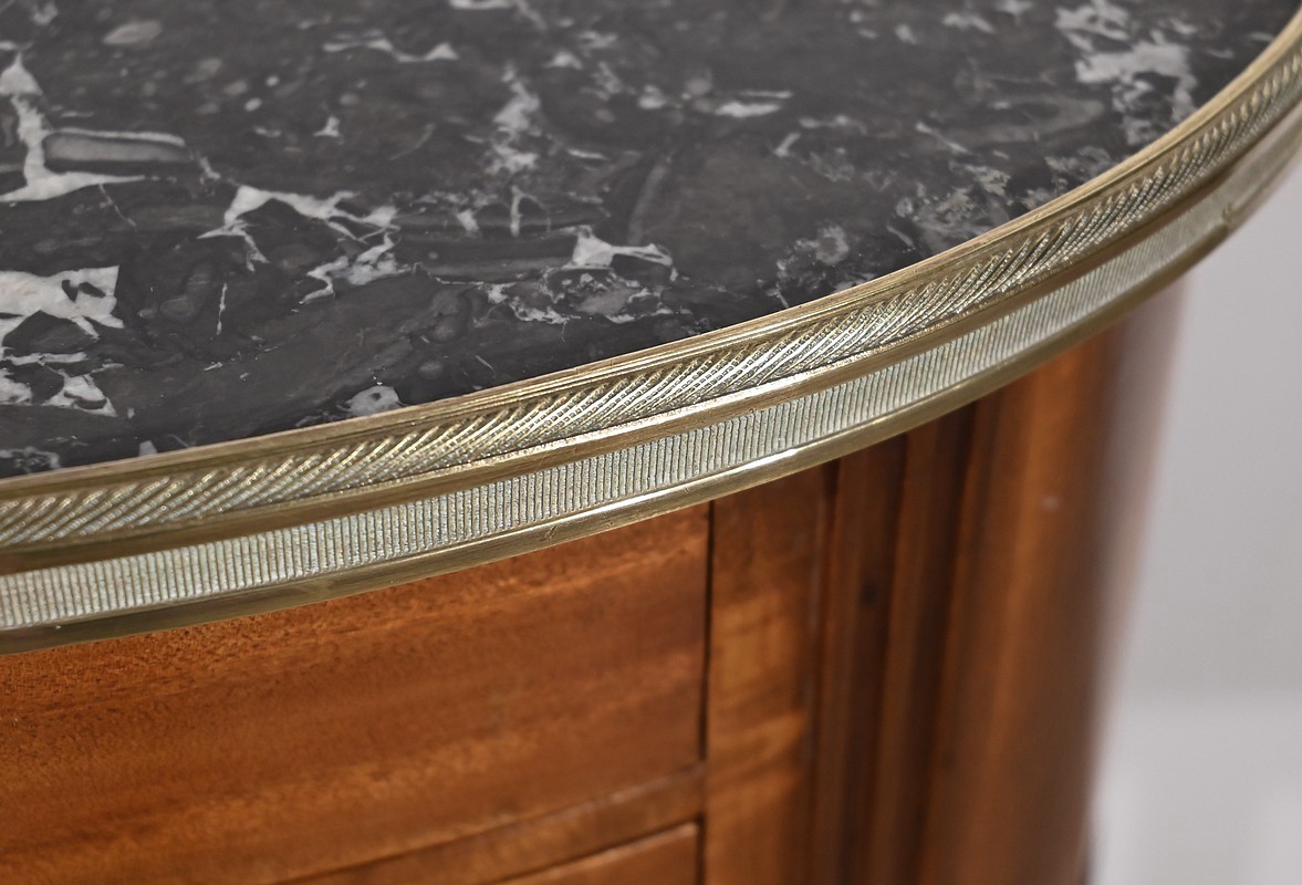 Cette table ovalisée en acajou et placage d’acajou, possède trois tiroirs en façade, bombés et des boutons lentilles avec rosaces. Les côtés et l’arrière en forme possède un placage disposé à la verticale. La ceinture est dotée au dessus de chaque pied, en acajou massif, de cannelures alternant avec des placages d’acajou lisses. En partie basse, une tablette de forme rognon est retenue par les quatre pieds. Au dessus, nous retrouvons un marbre ovale gris St Anne veiné de blanc, cerné d’une belle galerie striée en partie basse et légèrement débordante.