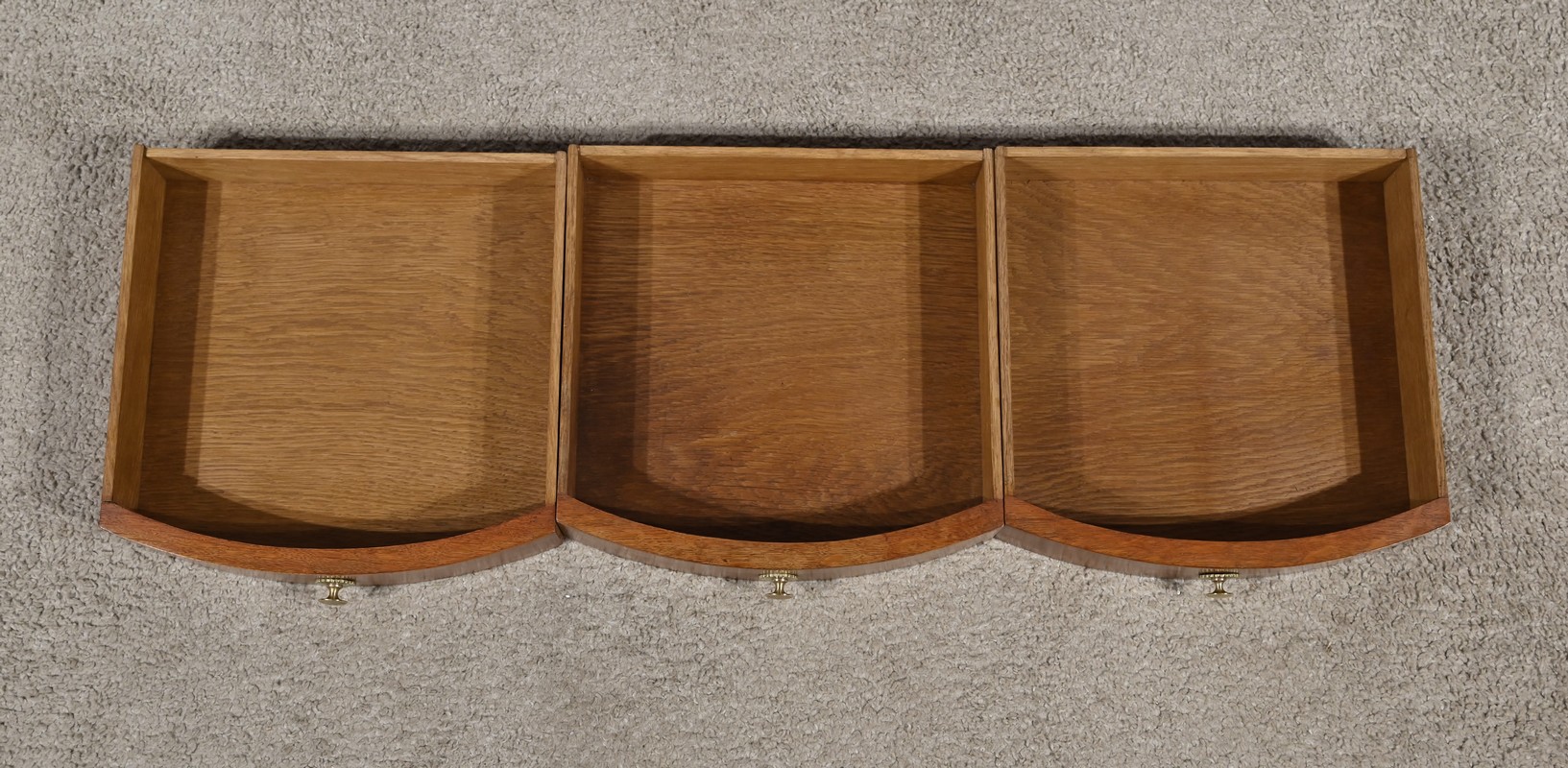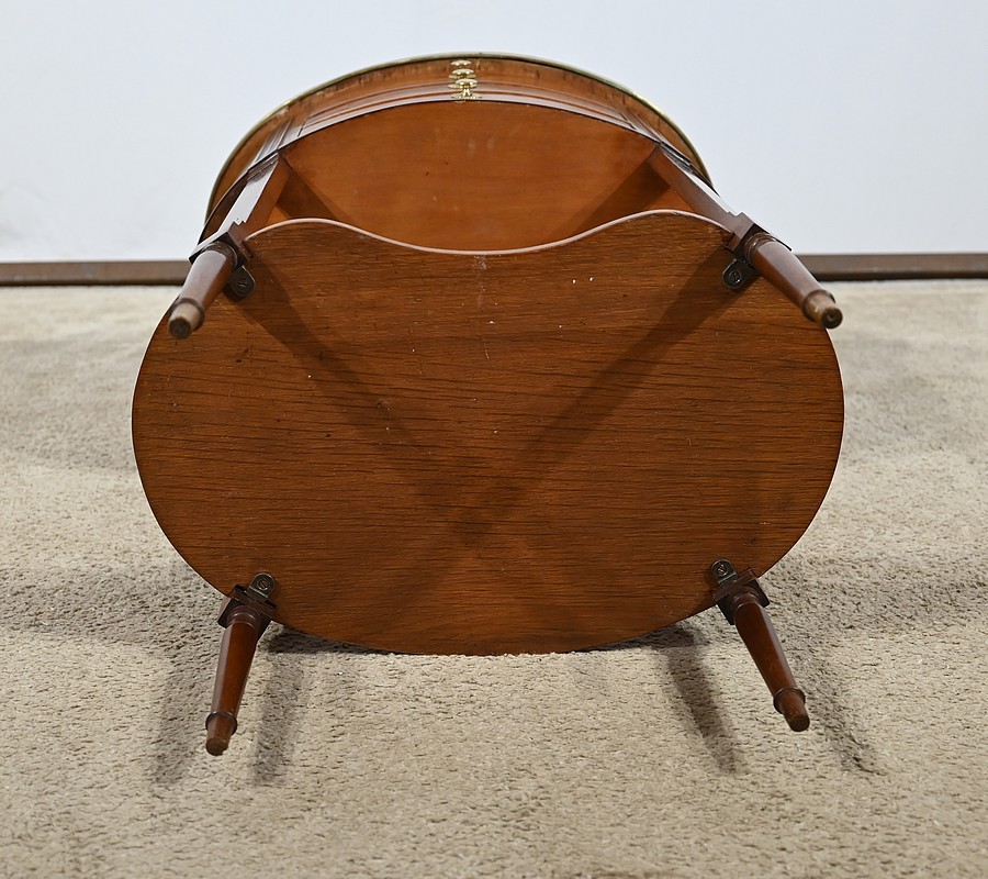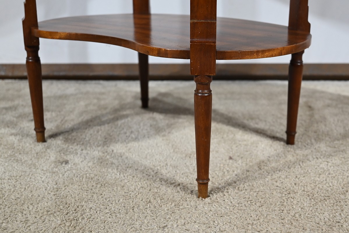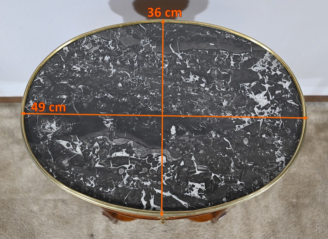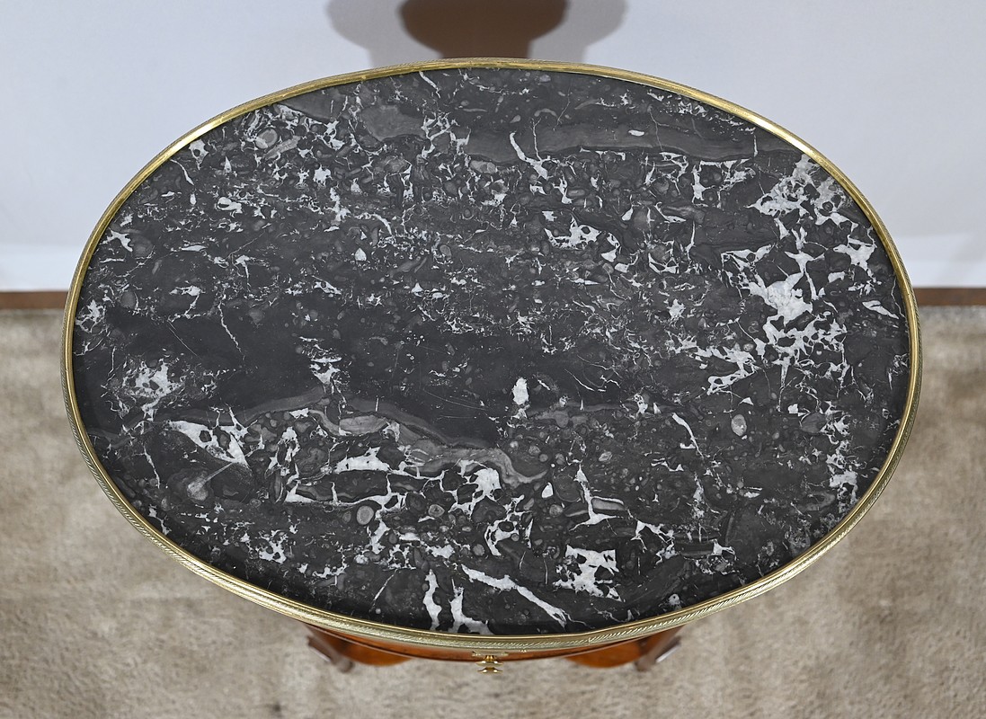 Cette table ovalisée en acajou et placage d’acajou, possède trois tiroirs en façade, bombés et des boutons lentilles avec rosaces. Les côtés et l’arrière en forme possède un placage disposé à la verticale. La ceinture est dotée au dessus de chaque pied, en acajou massif, de cannelures alternant avec des placages d’acajou lisses. En partie basse, une tablette de forme rognon est retenue par les quatre pieds. Au dessus, nous retrouvons un marbre ovale gris St Anne veiné de blanc, cerné d’une belle galerie striée en partie basse et légèrement débordante.