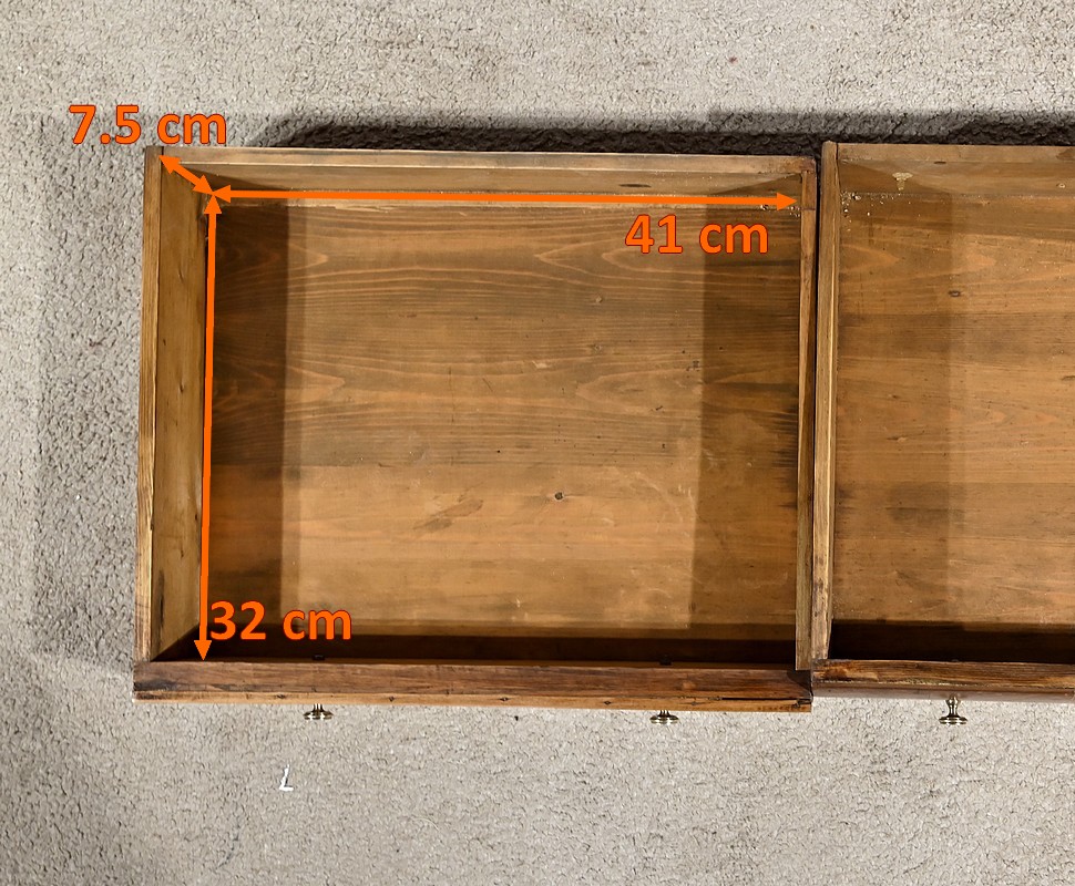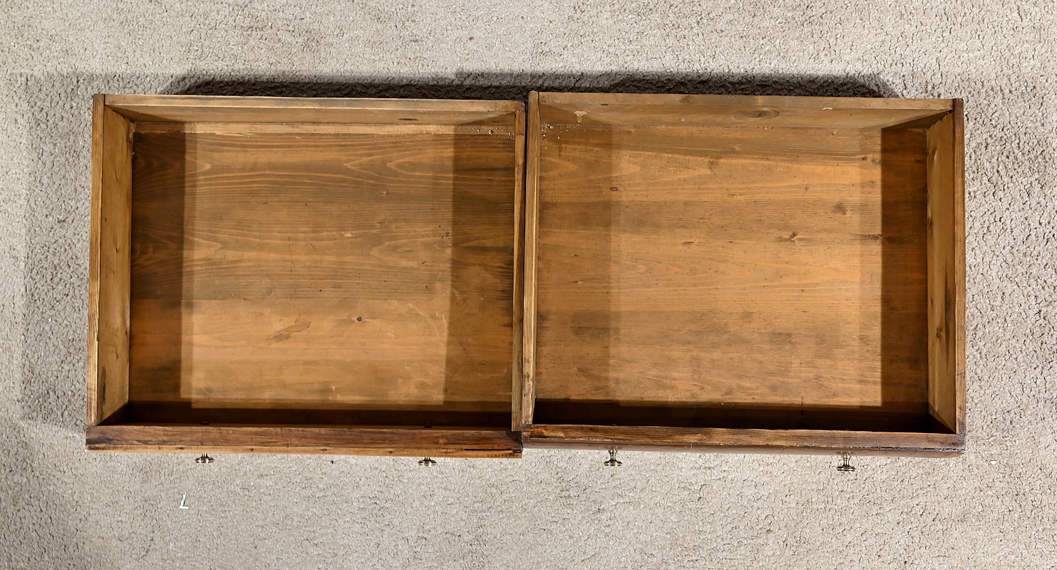 Ces deux tiroirs sont séparés d’une traverse en merisier à creux, délimitant le reste du meuble. Deux boutons cuvette en bronze ciselé agrémentent chaque tiroir.