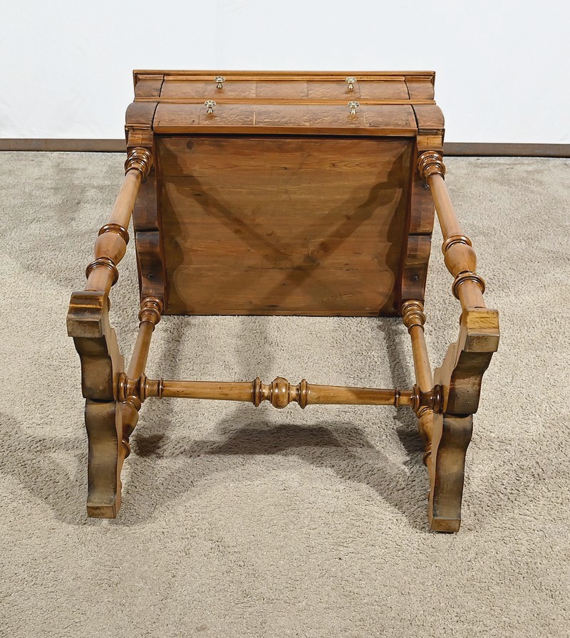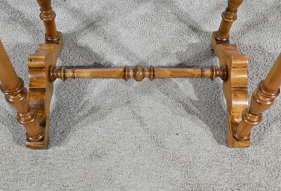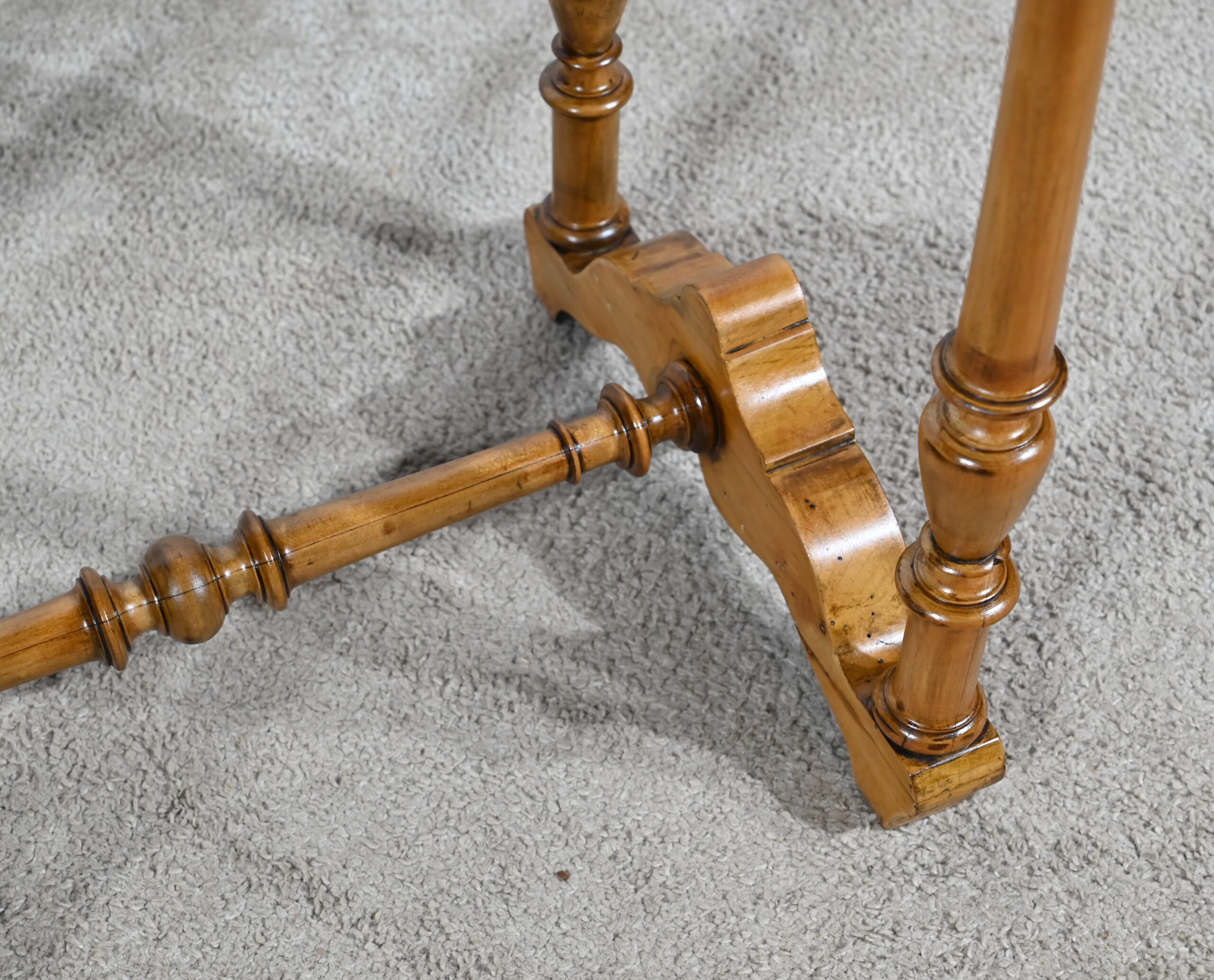 Cette partie haute repose sur quatre pieds tournés en merisier massif disposé sur un élément de bois mouvementé, découpé vers le haut et le bas. Une entretoise relie ces éléments.