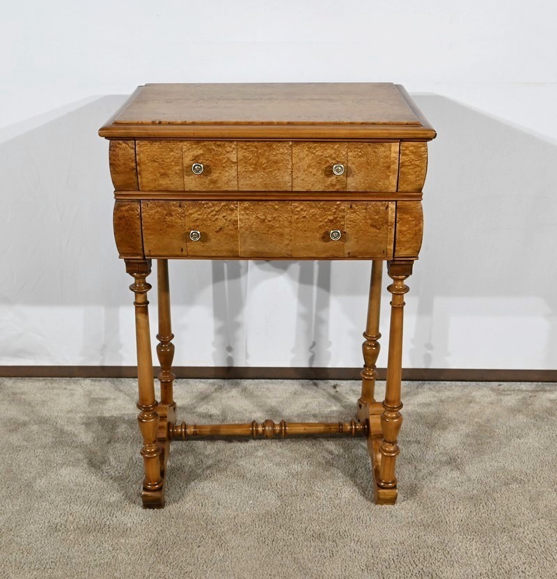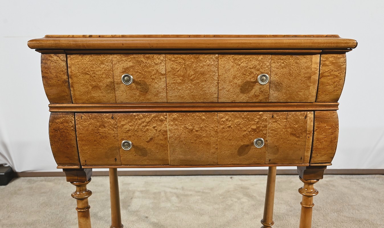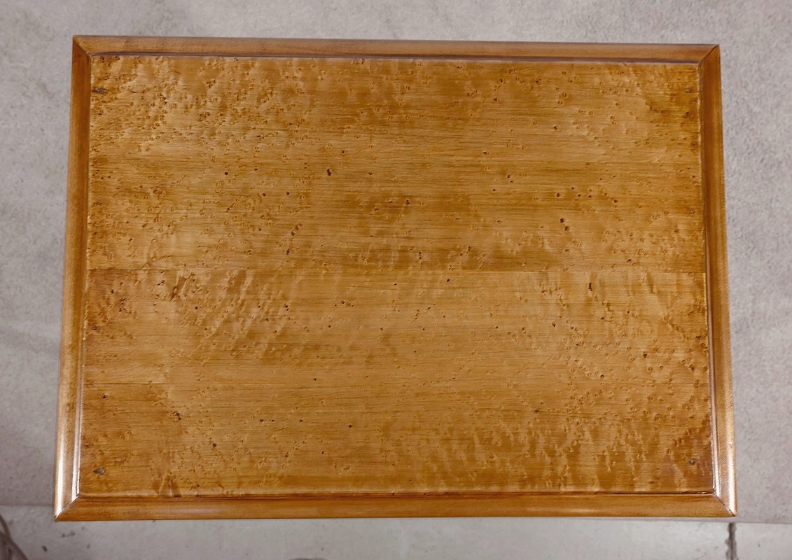 Belle Table en bois clair en merisier et placage de moucheté d’Amboine. Elle se caractérise par deux tiroirs aux façades bombées et constituées de 5 plaques d’Amboine.