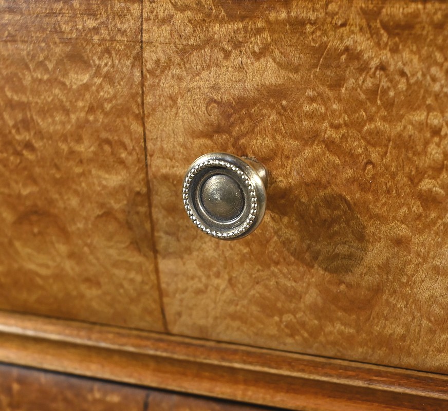 Les dessus du meuble en loupe d’Amboine est entouré d’une moulure en bec de corbin en merisier et petite gorge.