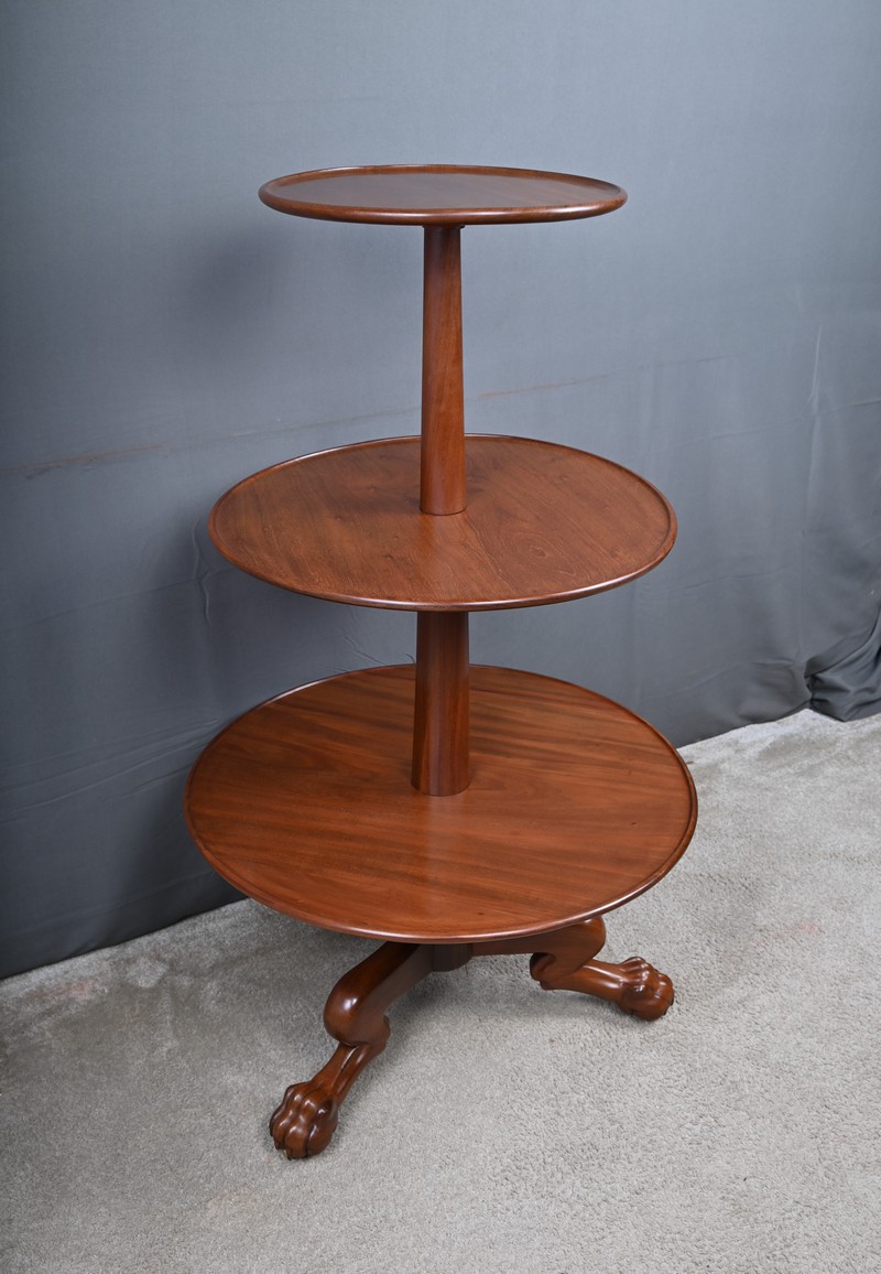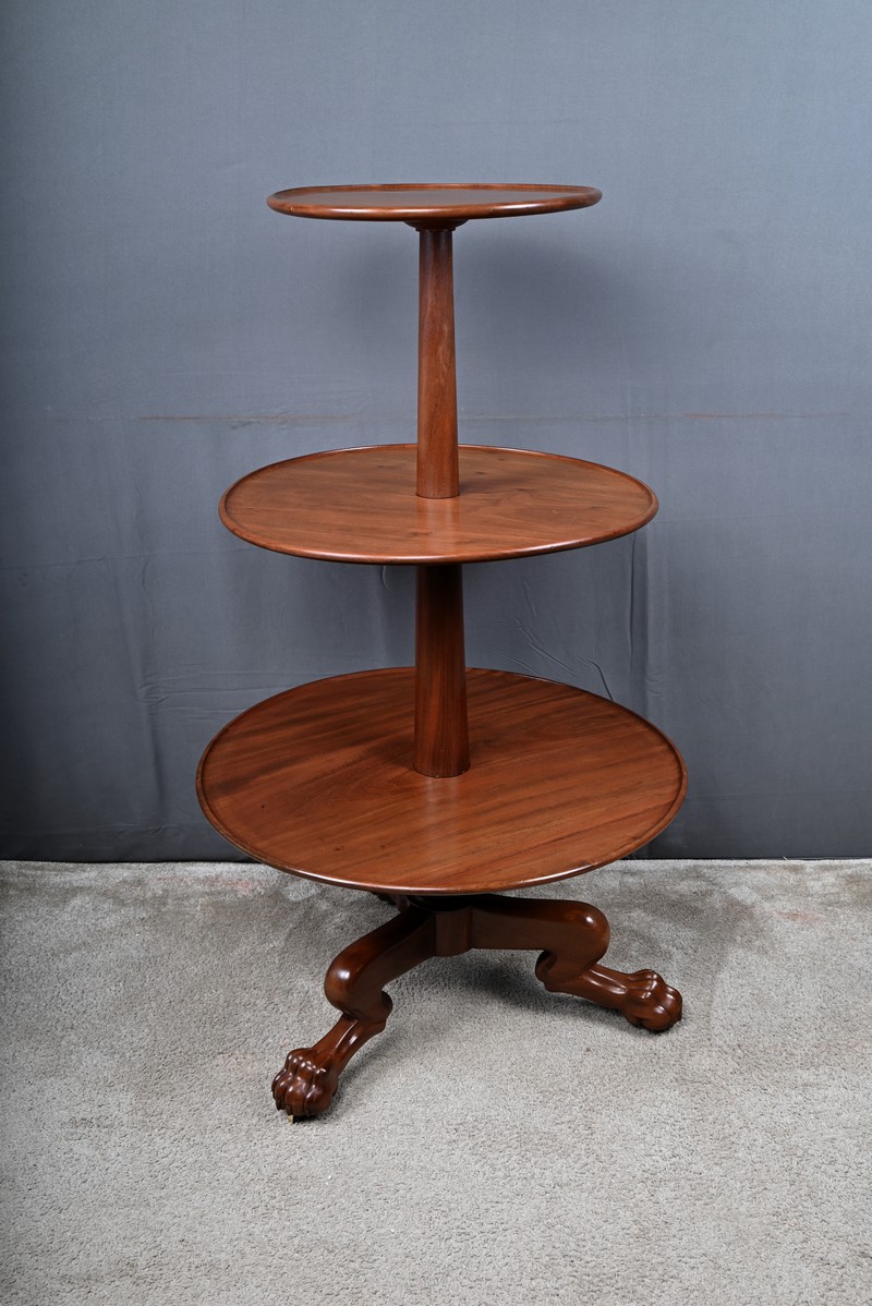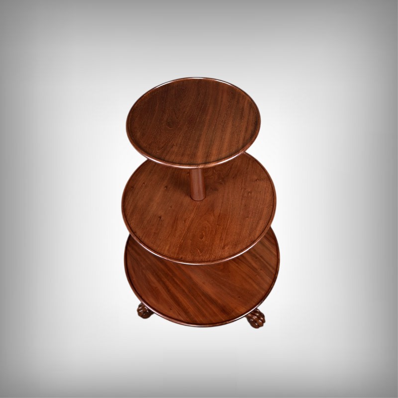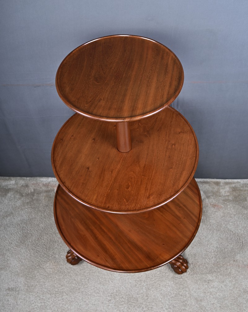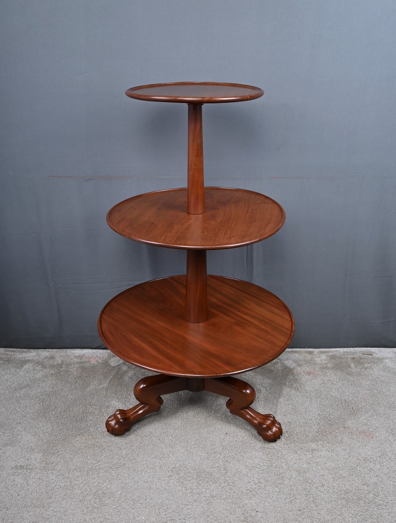 Ce serviteur muet en acajou, typique du style anglais du XIXe siècle, se compose de trois plateaux circulaires en cuvette, tournants et disposés en hauteur selon une structure pyramidale, idéale pour exposer des objets décoratifs ou servir des rafraîchissements.