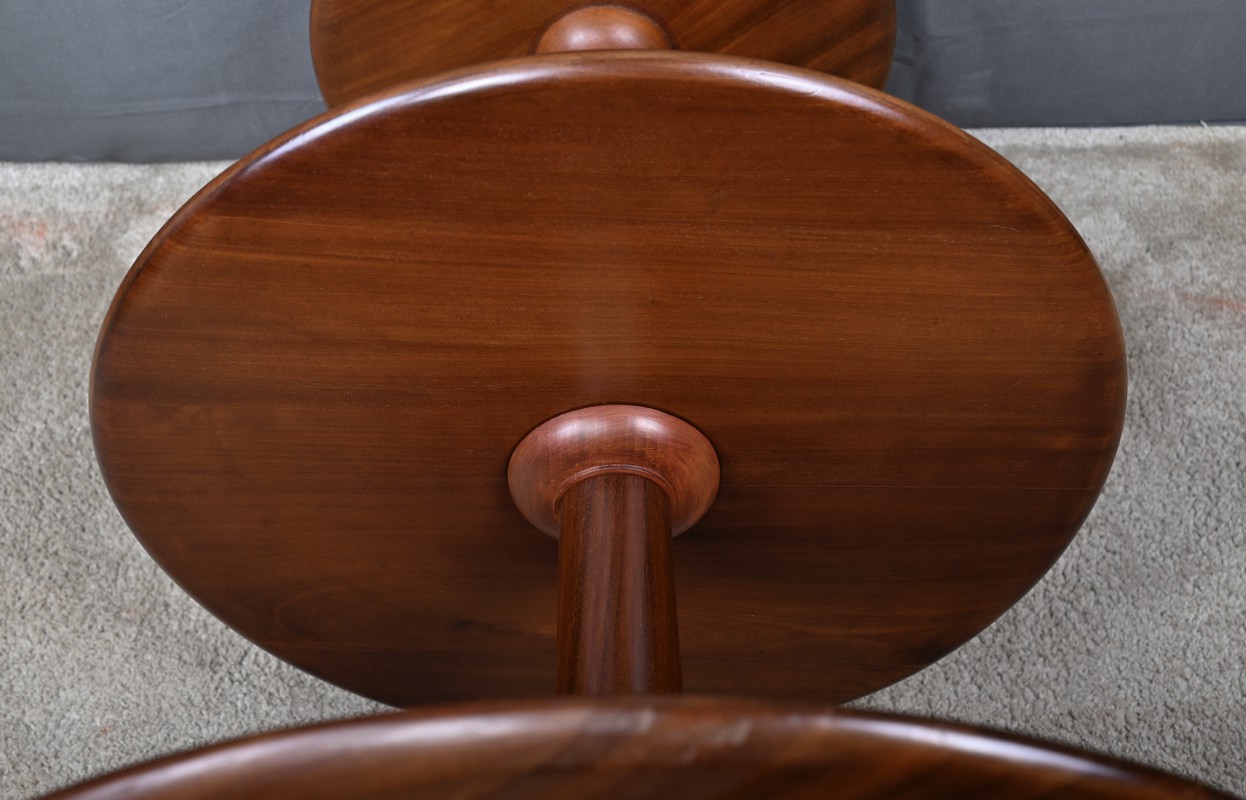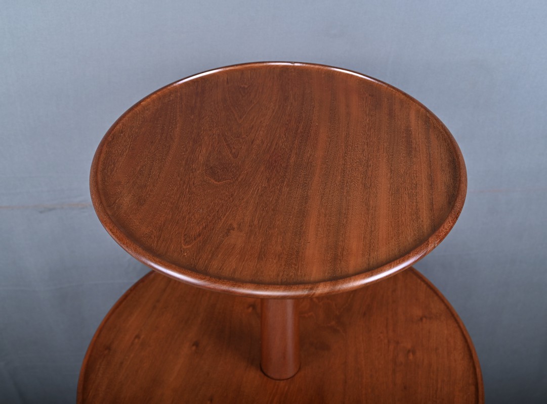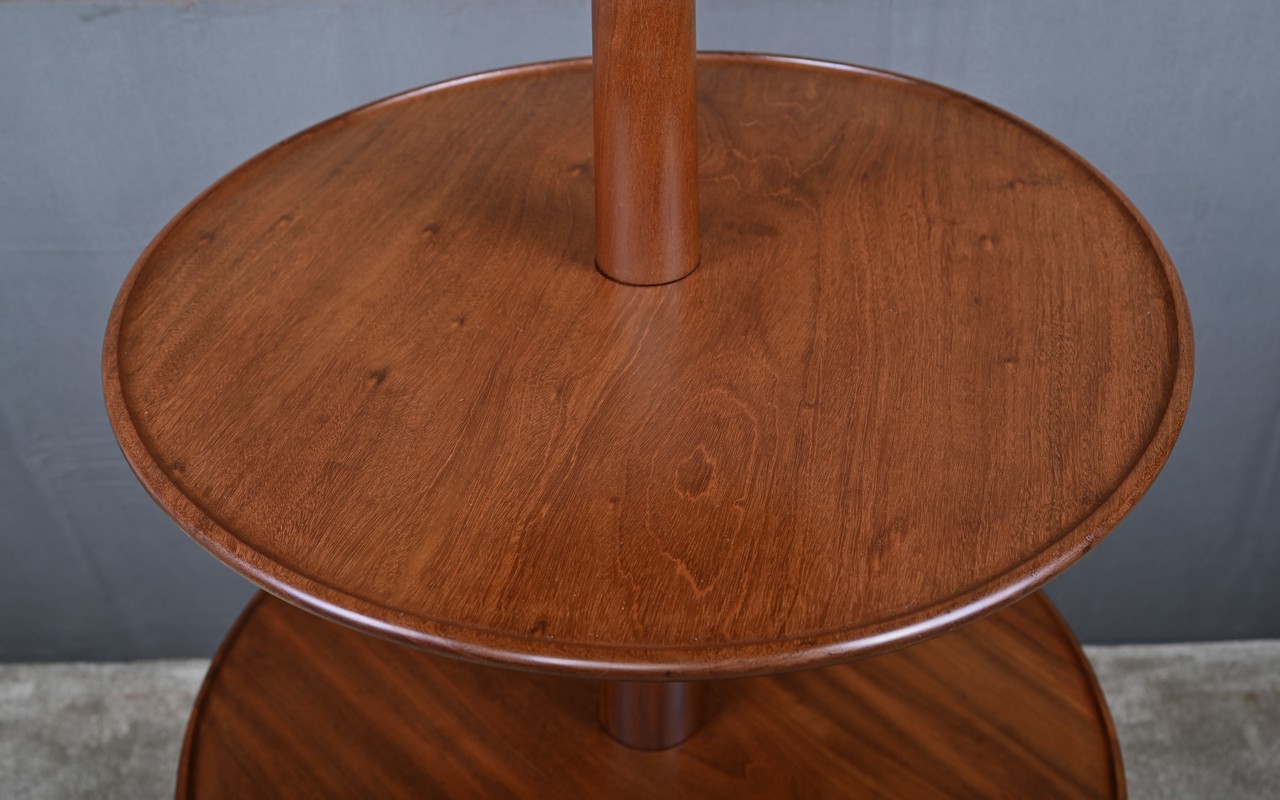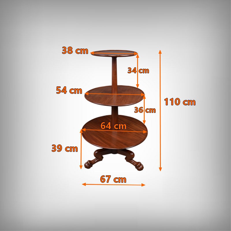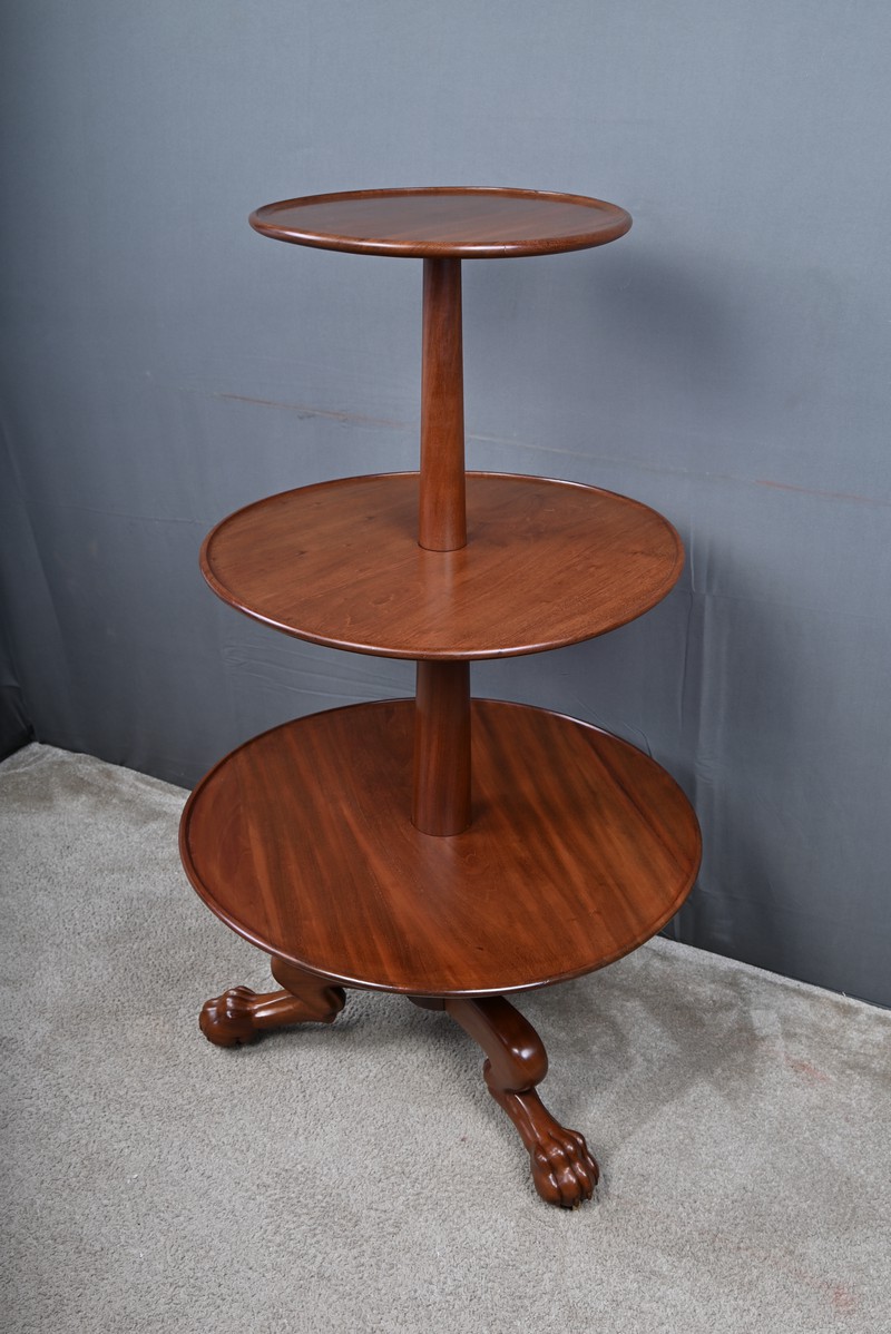 Ce serviteur muet en acajou, typique du style anglais du XIXe siècle, se compose de trois plateaux circulaires en cuvette, tournants et disposés en hauteur selon une structure pyramidale, idéale pour exposer des objets décoratifs ou servir des rafraîchissements.