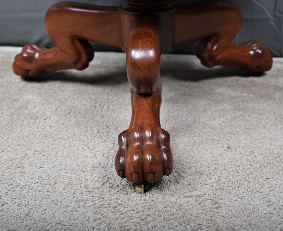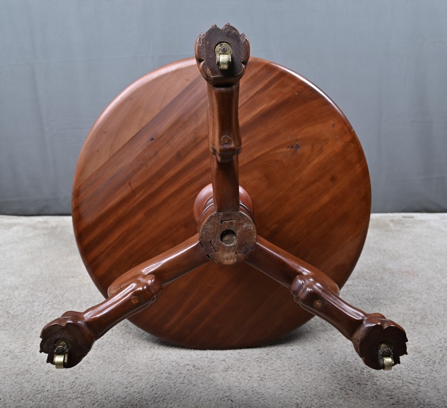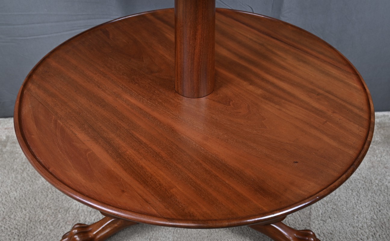 Le fût central, de forme cylindrique et légèrement évasée, soutient l’ensemble avec élégance. Ce guéridon repose sur un piétement tripode finement sculpté, dont les pieds se terminent en griffes de lion, une ornementation emblématique du mobilier néoclassique anglais. Ces pieds sont montés sur des roulettes discrètes, permettant de déplacer la desserte facilement sans compromettre son esthétique.