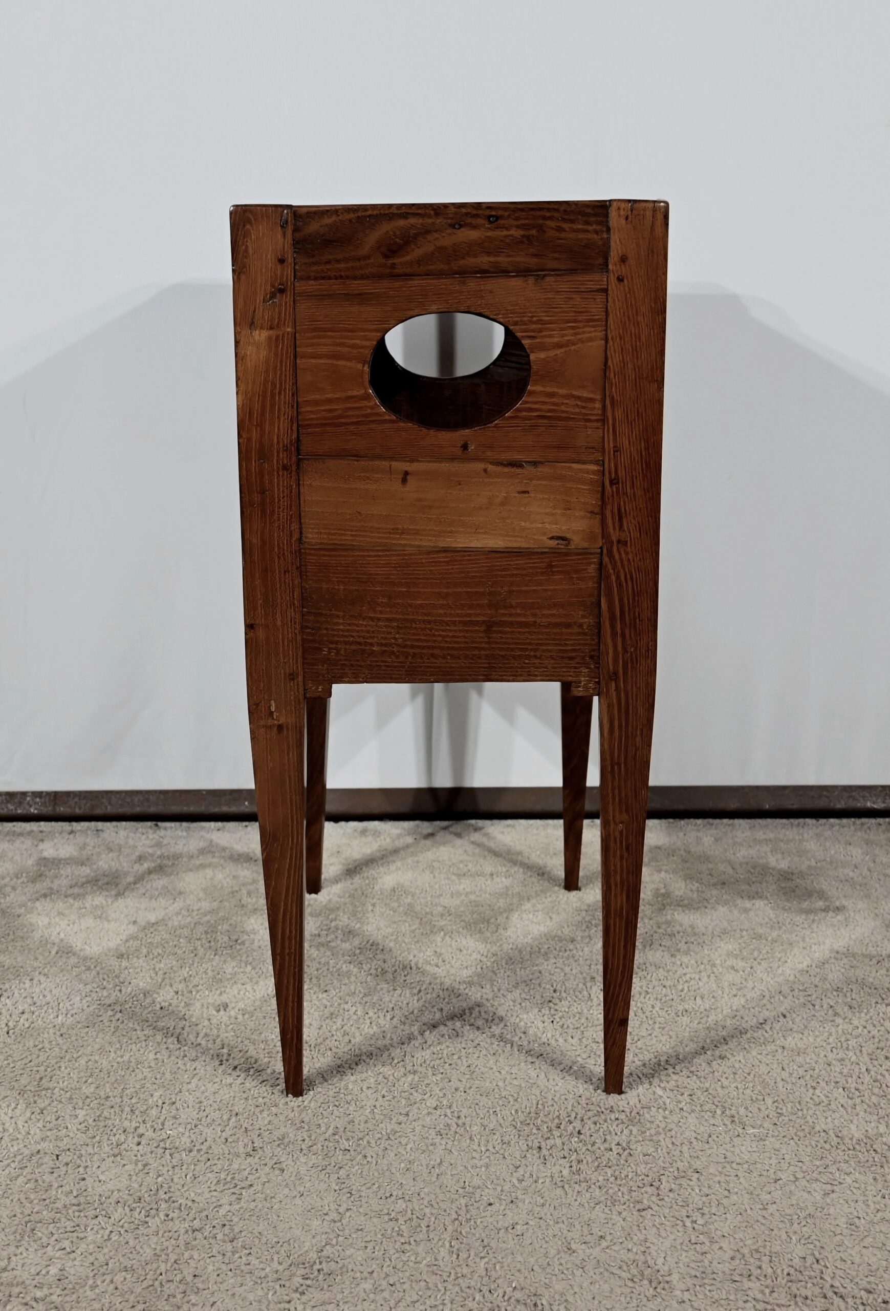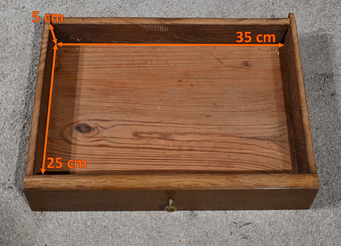 Table à en-cas en chêne massif, dotée d’un caisson formant une grande niche, reposant sur quatre pieds gainés en partie basse et anguleux en partie haute. Les côtés de ce meuble sont ajourés d’un ovale et en façade il possède un tiroir muni d’un bouton de tirage en laiton ciselé.