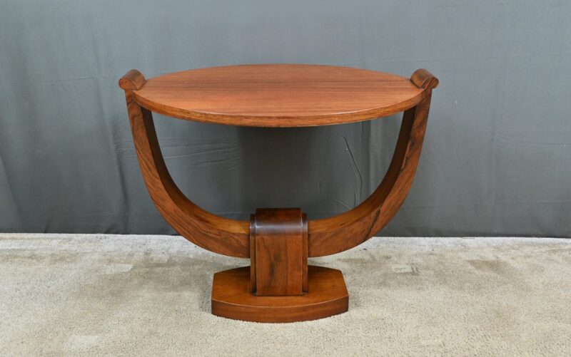 Table à ‘en-cas’ de style Louis XV en noyer et merisier. Elle repose sur 4 pieds cambrés. Son dessus est entouré, sur 3 côtés, d’une galerie chantournée. Époque : fin XIXe