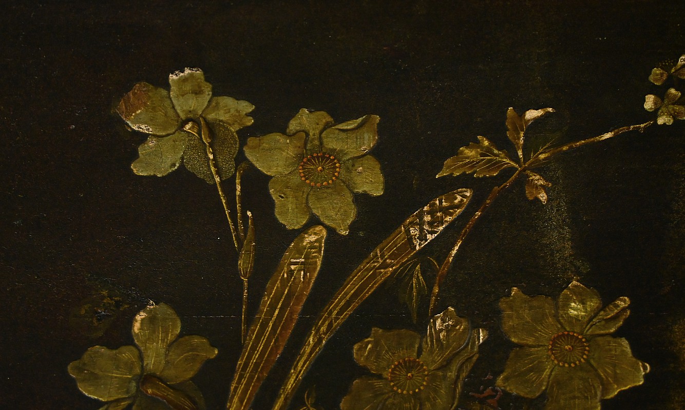 Table d’appoint dotée de deux plateaux mouvementés à décors japonisant en relief d’oiseaux de fleurs et de feuillage. Le grand plateau inférieur est muni de poignées en bronze ciselé. Le piétement en bois laqué est agrémenté d’arabesques dorées suivant les courbes et volutes formant les pieds. Cette table à thé est un pièce raffinée portant les signes de l’âge, parfaite pour une décoration élégante.