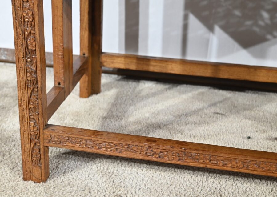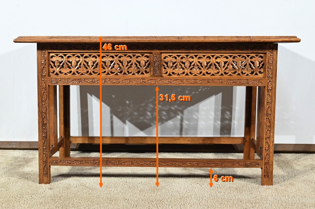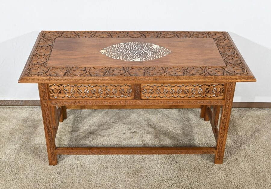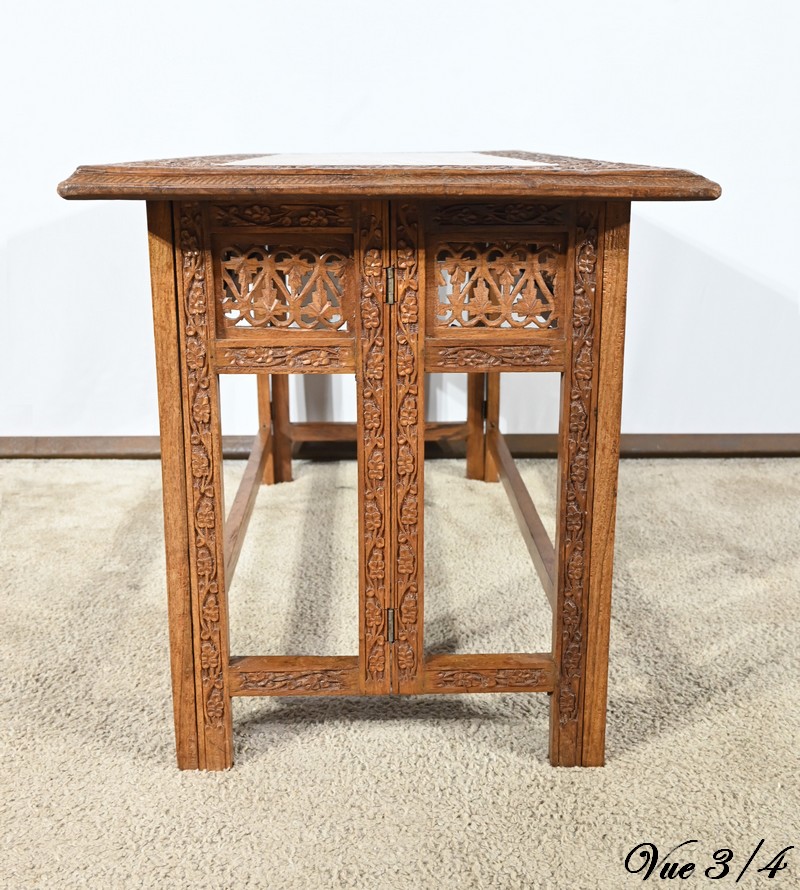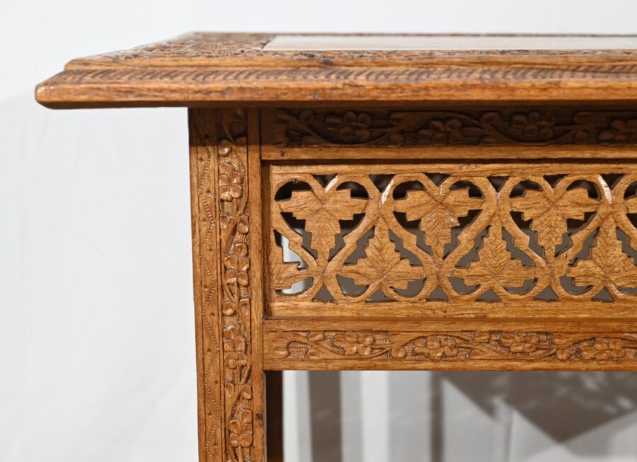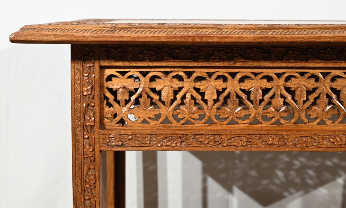 Cette table orientale en bois exotique présente un dessus amovible d’une seule planche, avec cadre généreusement sculpté, à motifs de feuilles de vigne entremêlées de rinceaux et de raisin.