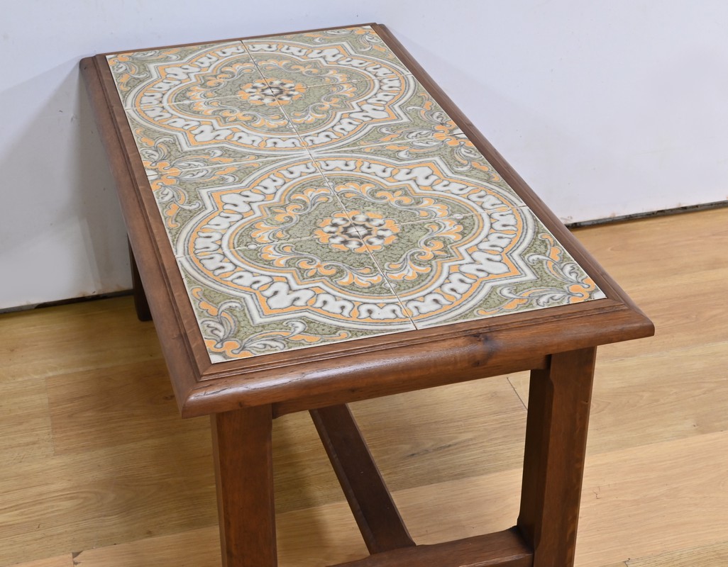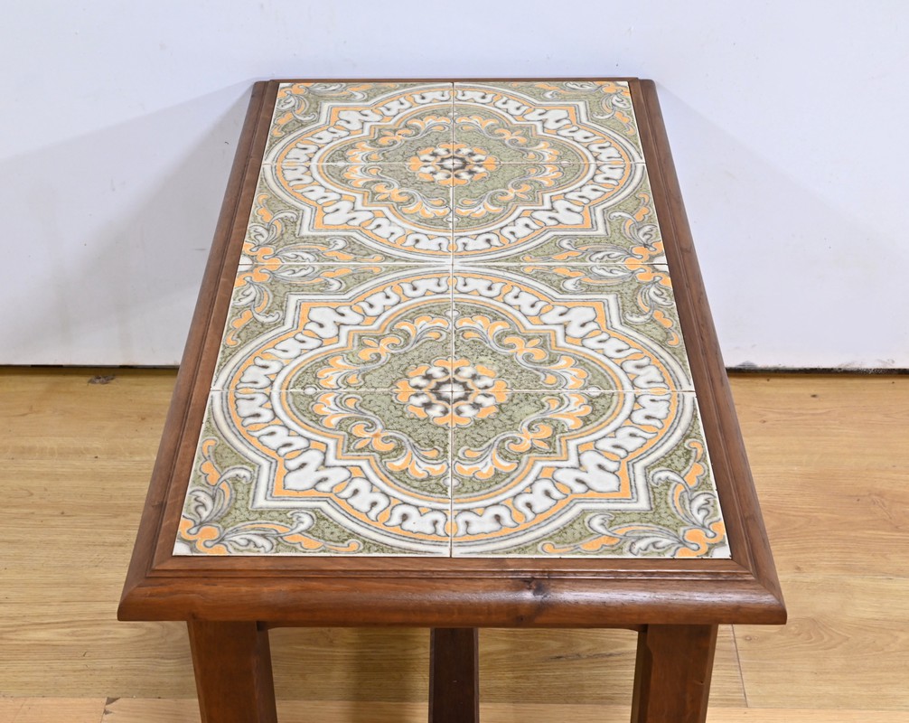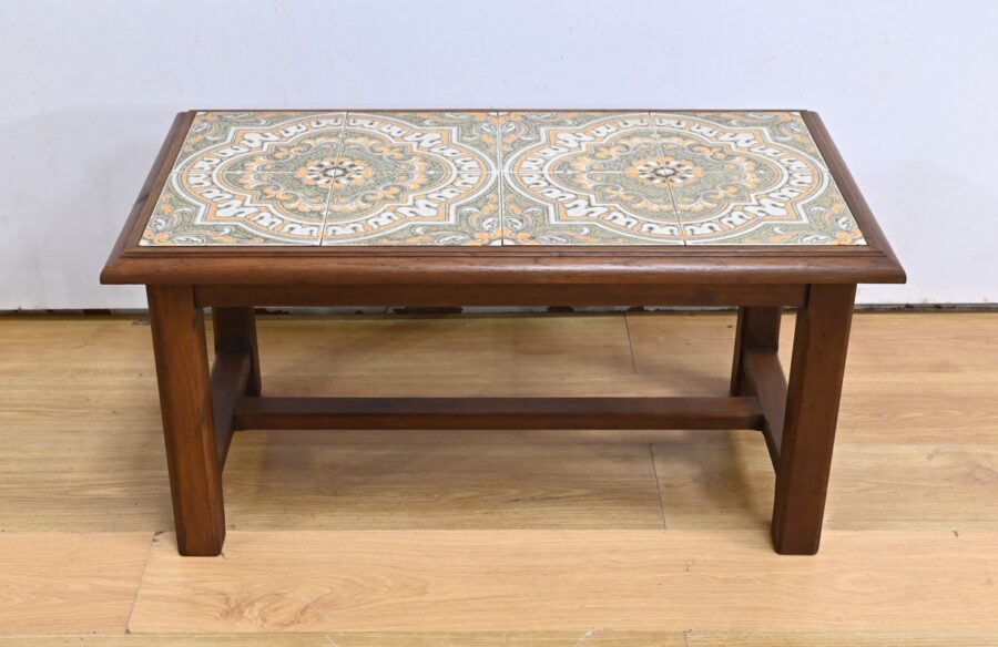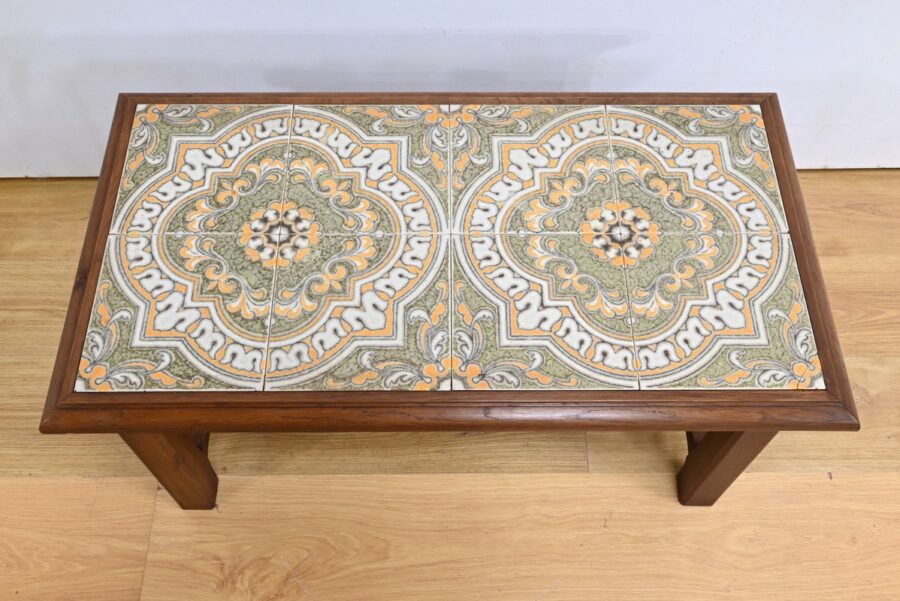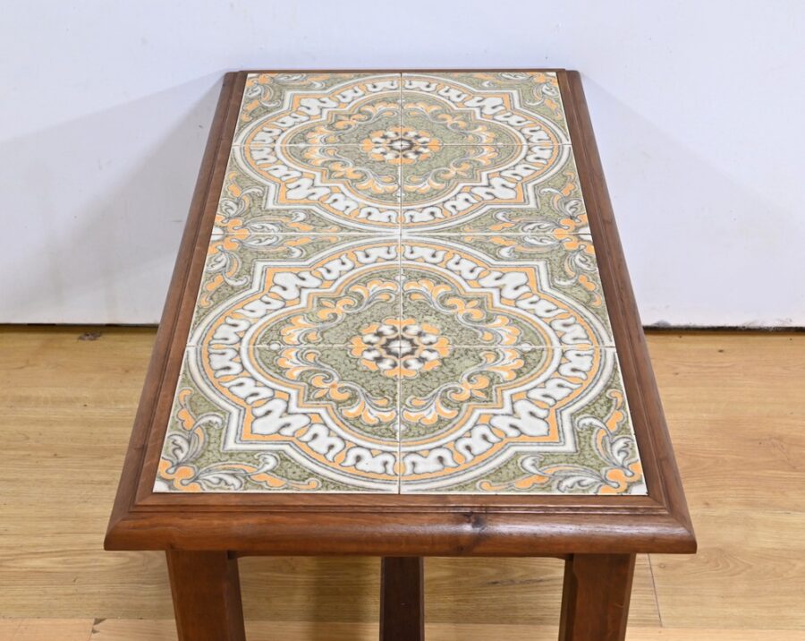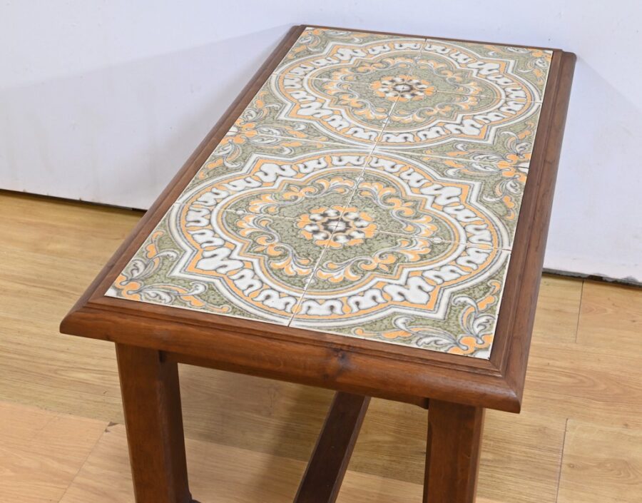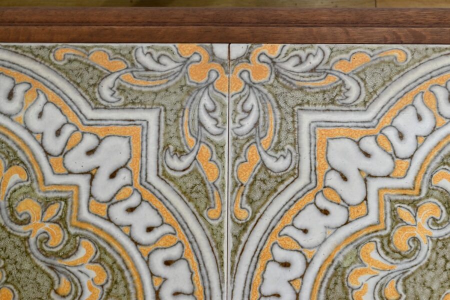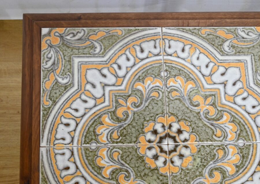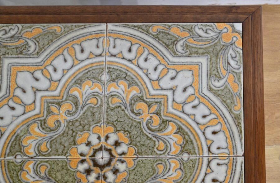 Son plateau est orné de huit carreaux en céramique, formant un dessin complexe de volutes et de rosaces aux couleurs vert tendre et jaune sable sur fond blanc. A noter toutefois que l’un des carreaux est cassé dans l’un de ses angles (voir photo 7).