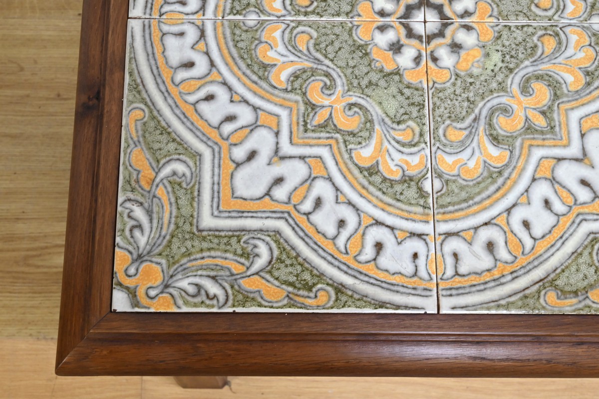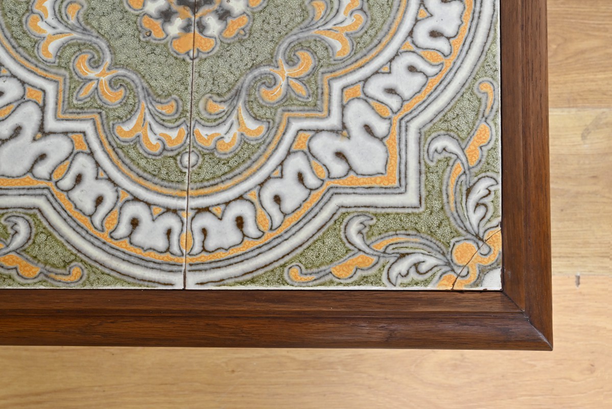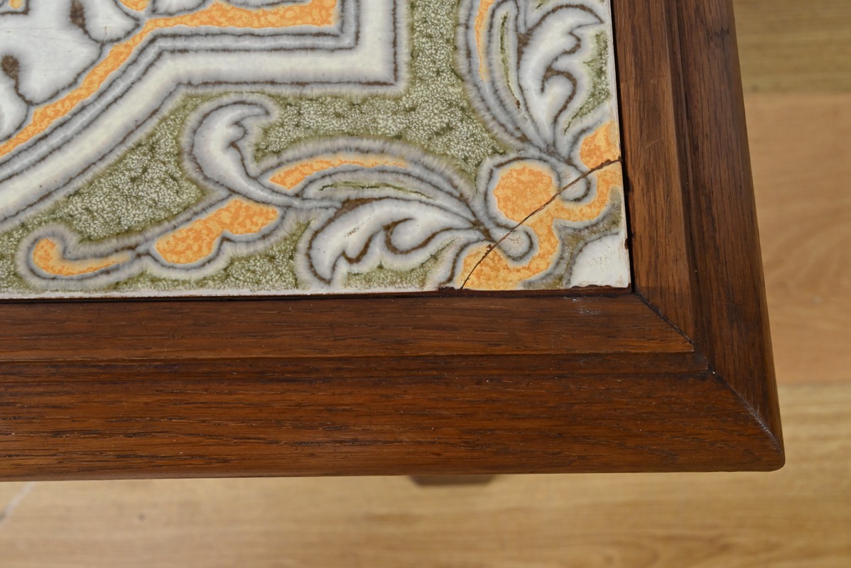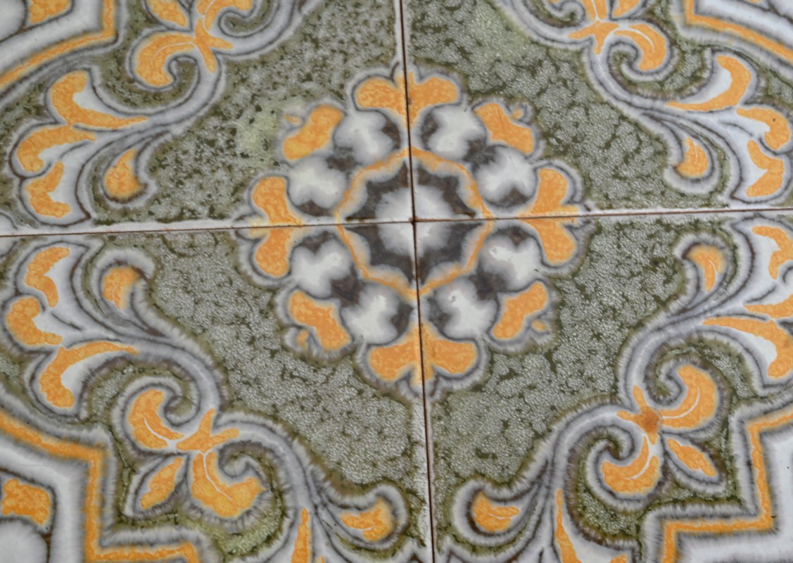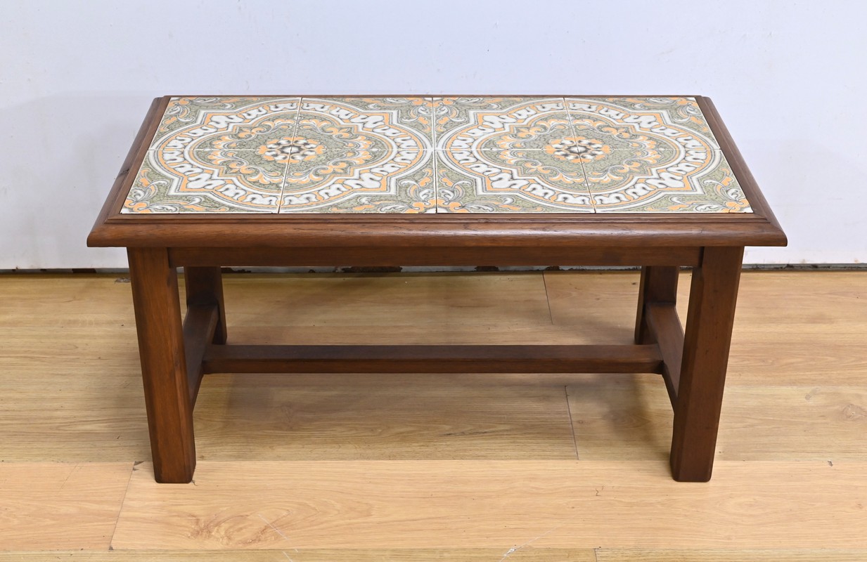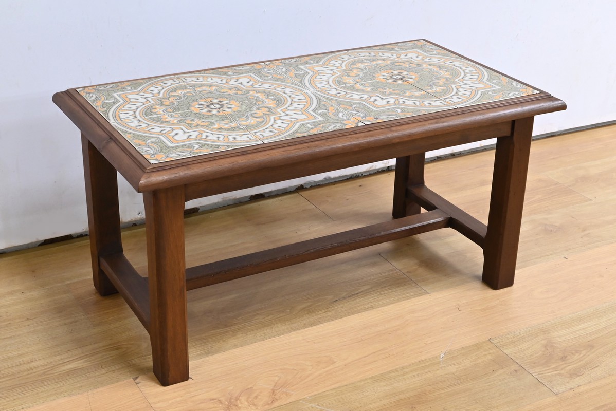 Son plateau est orné de huit carreaux en céramique, formant un dessin complexe de volutes et de rosaces aux couleurs vert tendre et jaune sable sur fond blanc. A noter toutefois que l’un des carreaux est cassé dans l’un de ses angles (voir photo 7).