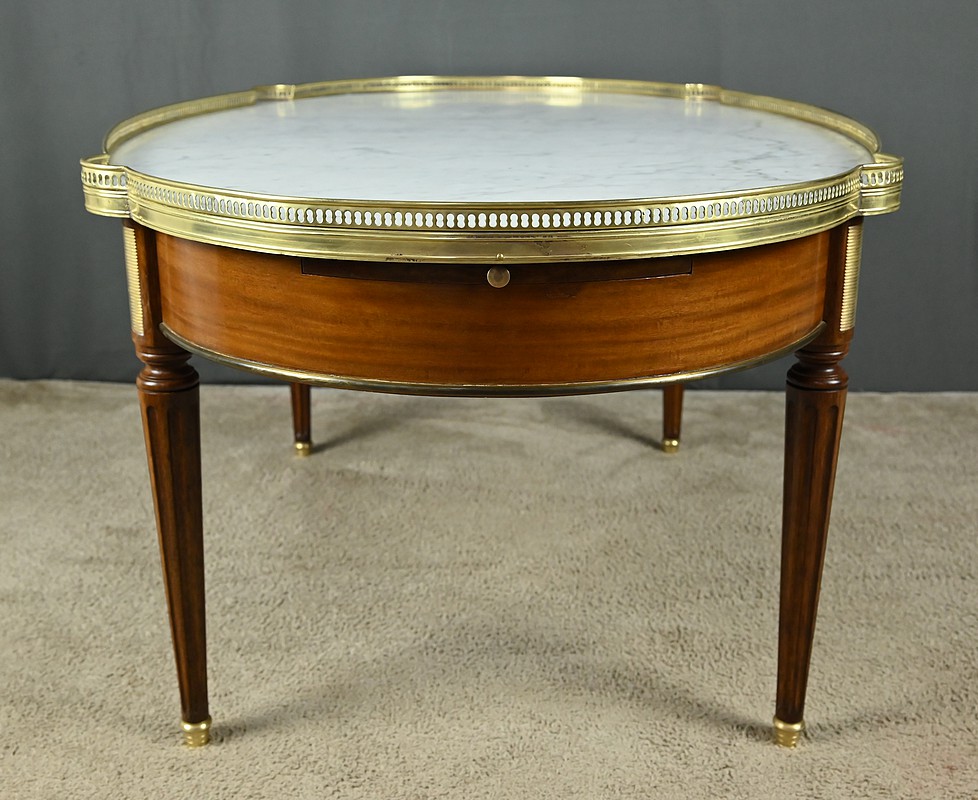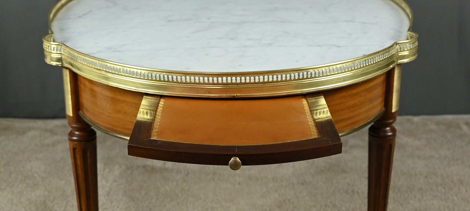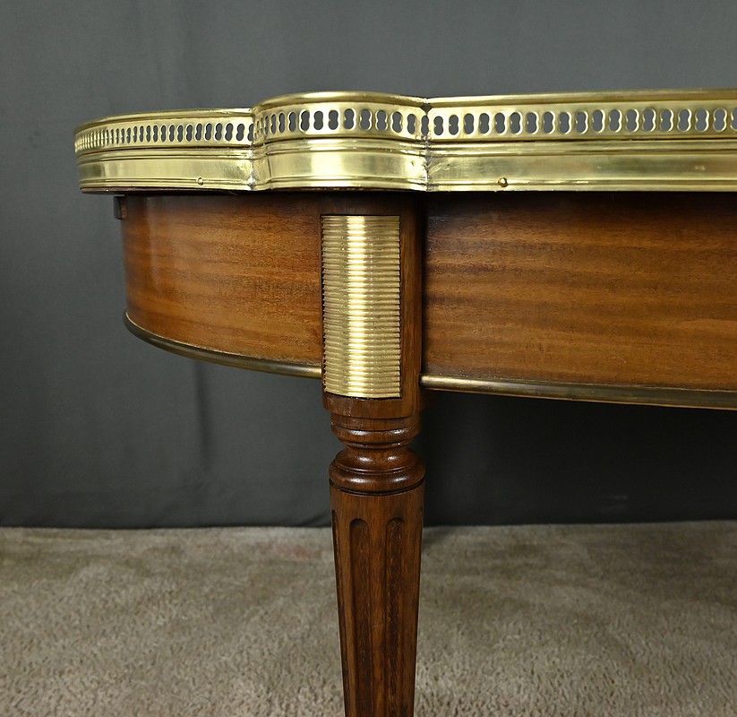 Charmante table basse de style Louis XVI datant du début du XXe siècle. Cette table de forme ovale bénéficie d’un placage d’acajou en ceinture. Elle ouvre par un tiroir central à l’avant et un autre à l’arrière. Elle est également munie de deux tirettes latérales, toutes dotées de boutons de tirage en laiton. Ces dernières sont garnies d’un cuir fauve souligné d’une vignette dorée.