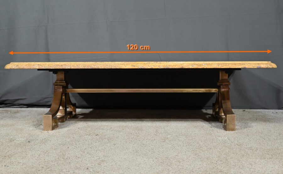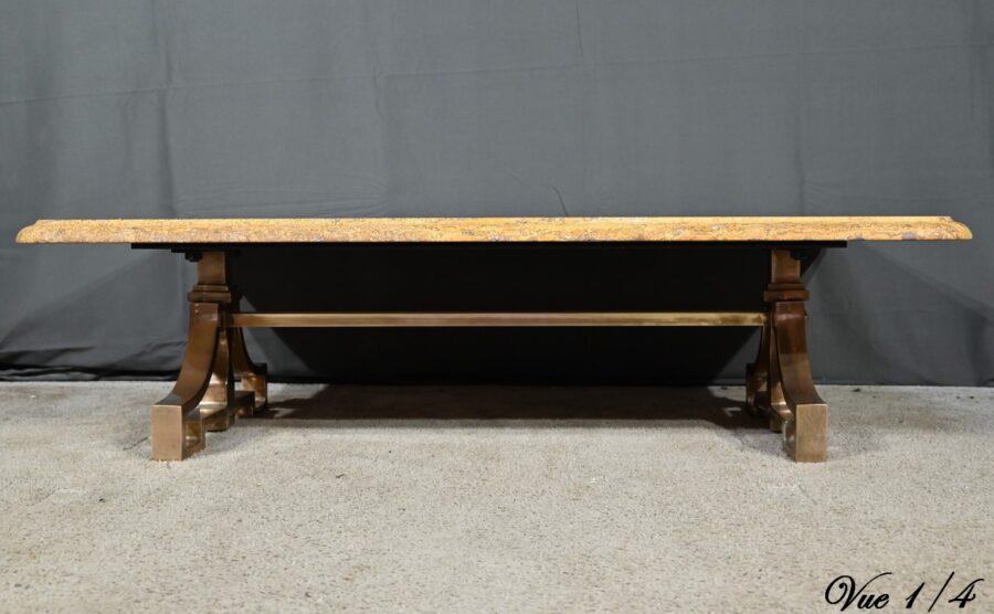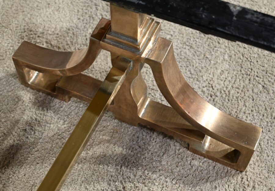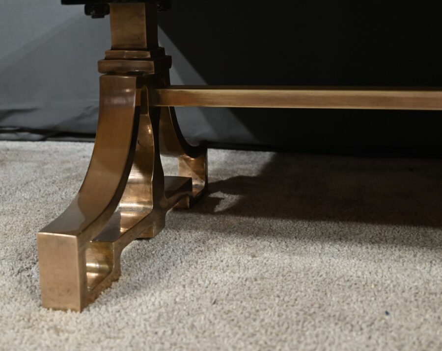 Celui-ci repose sur un cadre en fer forgé se profilant sur un piétement en laiton massif avec barre d’entretoise.