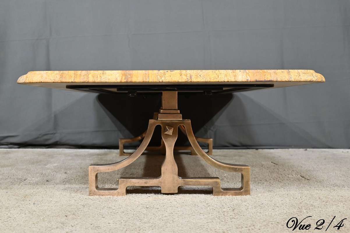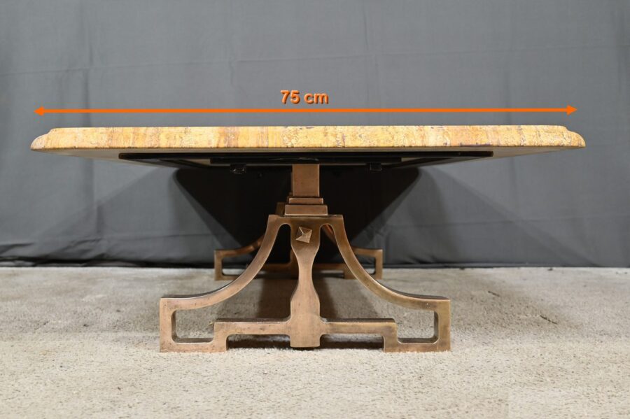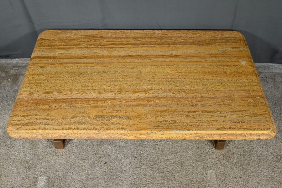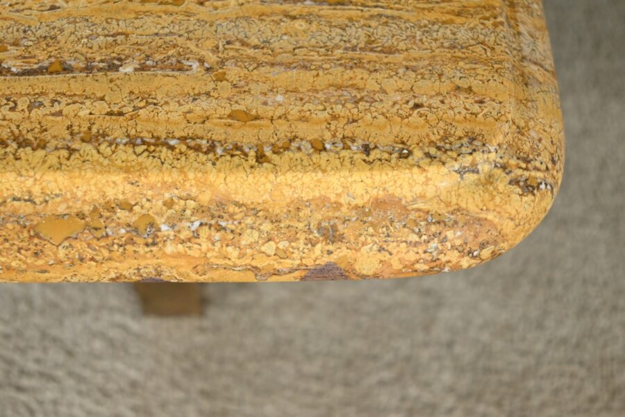 Cette table basse se compose d’un épais plateau de travertin jaune à bec de corbin.