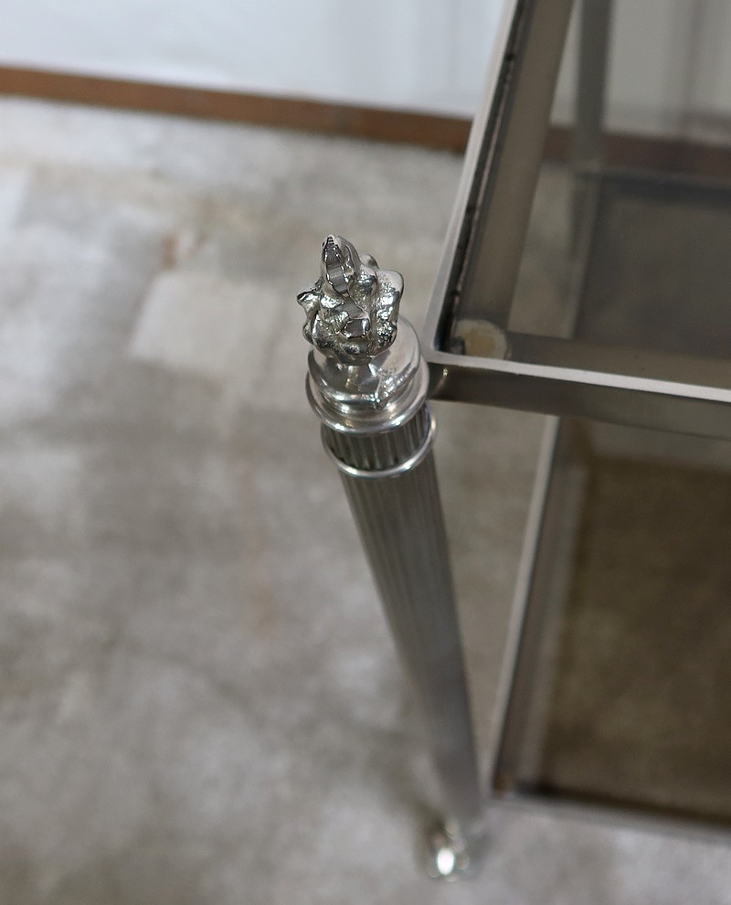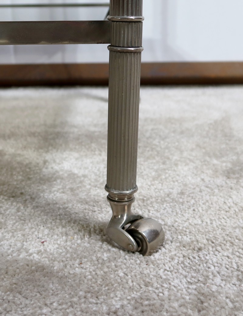 Ces pieds en métal nickelé sont sommés en partie haute d’un flambeau. Ils sont ciselés de fines cannelures et reposent sur des roulettes de qualité.