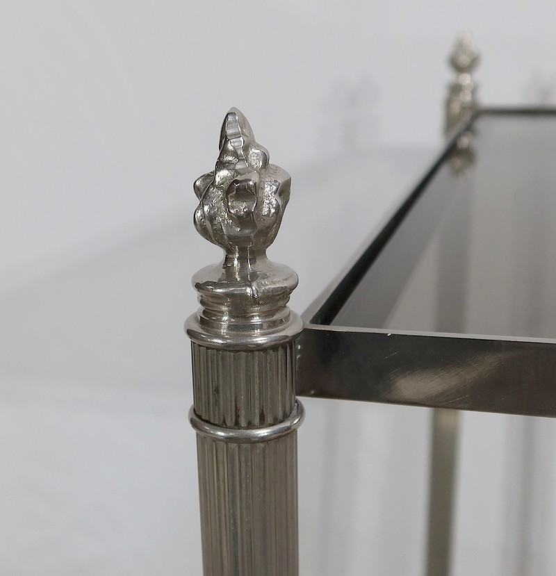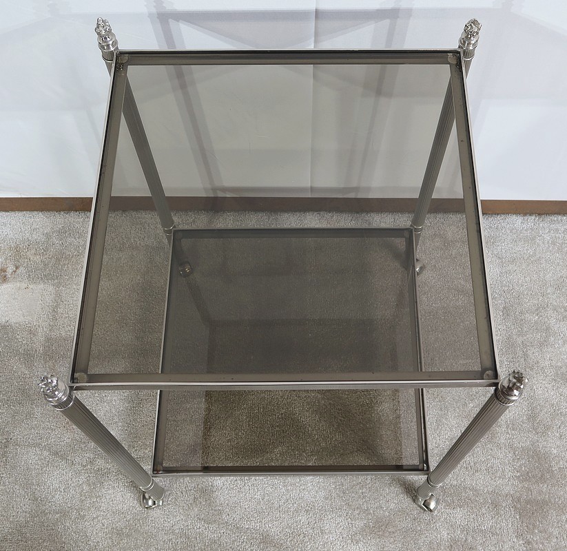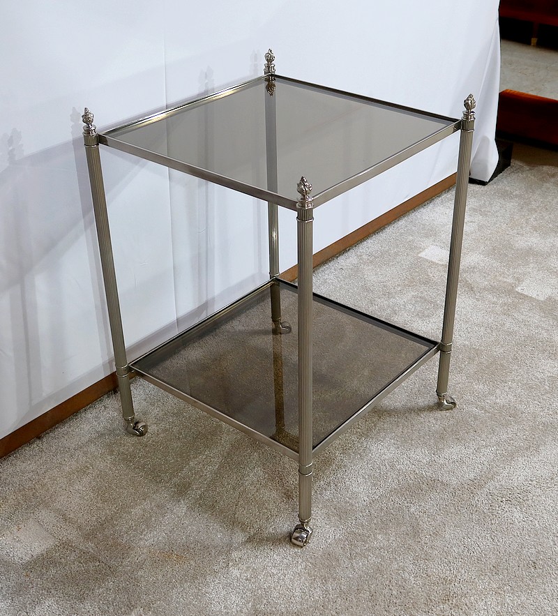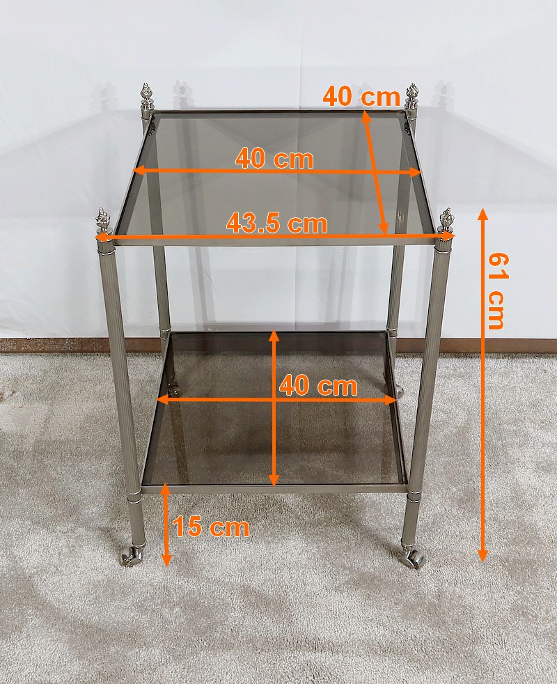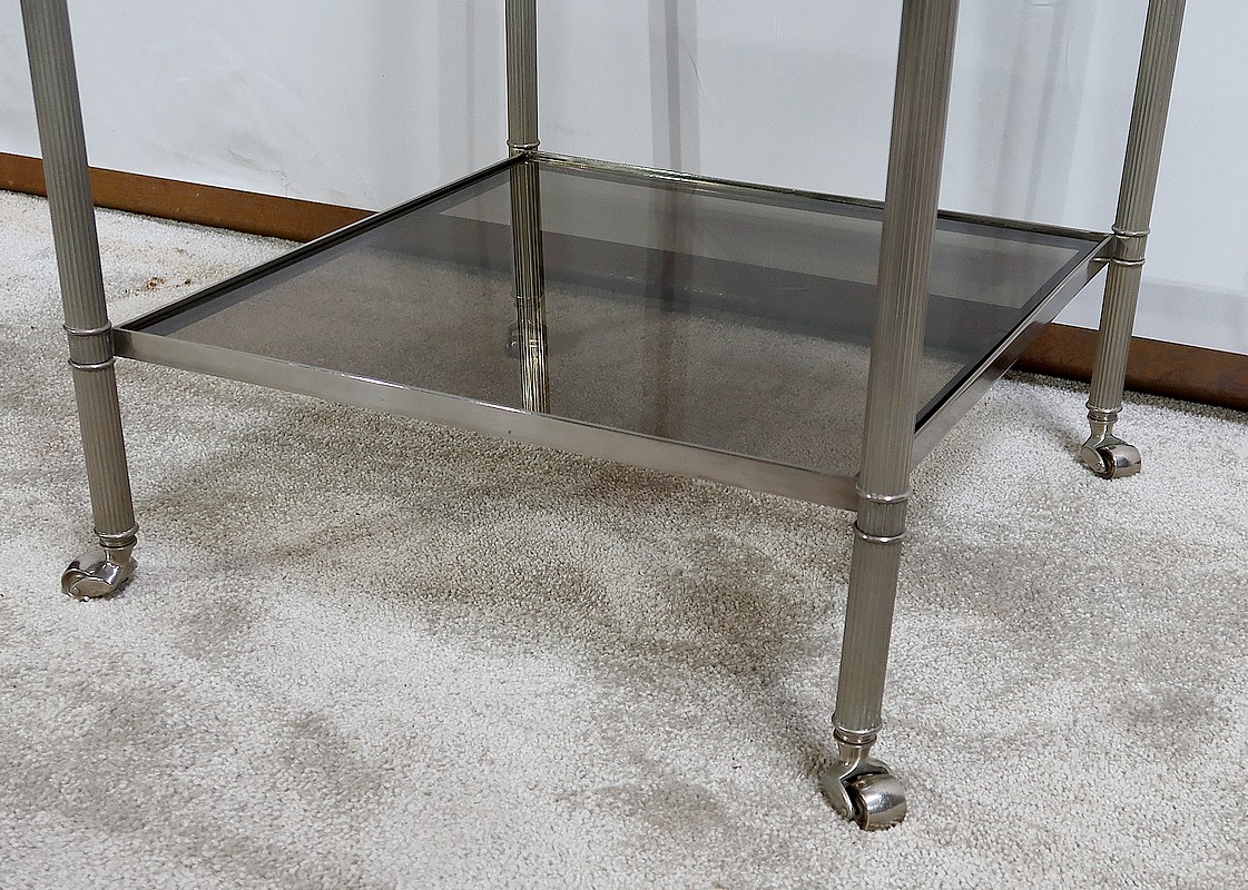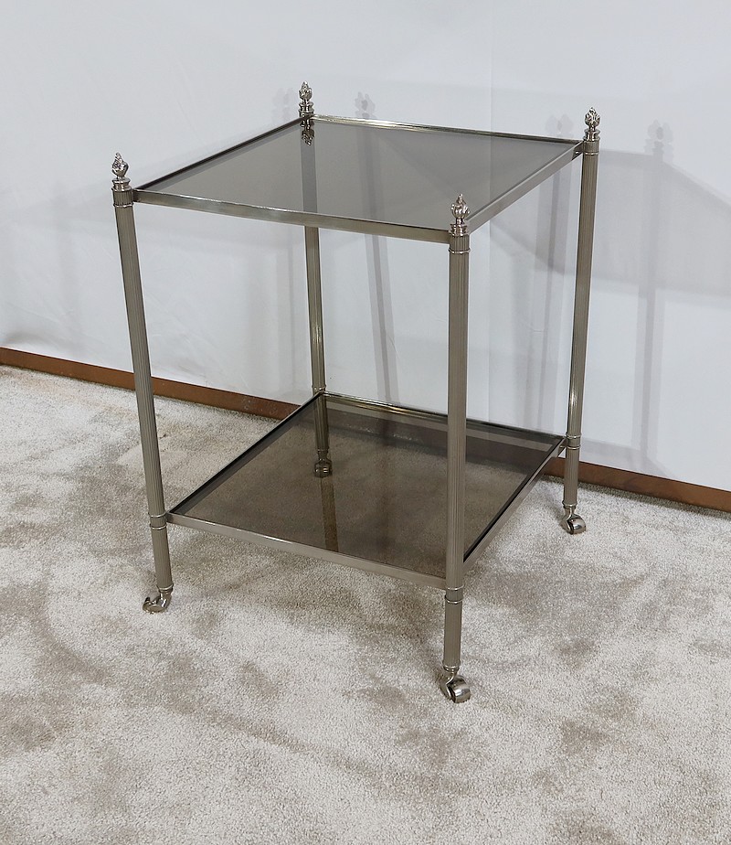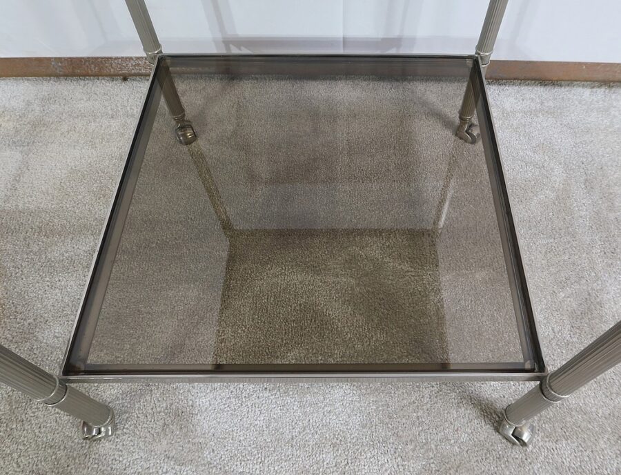 Cette table de section carrée des années 1940, de la Maison Française Jansen, se caractérise par ses deux plateaux en verre fumé en parfait état. Ceux-ci sont sertis dans un encadrement épuré et maintenus par quatre pieds sur roulettes.