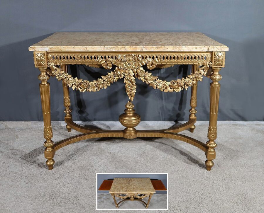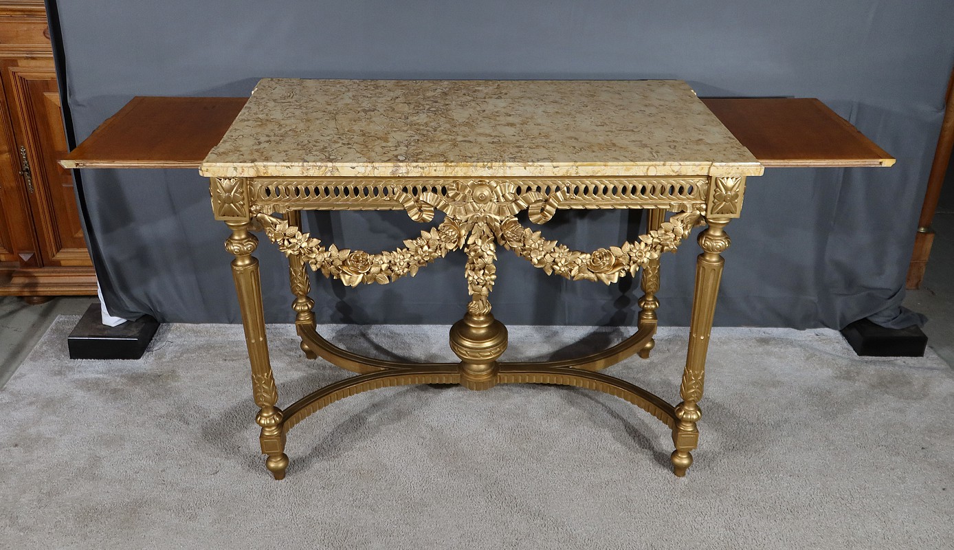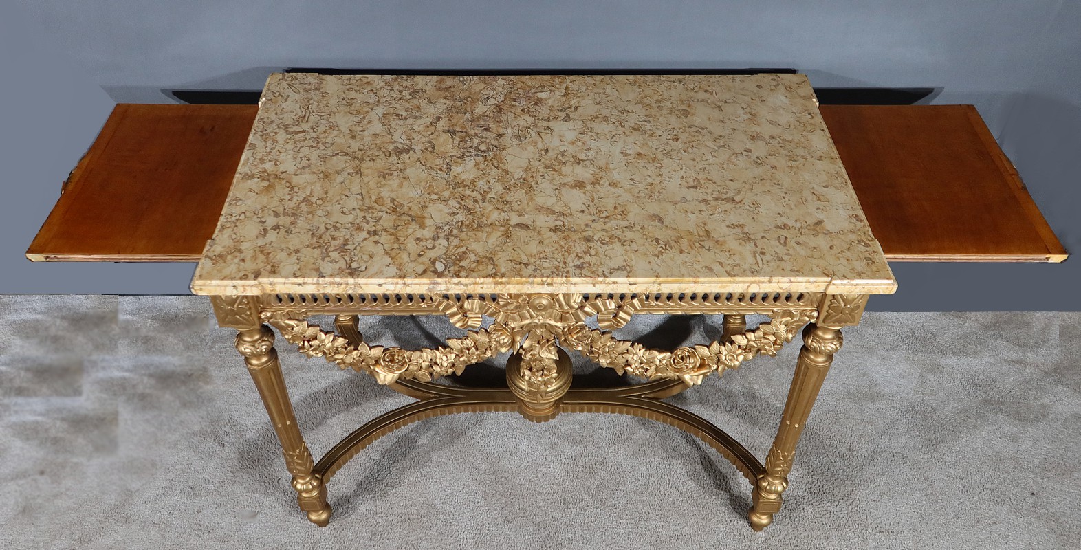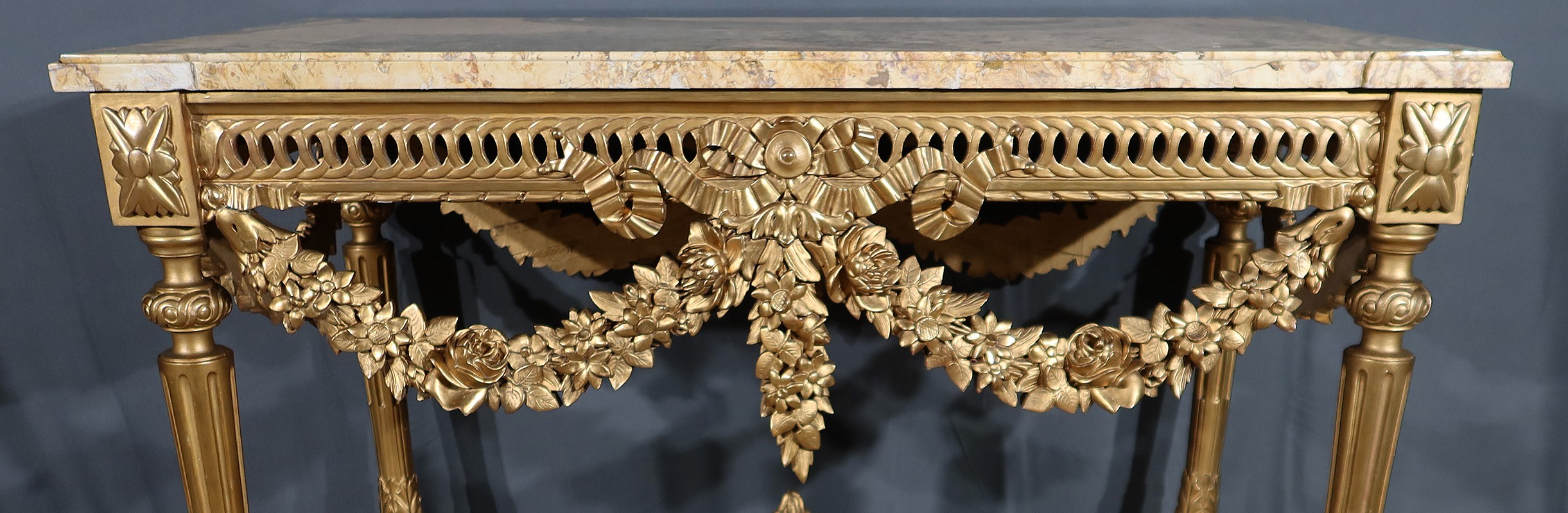 Belle console Louis XVI en bois doré, toutes faces, sommée d’un marbre Brocatelle Jaune du Jura. Ce dernier est entouré d’une gorge et doté d’angles en ressaut. Il repose sur une ceinture sculptée et ajourée, garnie en son centre d’un large nœud louis XVI qui semble retenir une importante guirlande de fleurs accompagnées de feuillage dense. Ce meuble possède la particularité d’être équipé de tirettes latérales agrandissant la surface de la console. Cette dernière repose sur des pieds sculptés de cannelures et de motifs en saillie. En partie haute, des rosaces dans des cartouches ornent chaque angle de la console. En partie basse, une entretoise sculptée formant un X est accompagnée d’une grande urne sommée d’une flamme.
