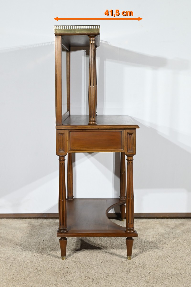 Les pieds en fuseau à cannelures arrêtées et asperges en bois sont réunis par une tablette d’entretoise concave moulurée en carré et bec de corbin dans son pourtour.