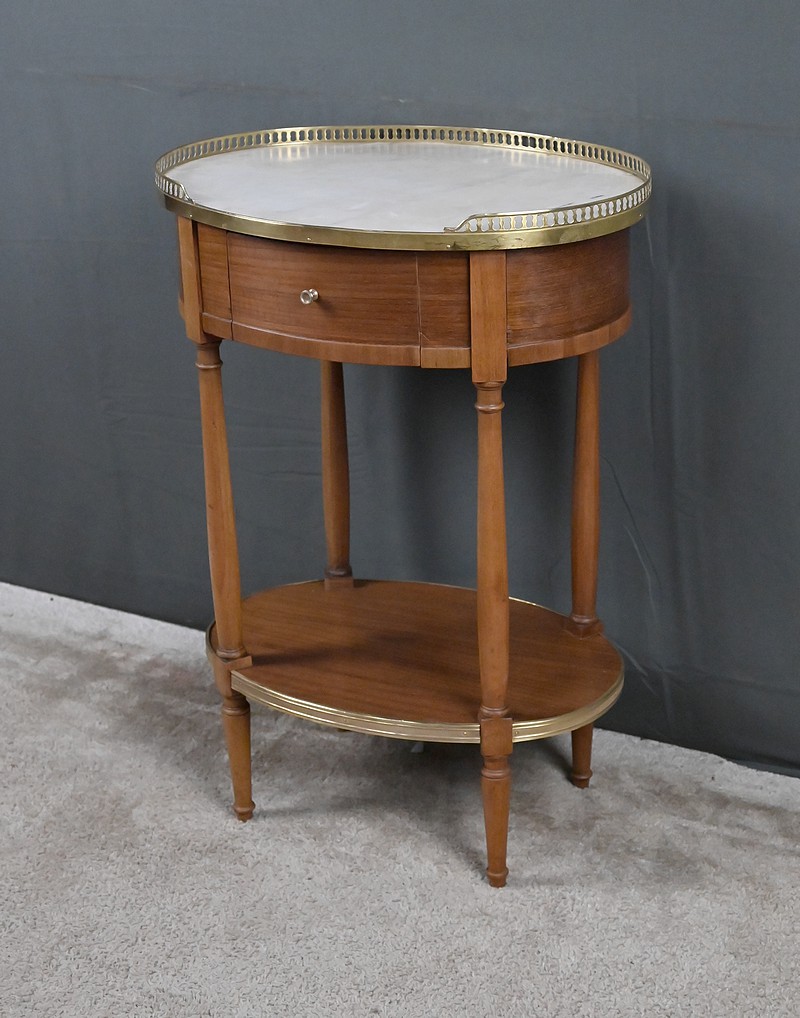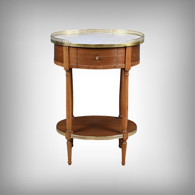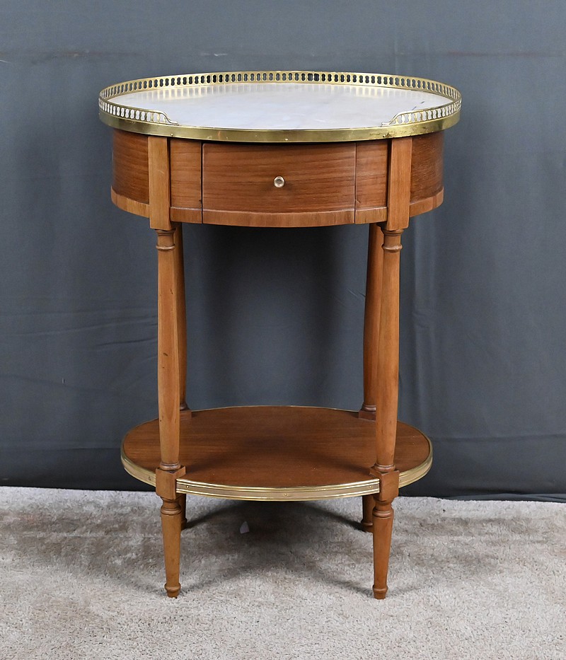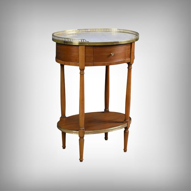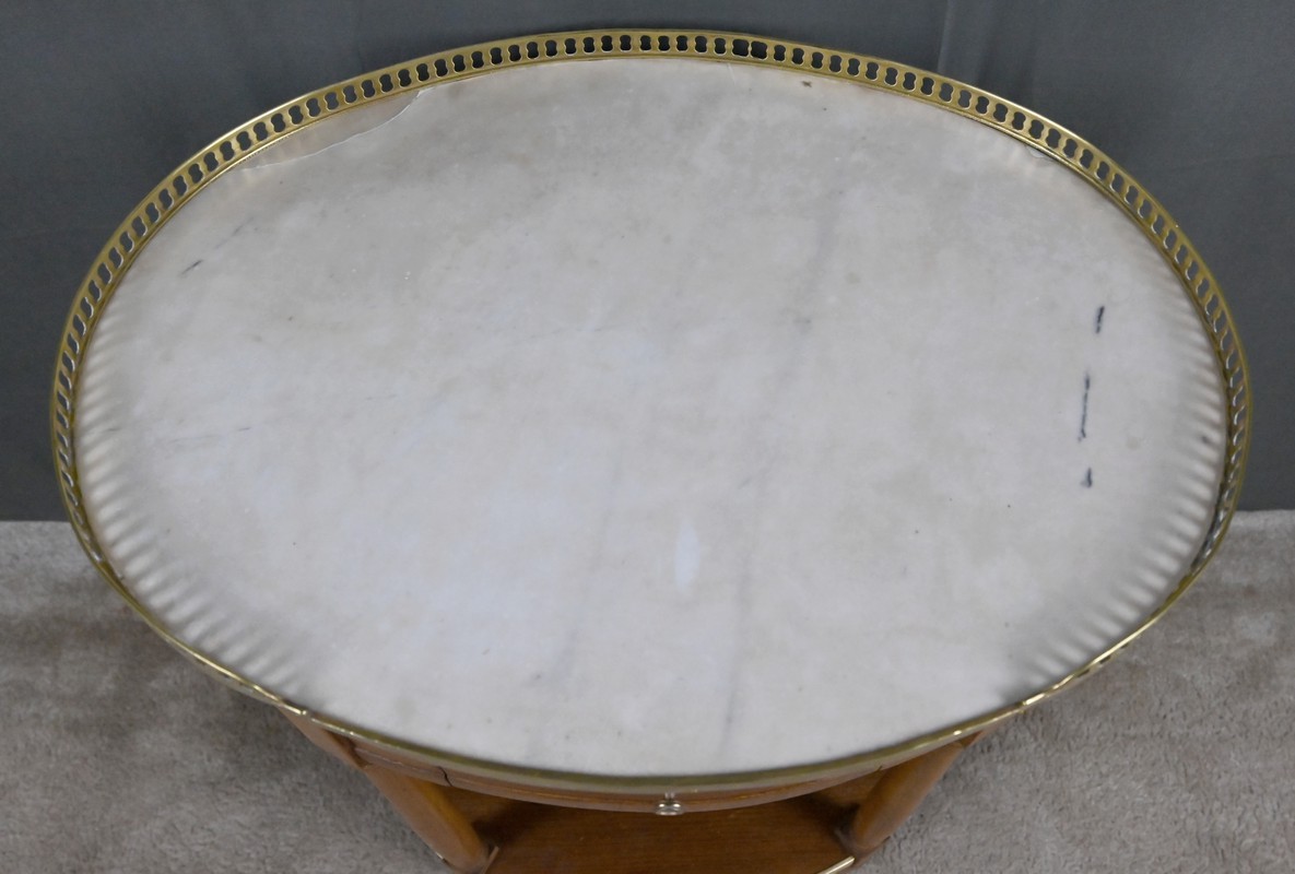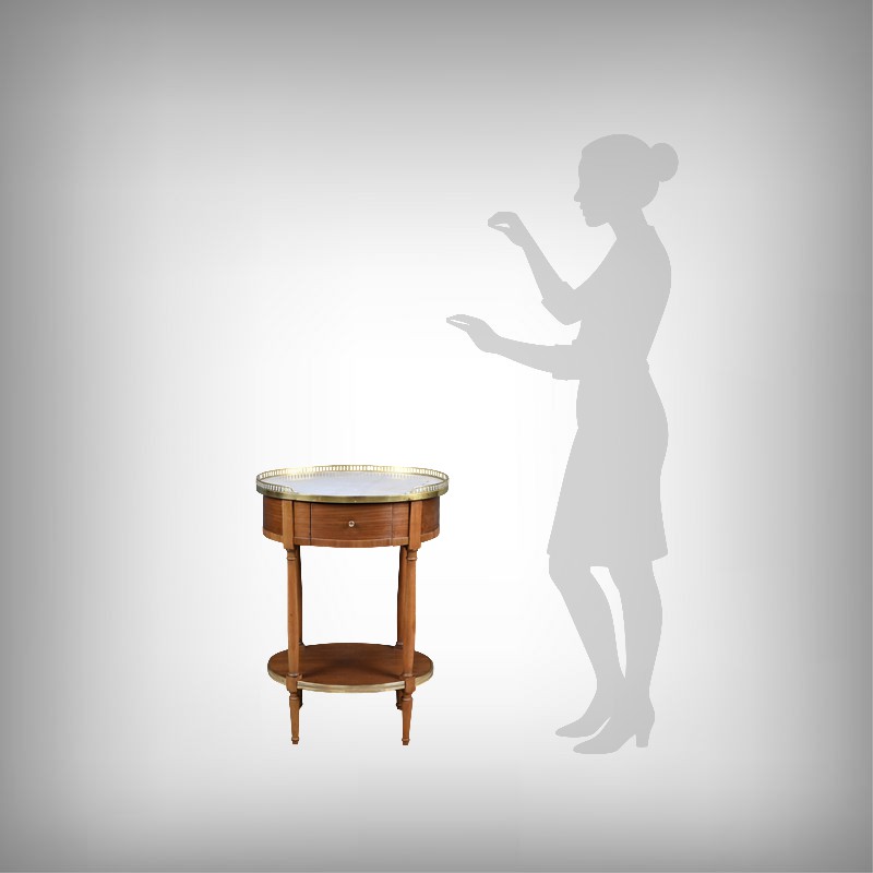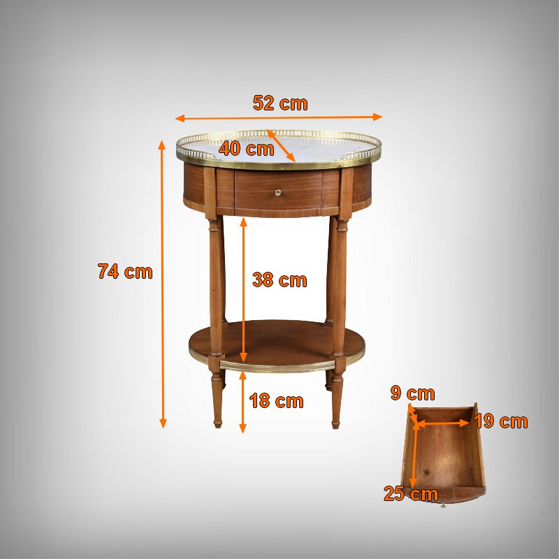 Cette petite table de salon ovale en acajou et placage d’acajou, réalisée dans le goût raffiné du style Louis XVI, séduit par l’harmonie de ses proportions et la qualité de ses matériaux. Son plateau est orné d’un marbre blanc de Carrare, lumineux et délicatement veiné (une restauration visible), ceint d’une galerie ajourée en laiton finement travaillée qui souligne son caractère précieux. La ceinture accueille un tiroir discret, parfaitement intégré, muni d’un petit bouton en laiton qui ajoute une touche de sophistication supplémentaire. L’ensemble repose sur quatre pieds fuselés élégamment tournés, typiques de l’esthétique néoclassique, reliés par une tablette d’entrejambe entourée d’une bande moulurée en laiton qui reprend les codes décoratifs du meuble et renforce son allure équilibrée. Pièce de milieu aussi décorative que fonctionnelle, elle incarne le charme intemporel du mobilier du XIXᵉ siècle et apporte à tout intérieur une note de distinction et de raffinement.