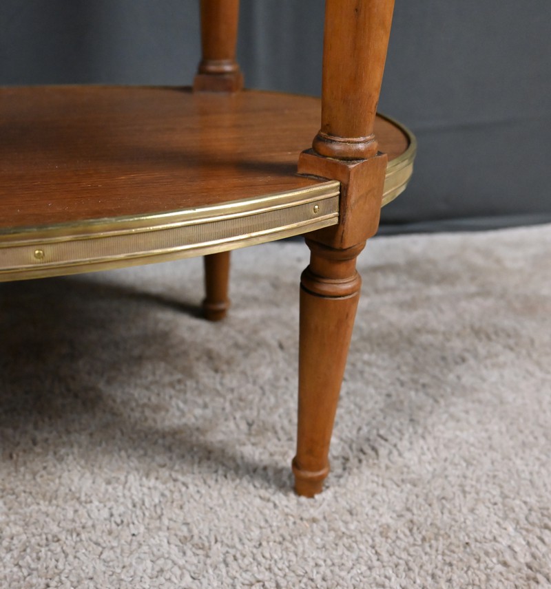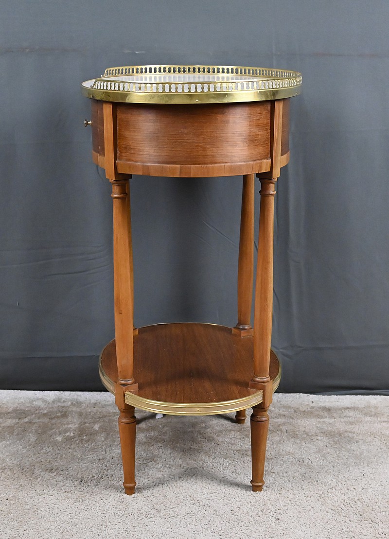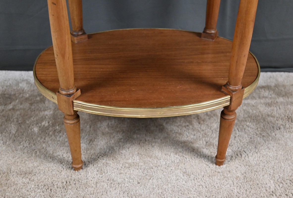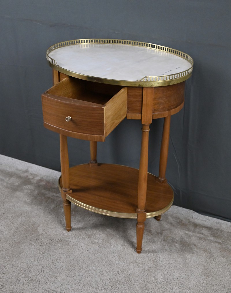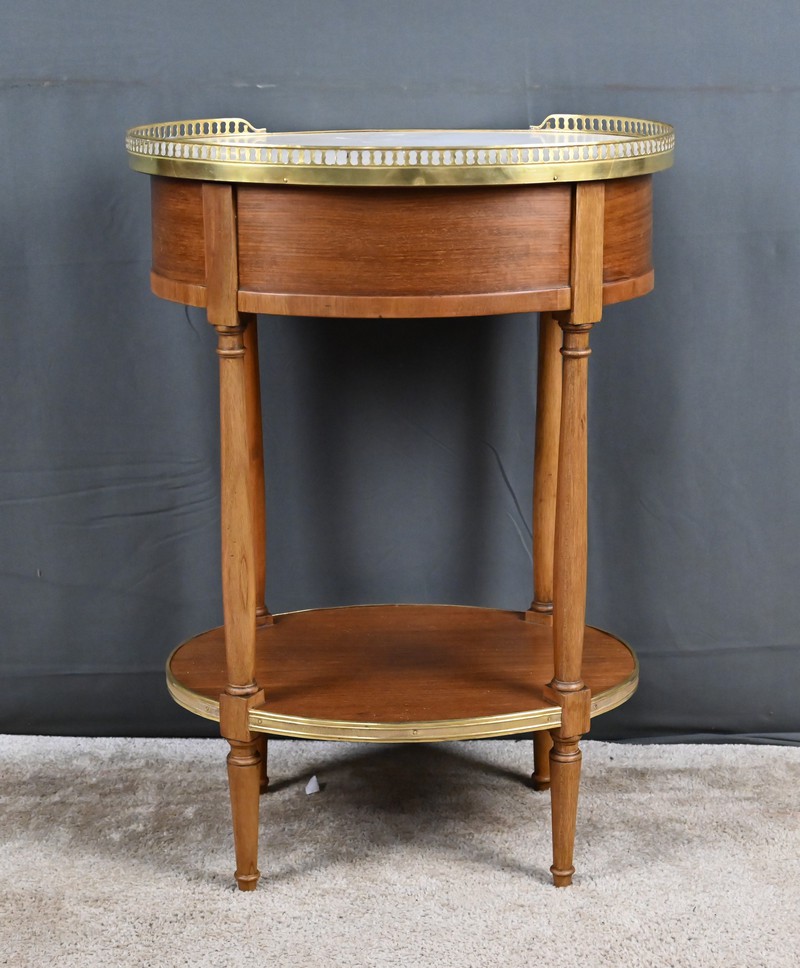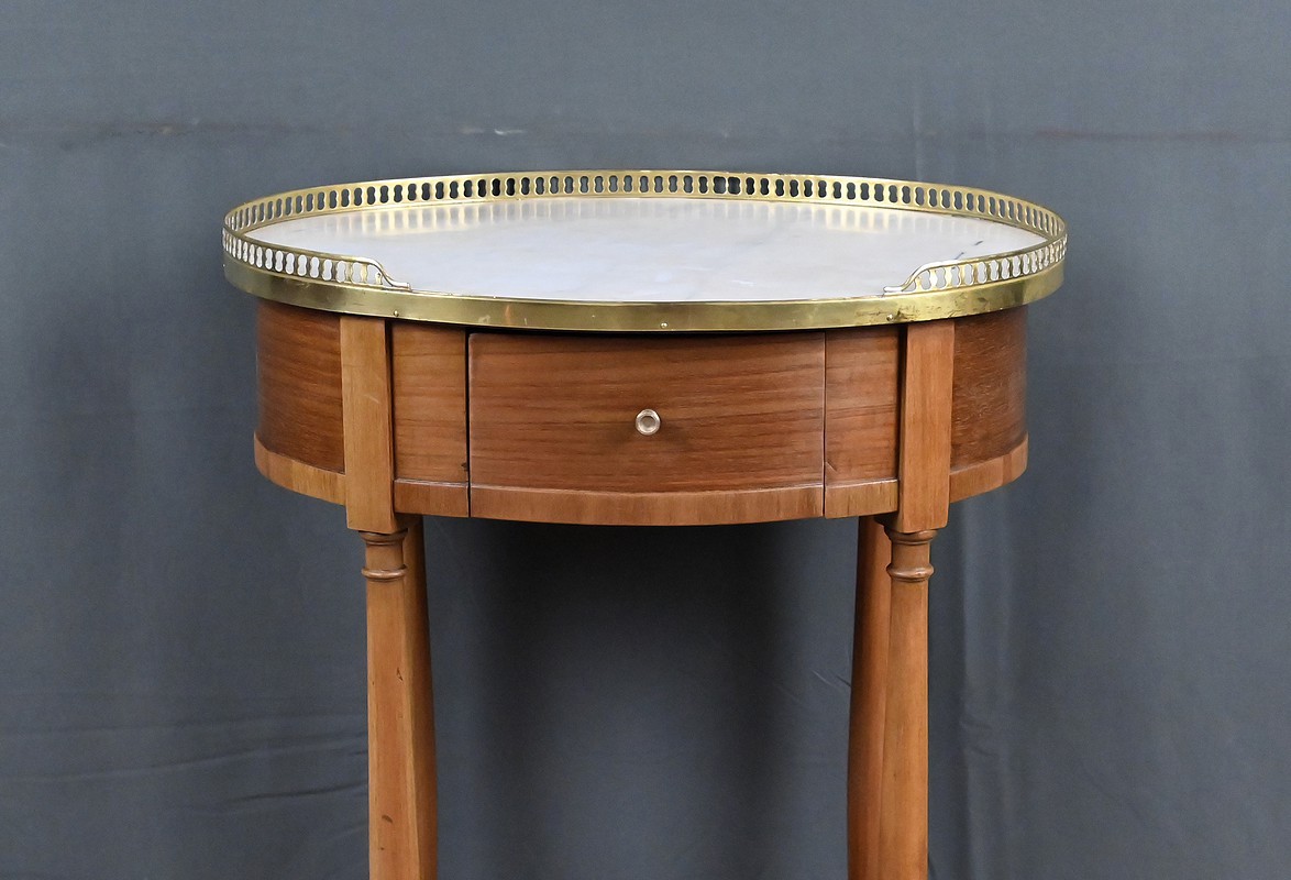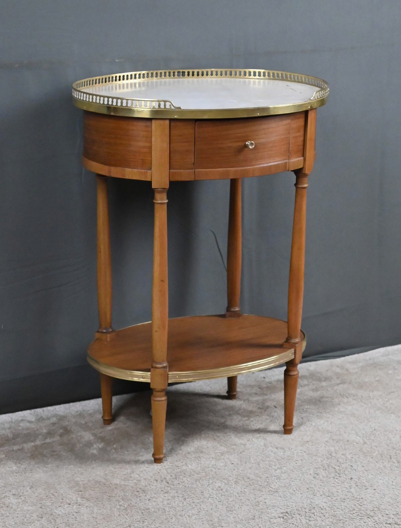 Cette petite table de salon ovale en acajou et placage d’acajou, réalisée dans le goût raffiné du style Louis XVI, séduit par l’harmonie de ses proportions et la qualité de ses matériaux. Son plateau est orné d’un marbre blanc de Carrare, lumineux et délicatement veiné (une restauration visible), ceint d’une galerie ajourée en laiton finement travaillée qui souligne son caractère précieux. La ceinture accueille un tiroir discret, parfaitement intégré, muni d’un petit bouton en laiton qui ajoute une touche de sophistication supplémentaire. L’ensemble repose sur quatre pieds fuselés élégamment tournés, typiques de l’esthétique néoclassique, reliés par une tablette d’entrejambe entourée d’une bande moulurée en laiton qui reprend les codes décoratifs du meuble et renforce son allure équilibrée. Pièce de milieu aussi décorative que fonctionnelle, elle incarne le charme intemporel du mobilier du XIXᵉ siècle et apporte à tout intérieur une note de distinction et de raffinement.