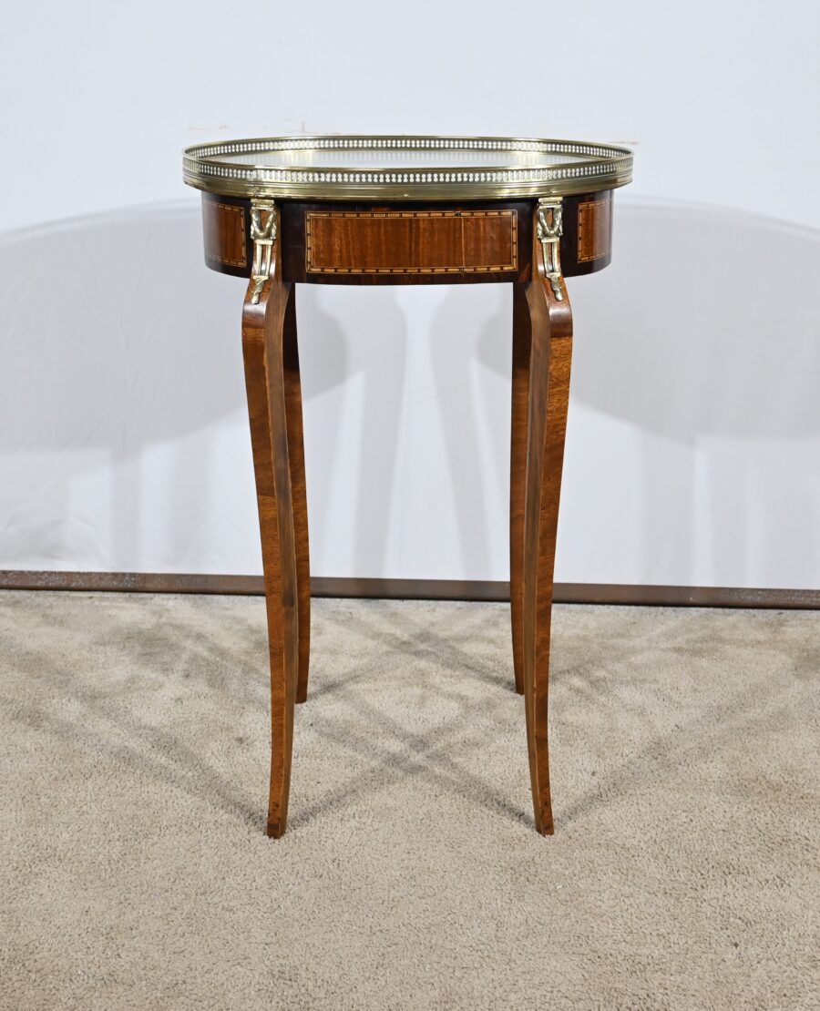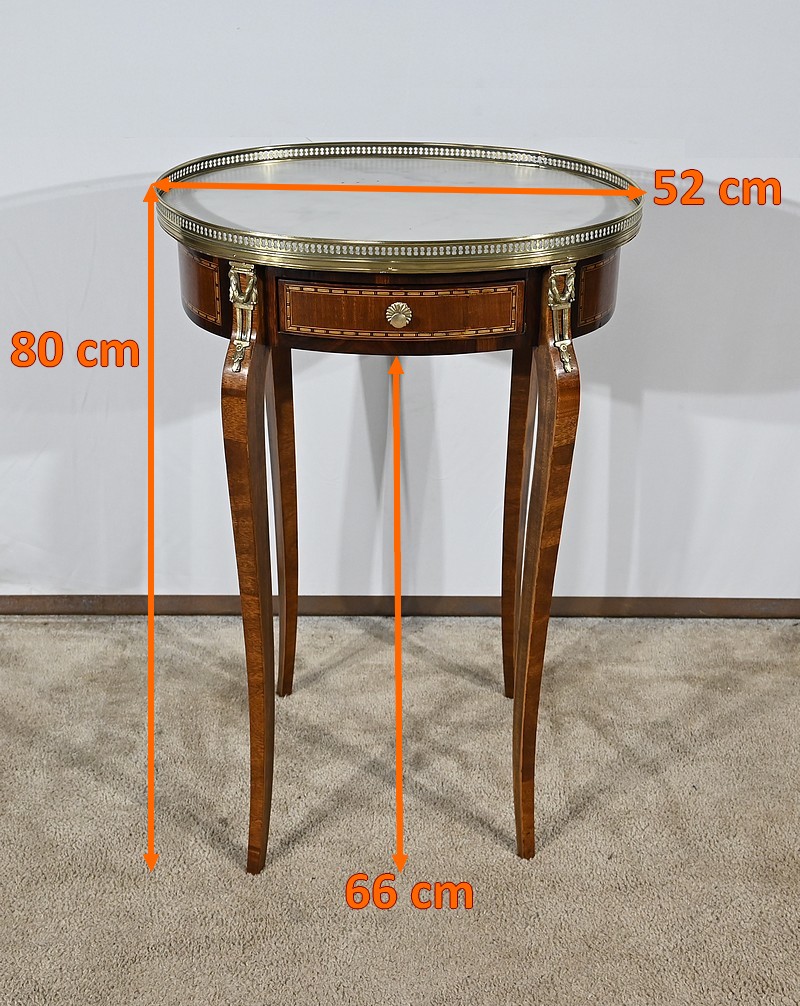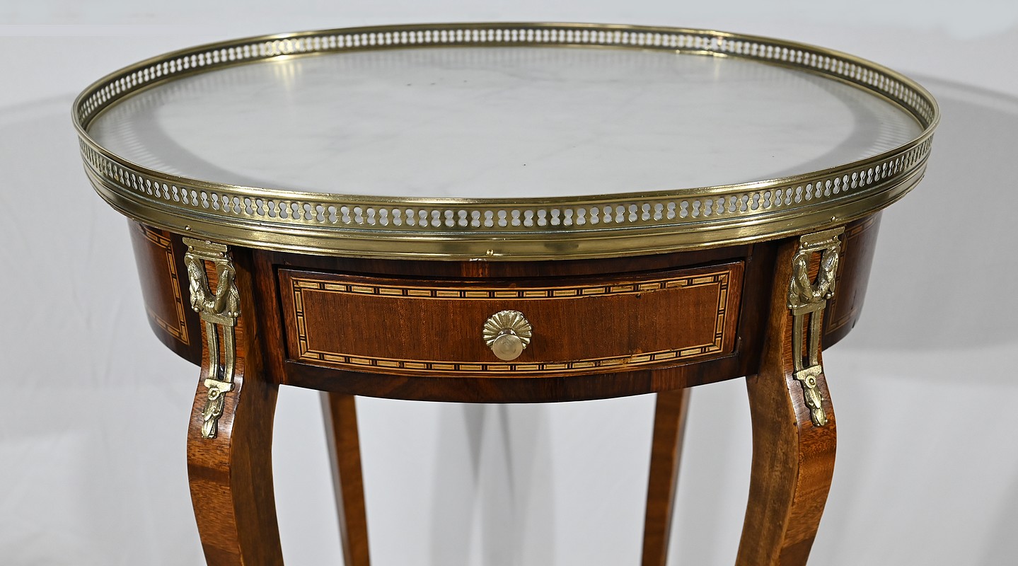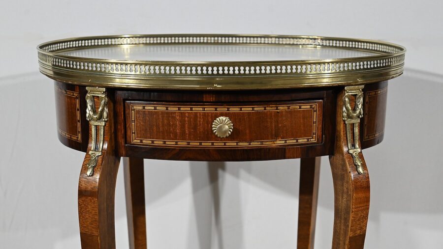 Charmante table de salon en acajou et placage d’acajou, de forme ovale et possédant un tiroir en ceinture. La façade est incrustée d’une composition de filets alternant plusieurs essences de bois en forme de rectangle. Un bouton de tirage avec rosace orne la façade. Les côtés et l’arrière de ce petit meuble sont constitués de la même marqueterie de bois précieux. Ce meuble repose sur quatre pieds à bosse légèrement en coup de fouet s’affinant vers le bas et garni en partie haute de chutes en bronze constituées de guirlandes de feuillage. Au dessus, un marbre blanc de Carrare est entouré d’une élégante galerie ajourée.