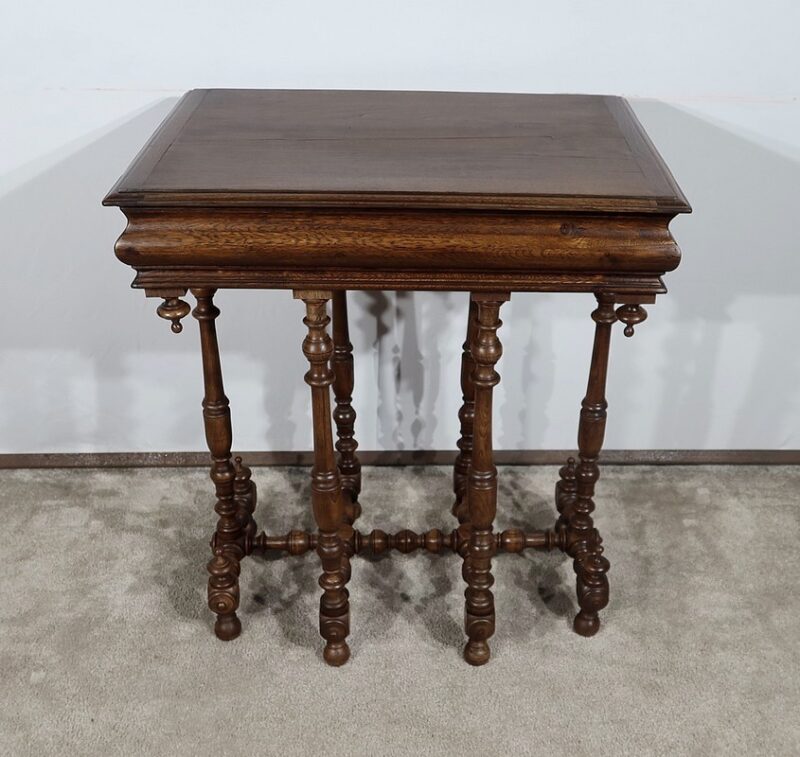 Il repose sur quatre pieds droits à section Carrée, terminés par un Tournage. Ils sont reliés par paire par des traverses formant une entretoise en croix, qui finit de rassurer sur la Stabilité de l’ensemble.
